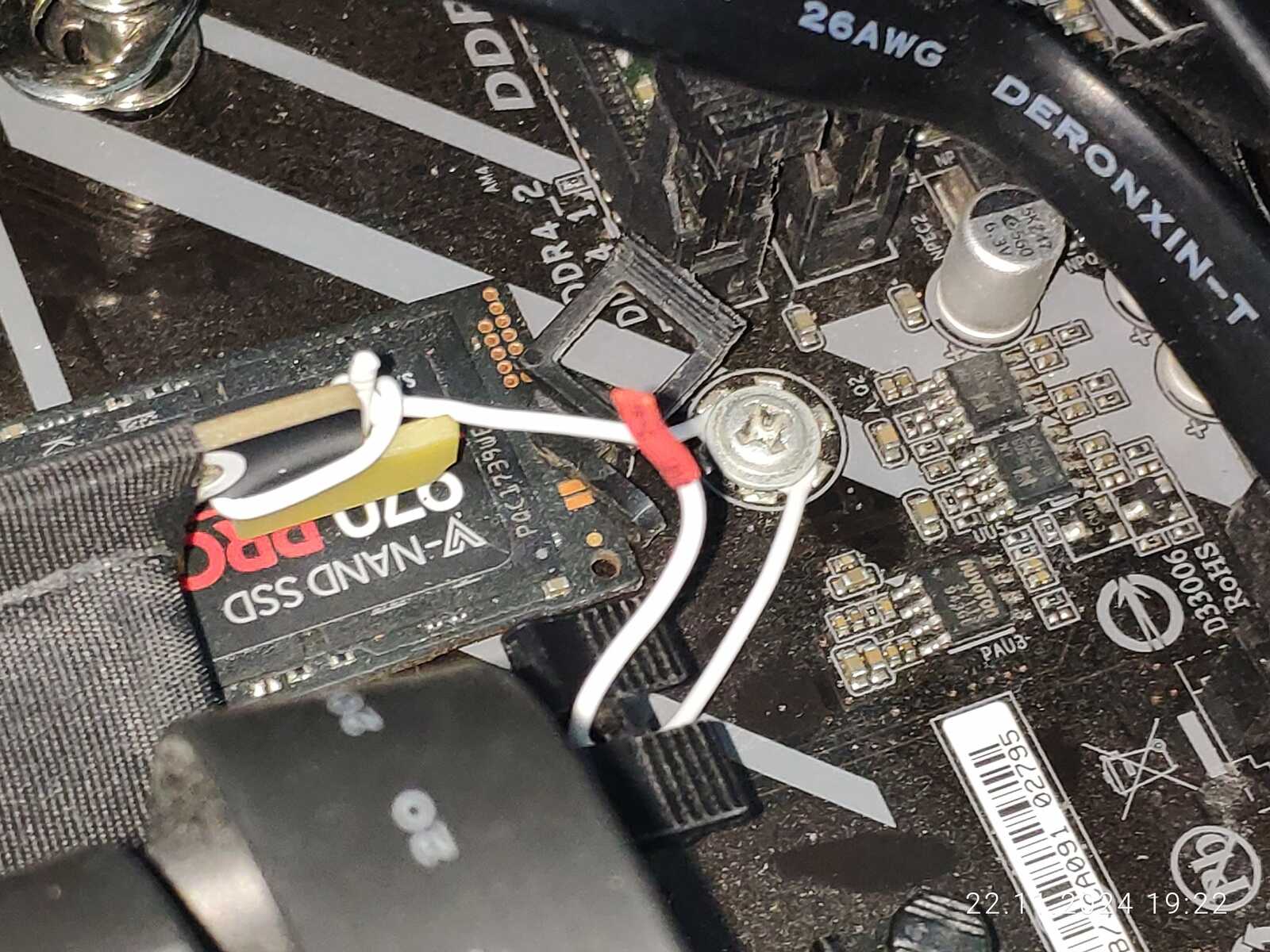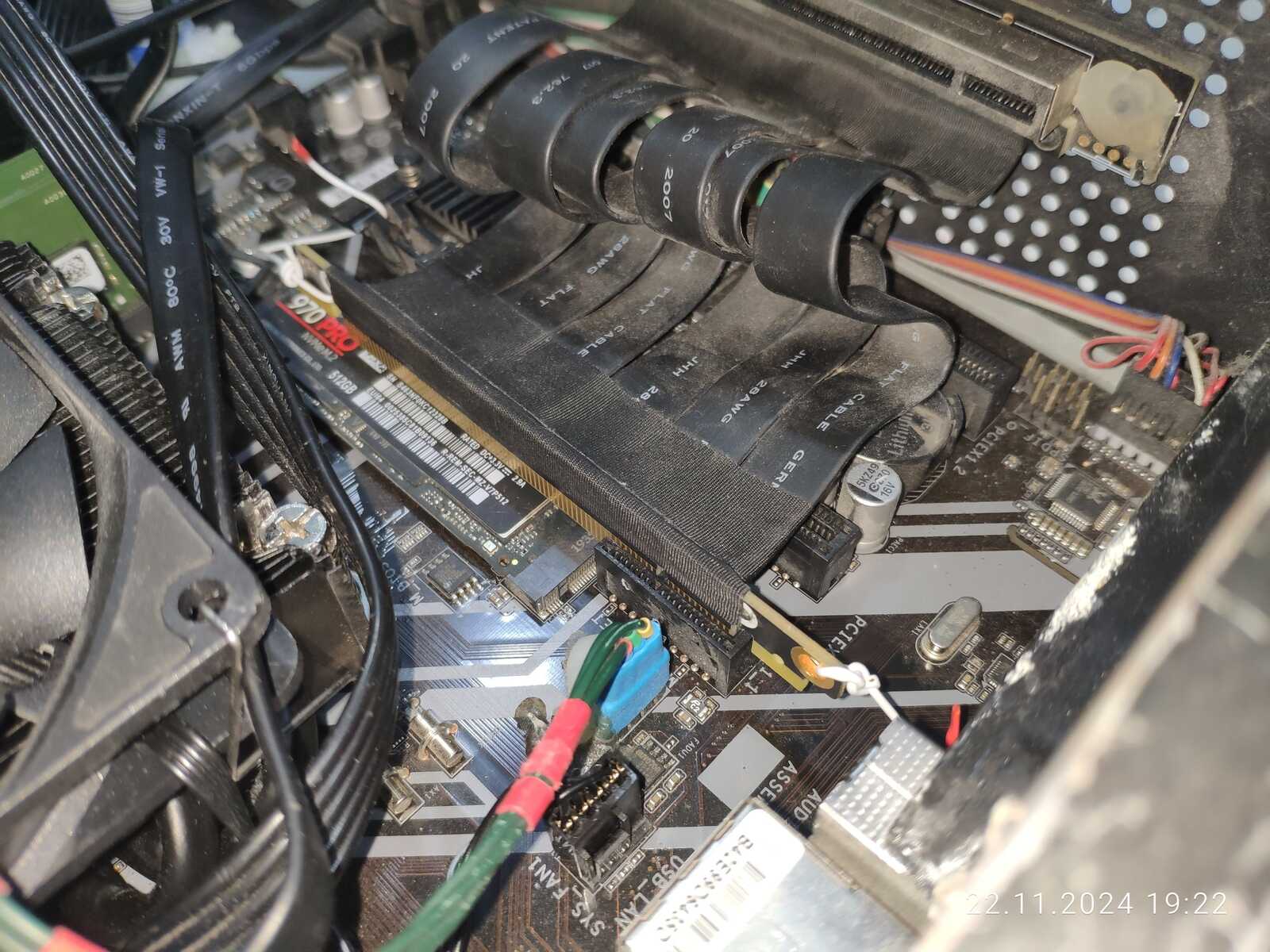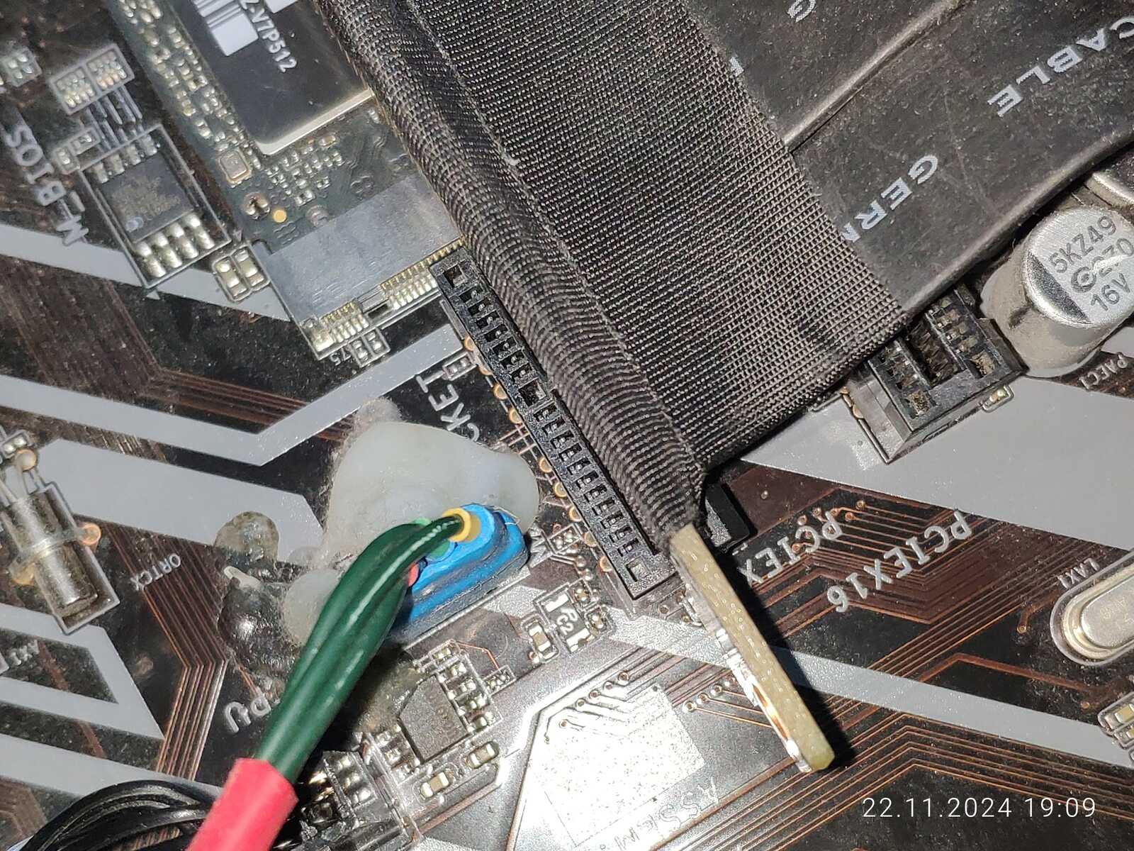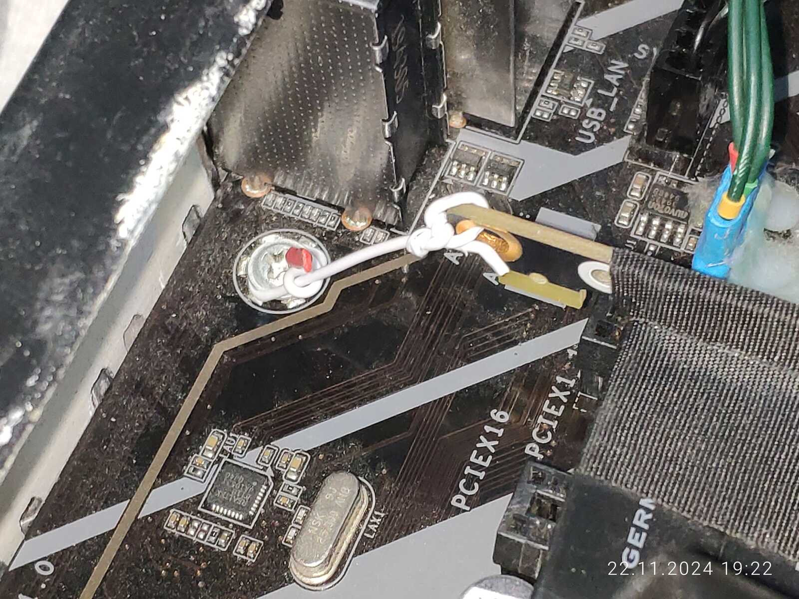 Райзер нужно закрепить в гнезде, но креплений никаких нет, потому импровизирую при помощи многожильного, весьма прочного провода, не забываю про изоляцию обрезанных концов, мне не нужны сюрпризы со временем: