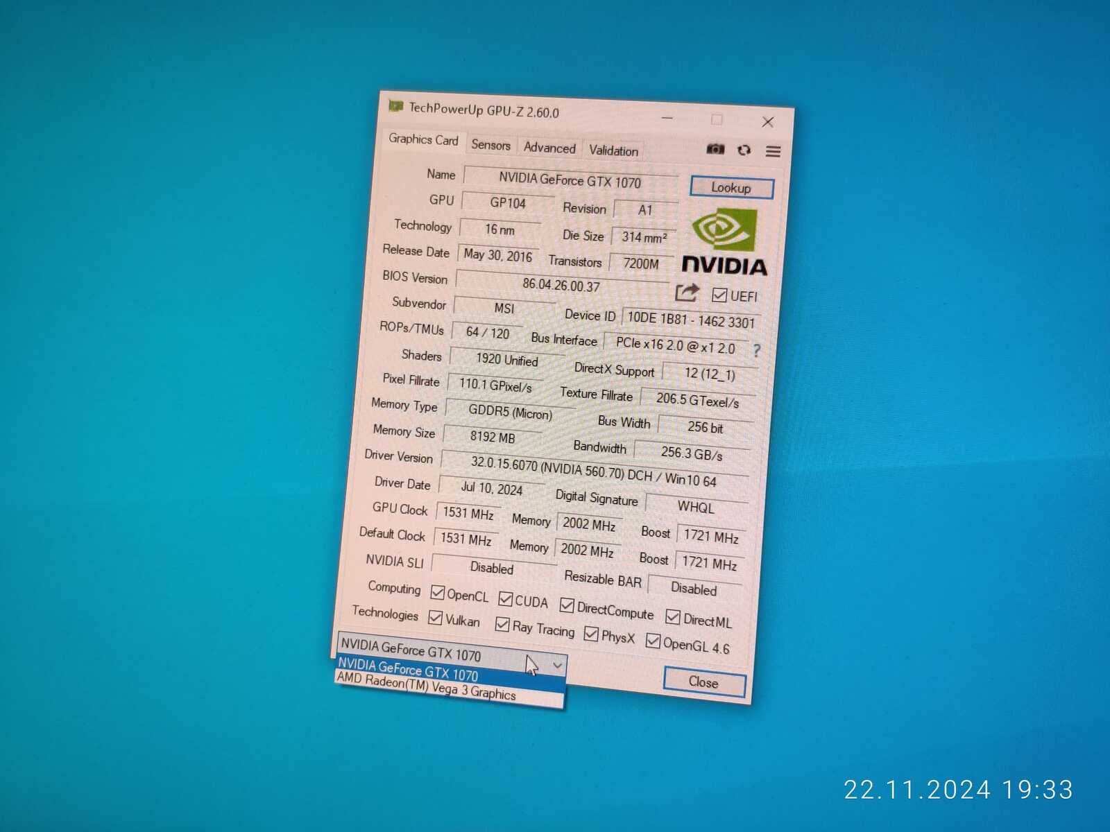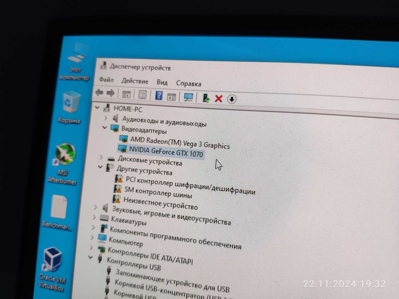 Подключаю монитор к Vega 3, и да, диспетчер устройств видит GeForce GTX 1070, хотя GPU-Z не видит, ведь она без монитора: