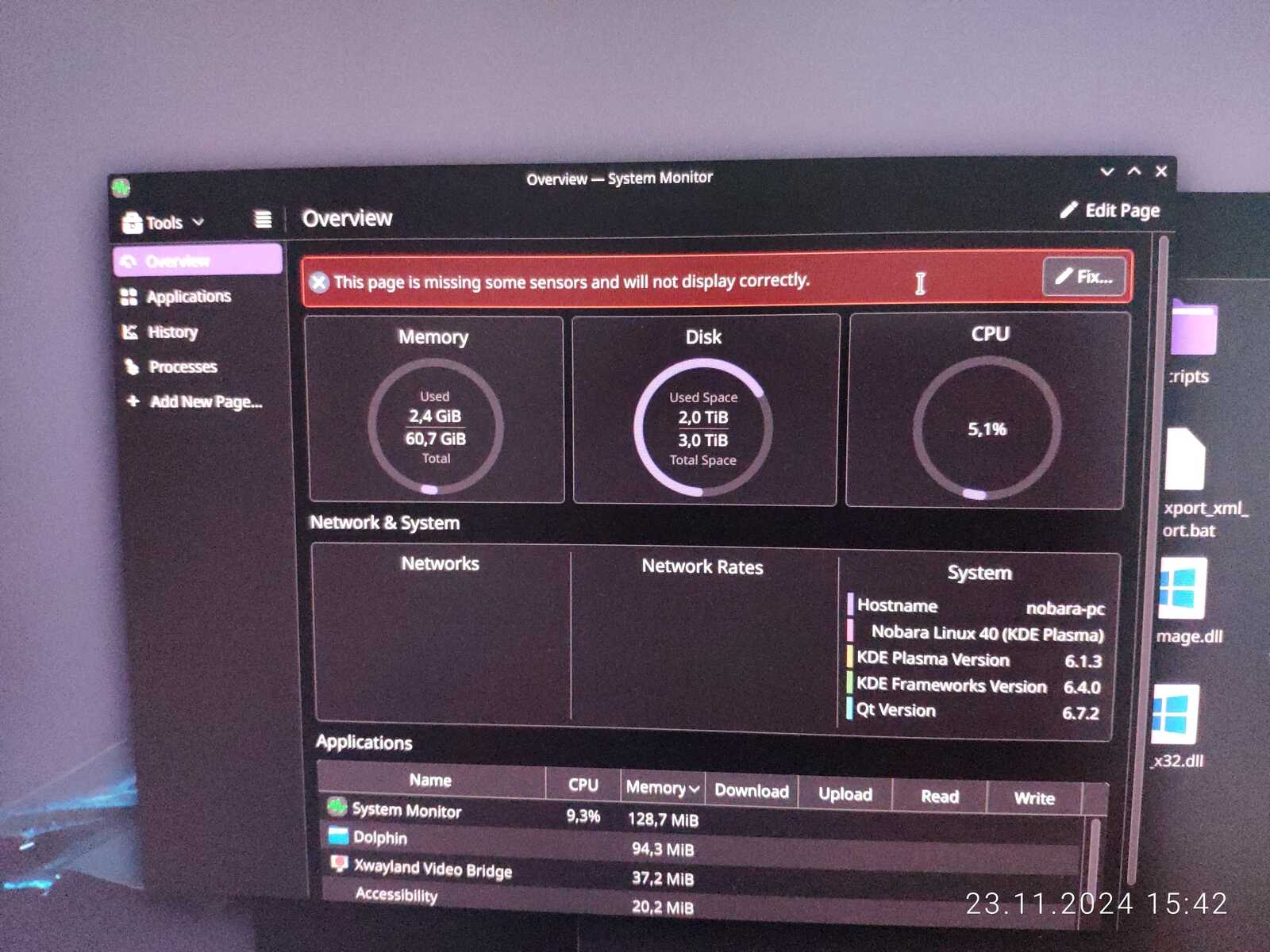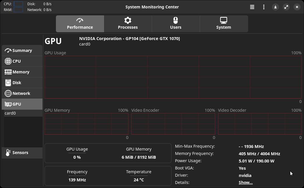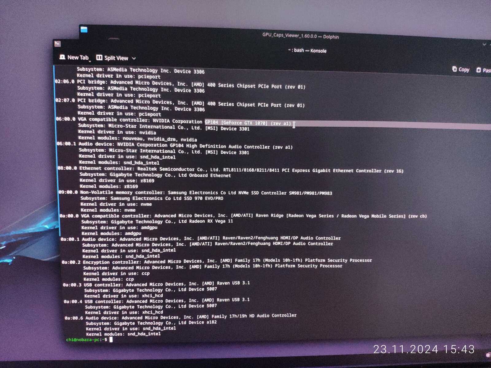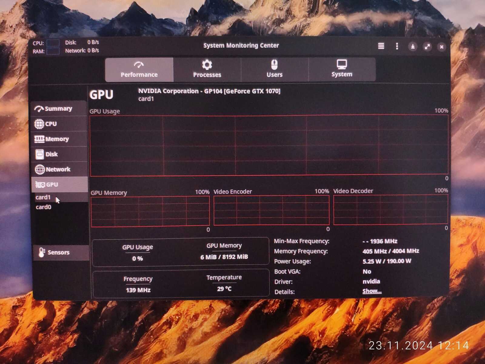 Ещё хотел посмотреть на дискретную GTX 1070, но диспетчер задач в Nobara какой-то дефективный, и без терминального мракобесия я ничего не нашёл связанного с GeForce, даже в этом плане Nobara оказалась хуже Chimbalix: