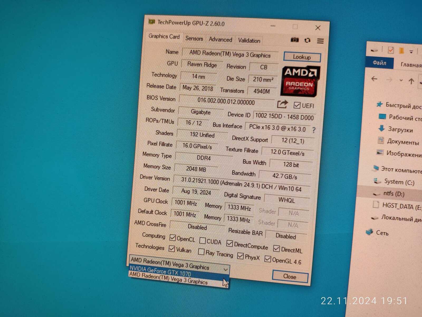 Но стоило принудительно включить Vega 3 в процессоре, как монитор подключенный к GTX 1070 перестал работать, неприятно однако, но нужно проверить в операционной системе: