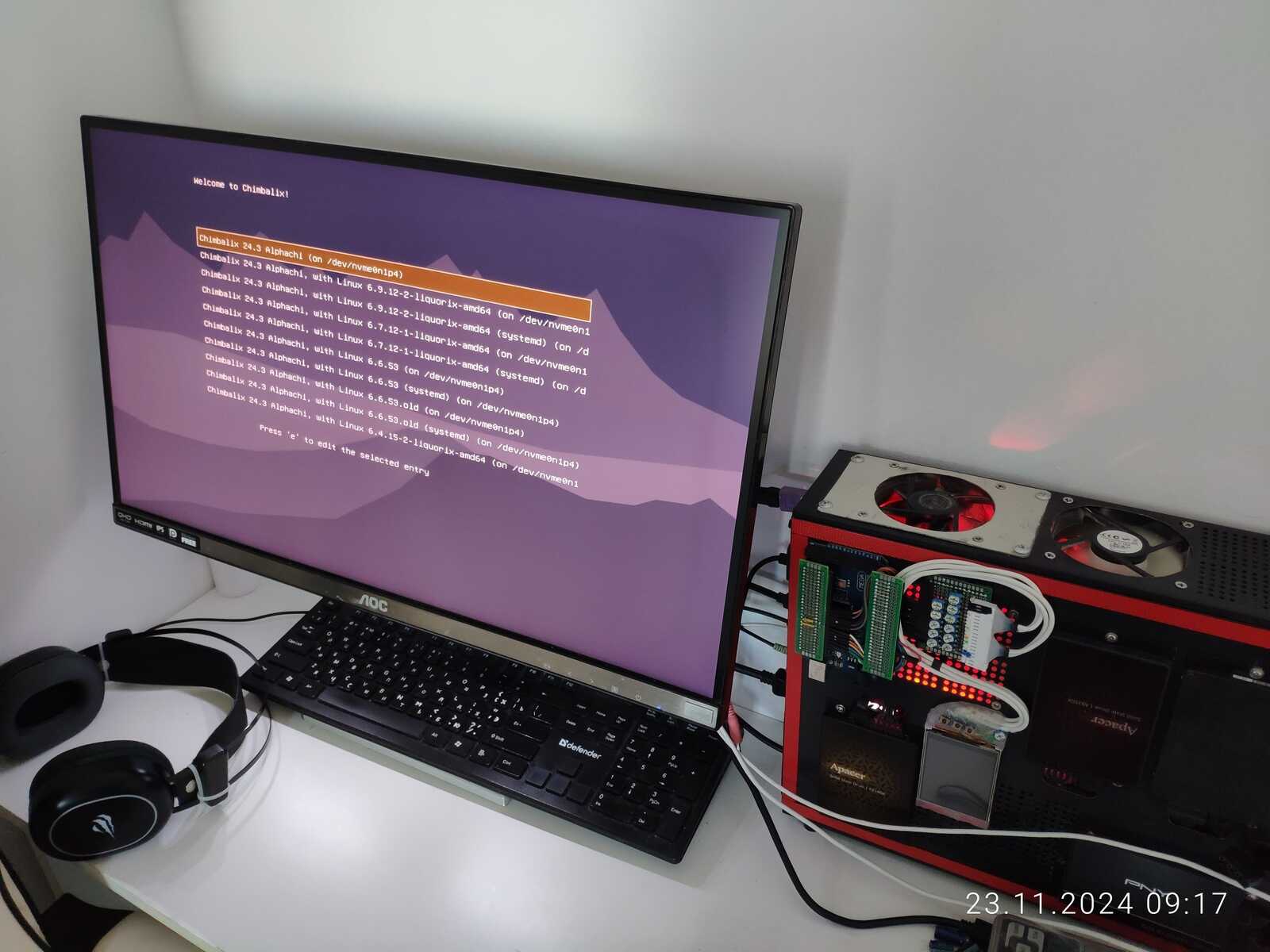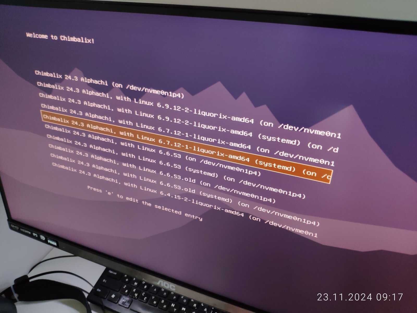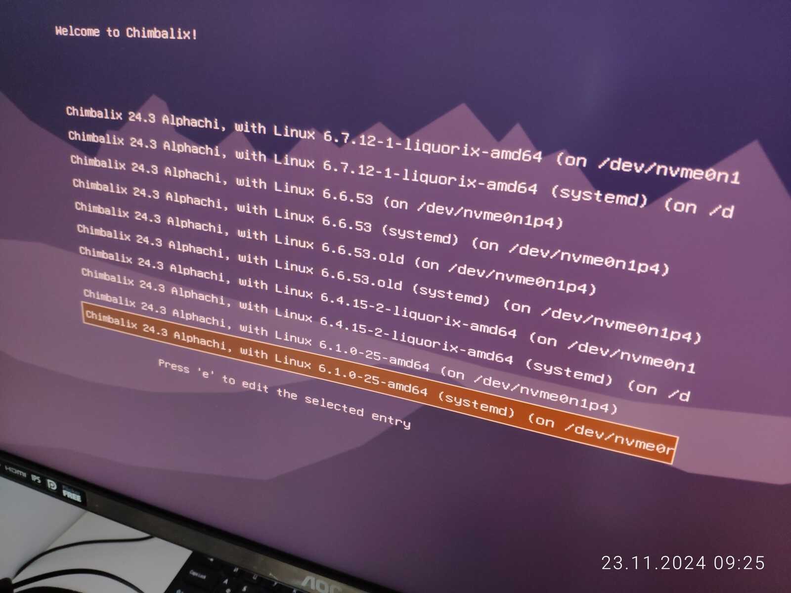 Но есть и примечательный момент, в загрузочном меню появились все установленные ядра Linux, вероятно это потому, что я на всякий случай переустановил уже старый и побитый экспериментами второстепенный линукс первого раздела NVMe SSD на чистый Chimbalix 24.5, просто чтобы был запасной вариант всегда. И тут я понял почему ранее не обновлялось меню загрузчика при установке других ядер в основной операционной системе...