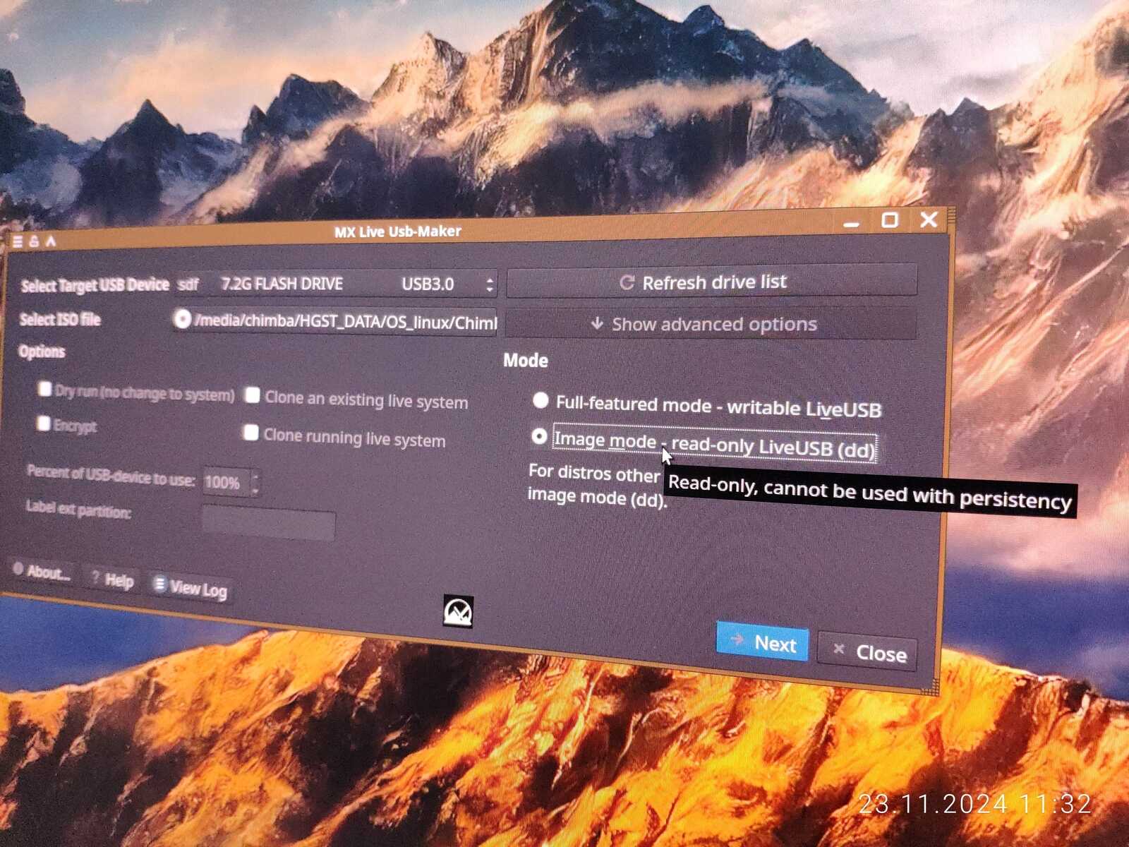 Так что у меня нет выбора - перезаписываю флешку в режиме RAW (DD), чтобы линукс не мог сохранять никакие настройки в Live-CD режиме (Live-USB):