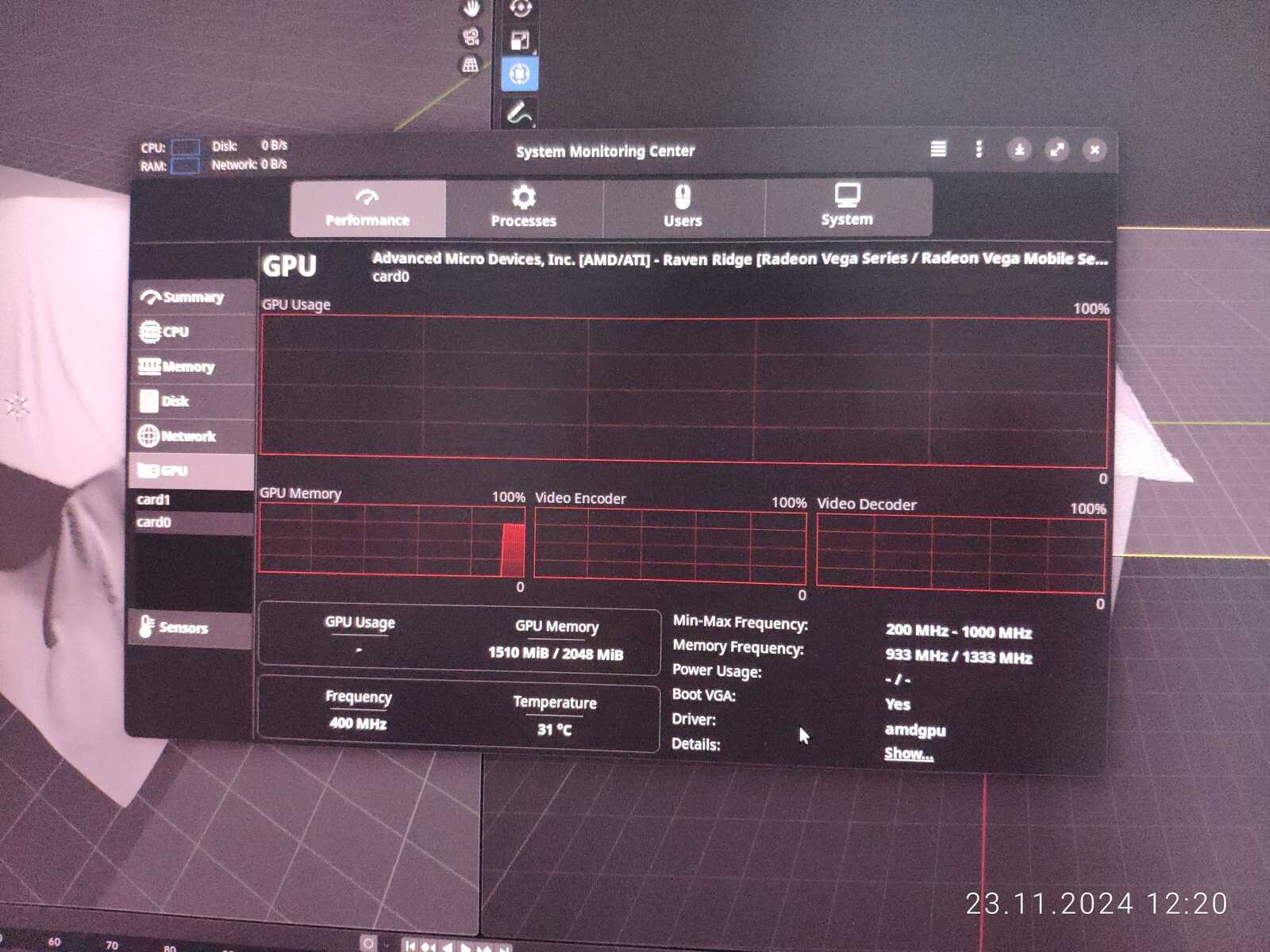 Хотя в случае Blender всё работает весьма странно, ведь за OpenGL / Vulkan и прочие API отвечает llvmpipe драйвер, ибо Mesa не подружилась с графикой AMD в давно установленном линуксе, а рисовать процессором очень медленное занятие, настолько, что GTX 1070 с "трассировками лучей" сидящая "на фоне" рендерит гораздо быстрее, чем llvmpipe рисует интерфейс программы, а Radeon выводит уже готовое изображение на монитор...