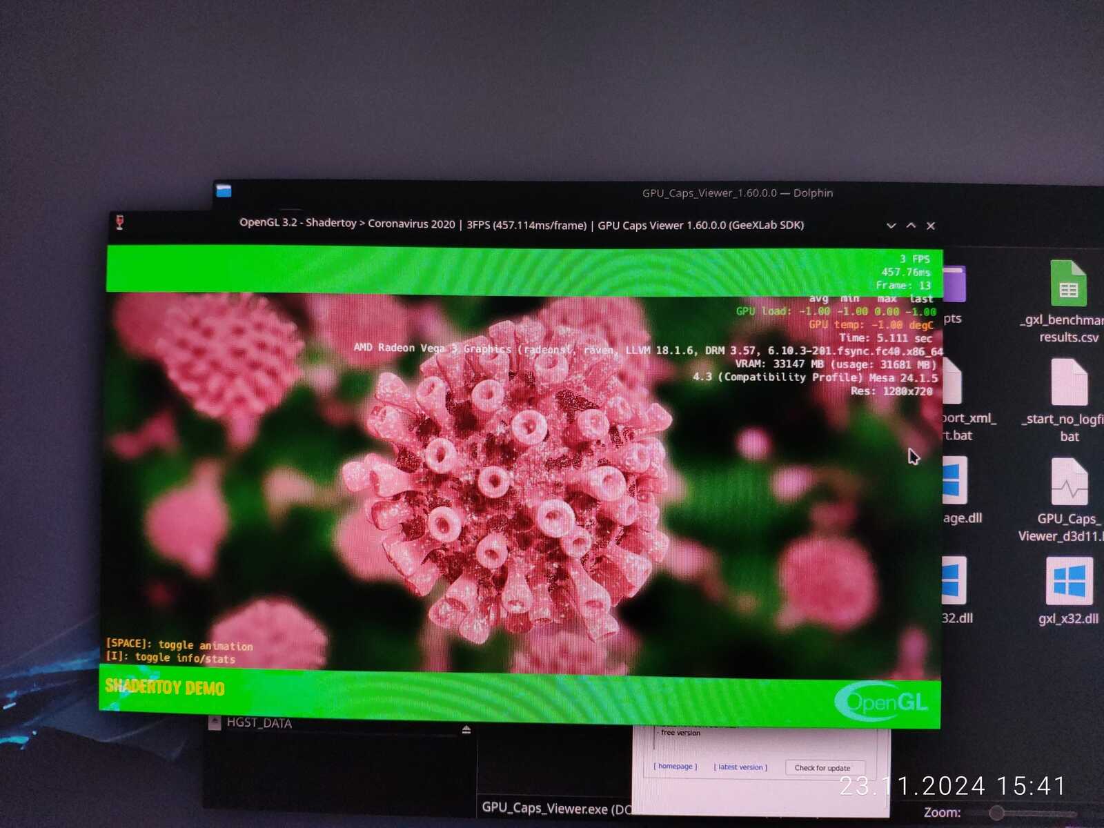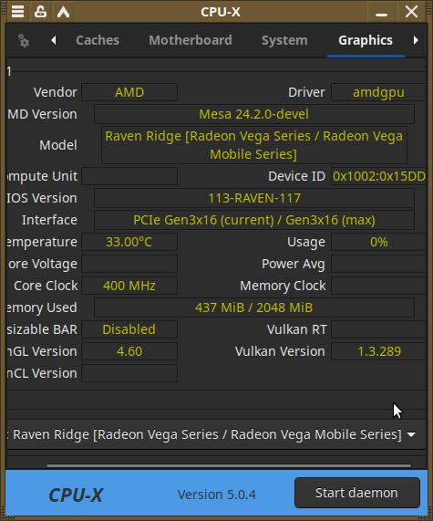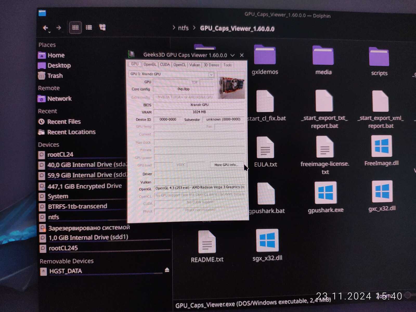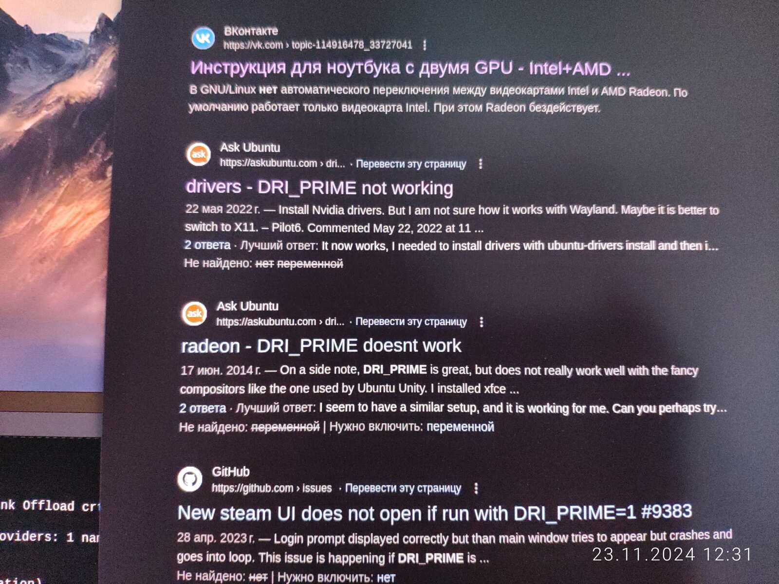 Хотя кое-что ещё изменилось, теперь явно используется Mesa 24.2 от установленного драйвера AMD, но всё равно не хочет дружить с радеоном...