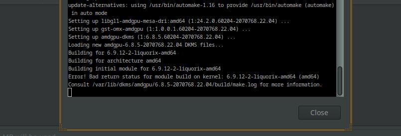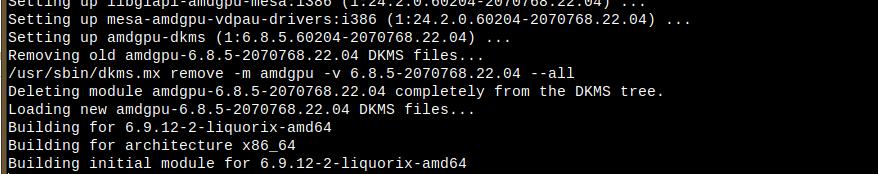 Собственно что и следовало ожидать, модули ядра не собрались полностью, эх AMD, эх сказочники линуксоиды, у которых якобы всё прекрасно при обновлении ядра с видеокартами Radeon... Какое тут "прекрасно", если модули уже в линуксе 6.9 не собираются? Хотя если присмотреться можно заметить, что модули предназначены для линукса версии 6.8.5, забавно: