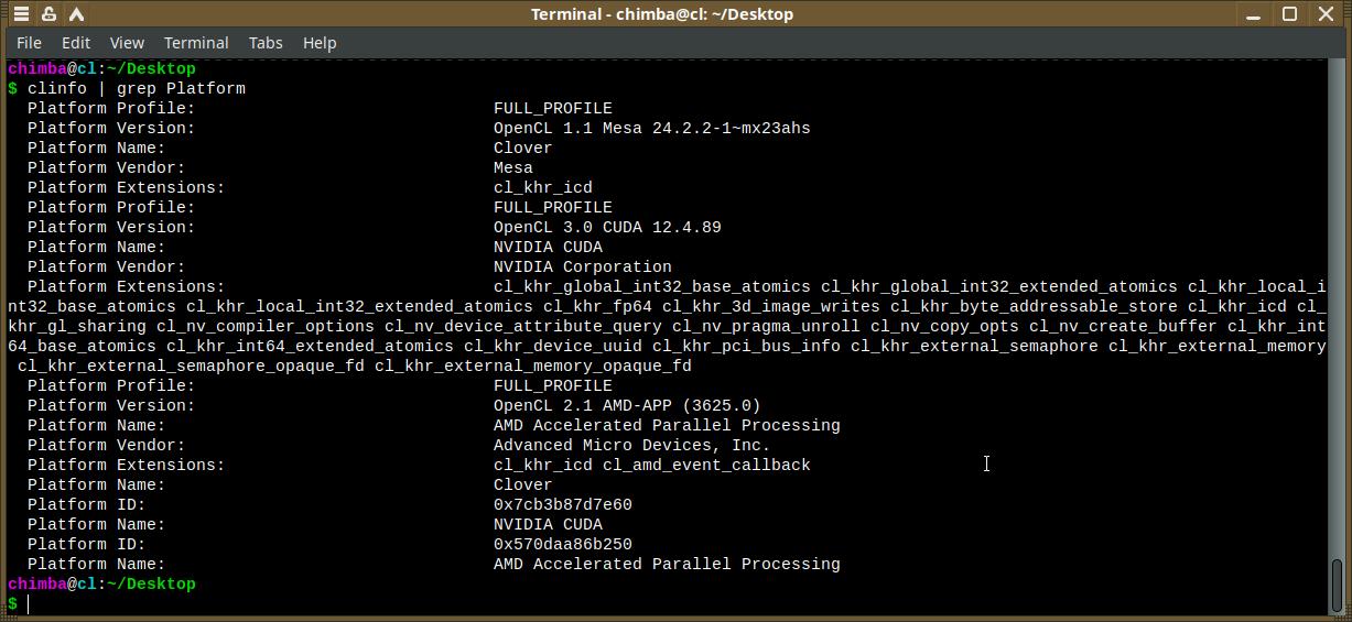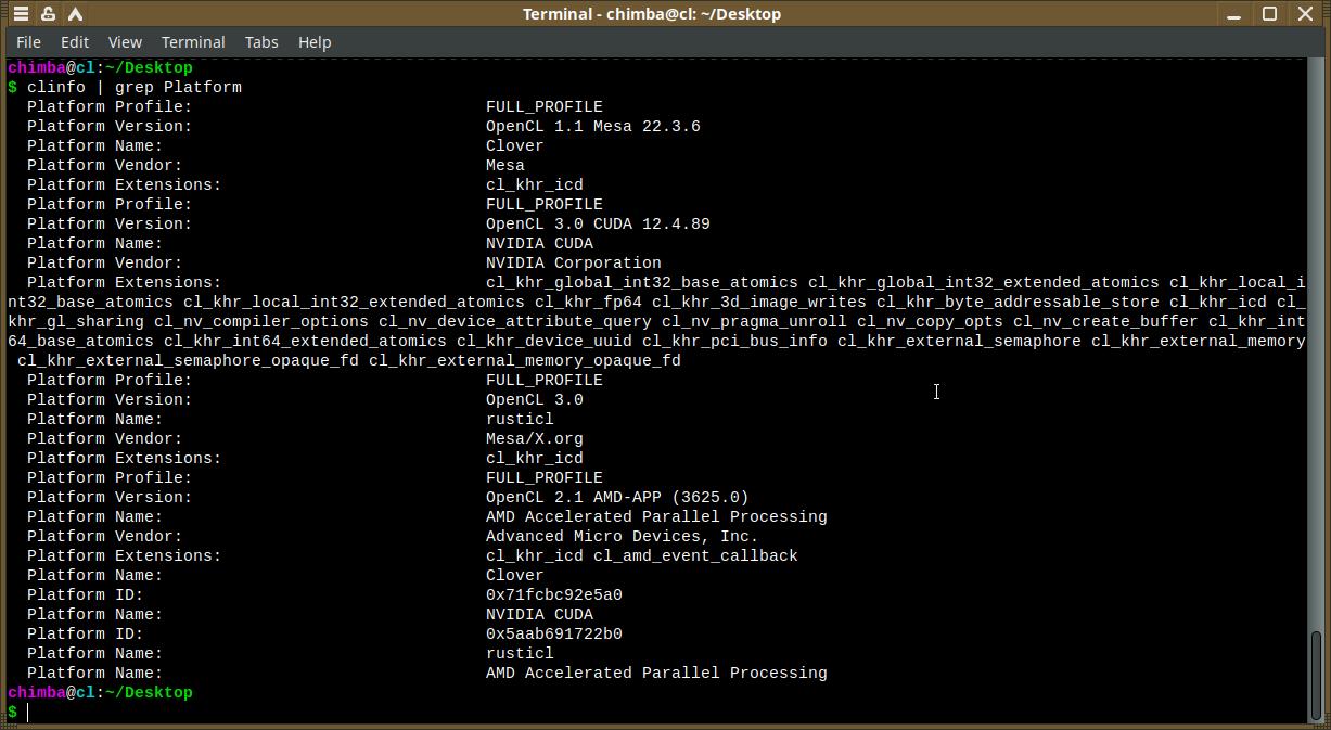 Впрочем, версия OpenCL явно не от версии пакета mesa-opencl-icd зависит, да и реальным приложениям это никак не помогает, единственная действительно функциональная видеокарта в системе это NVIDIA GeForce GTX 1070, от AMD, увы, даже OpenCL адекватного нет по сути: