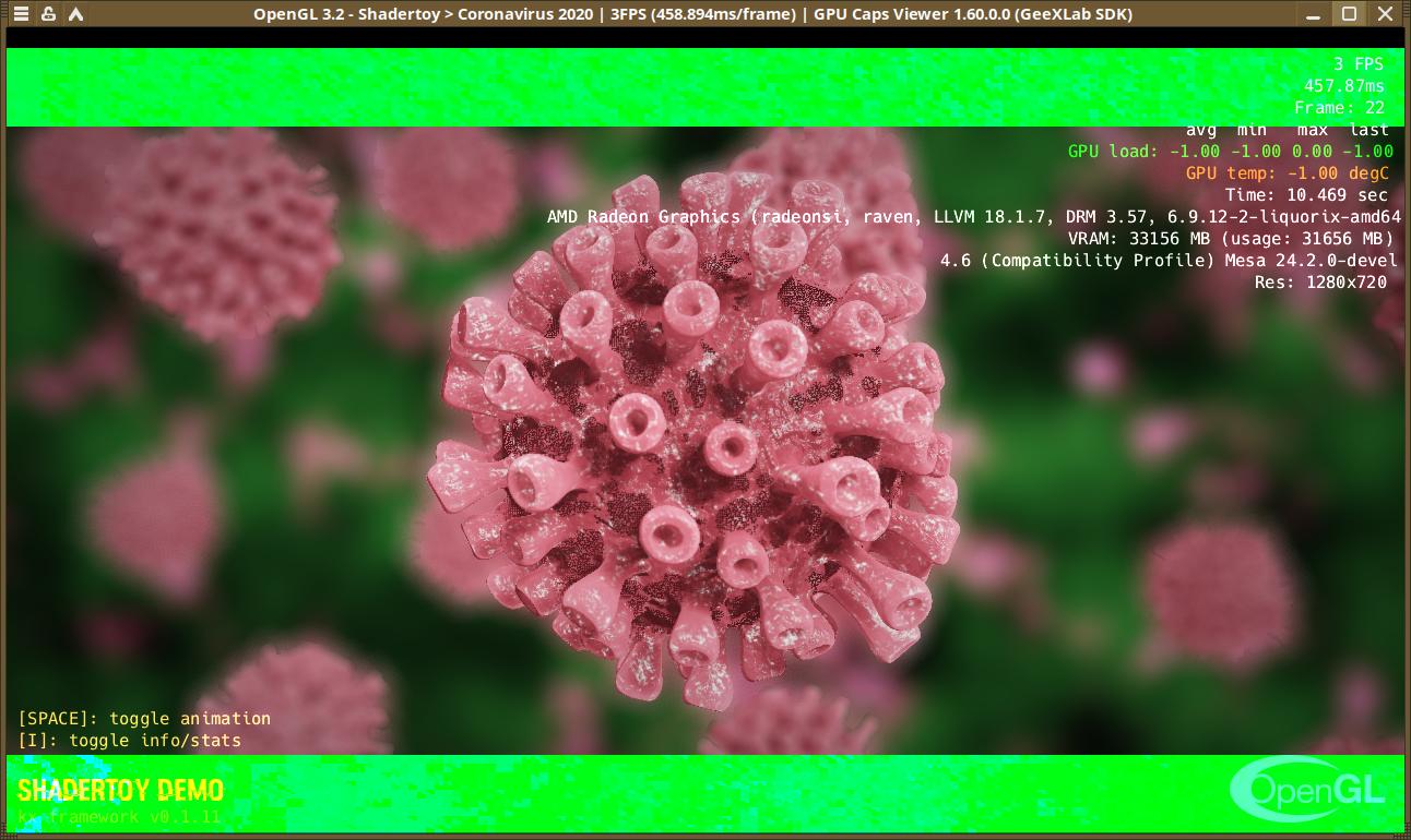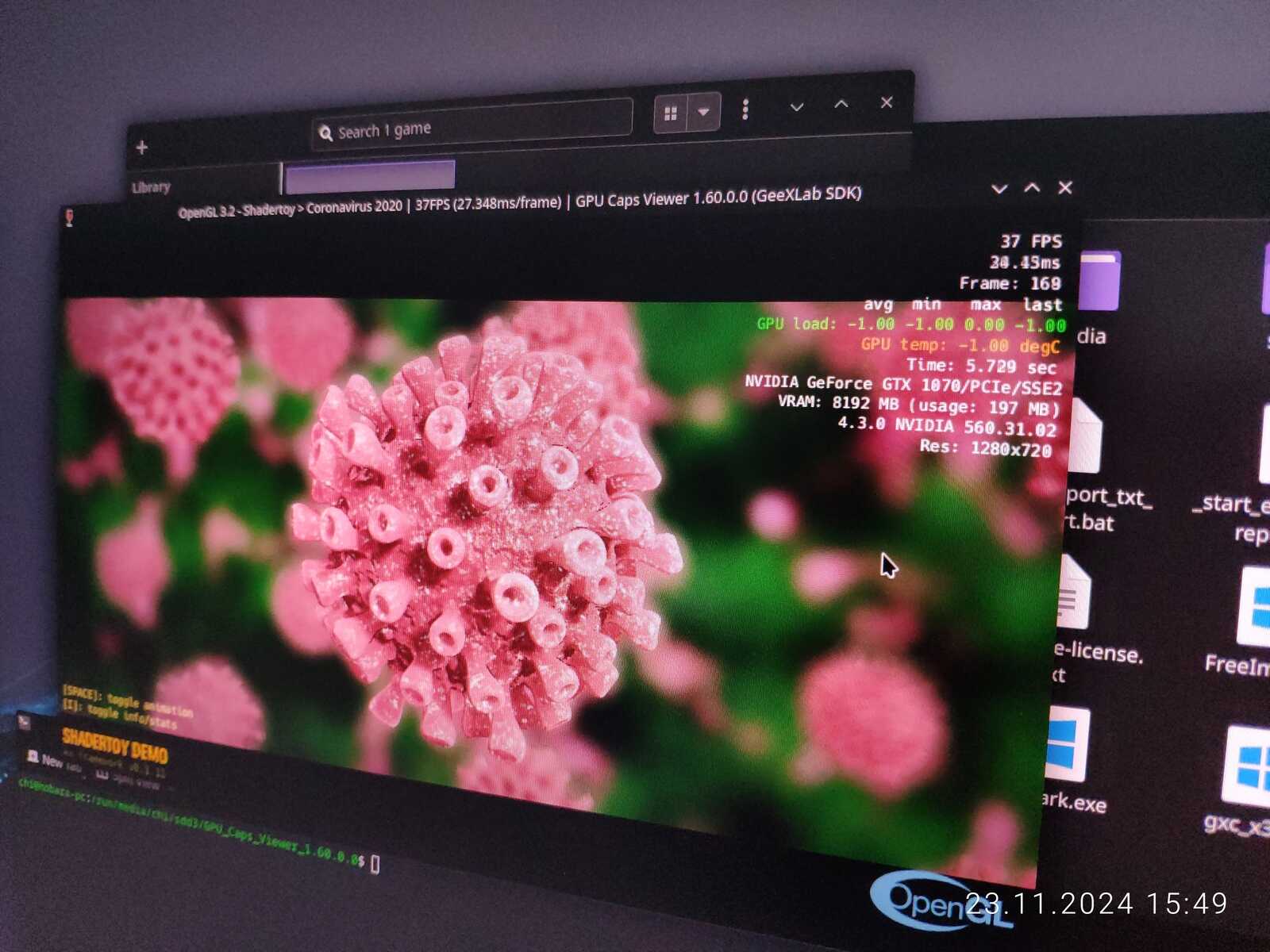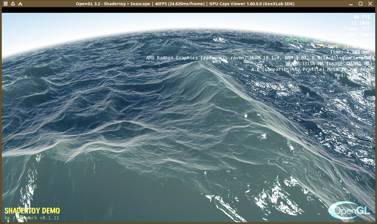 И действительно, GTX 1070 вывела картинку на монитор (DP), но проблема в том, что вся работа легла на Radeon, а она настолько плохо работает, что llvmpipe драйвер использующий ЦП был многократно быстрее, даже интерфейс тормозит, не говоря уже про использование OpenGL API...