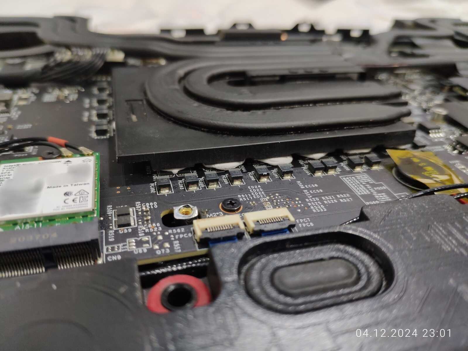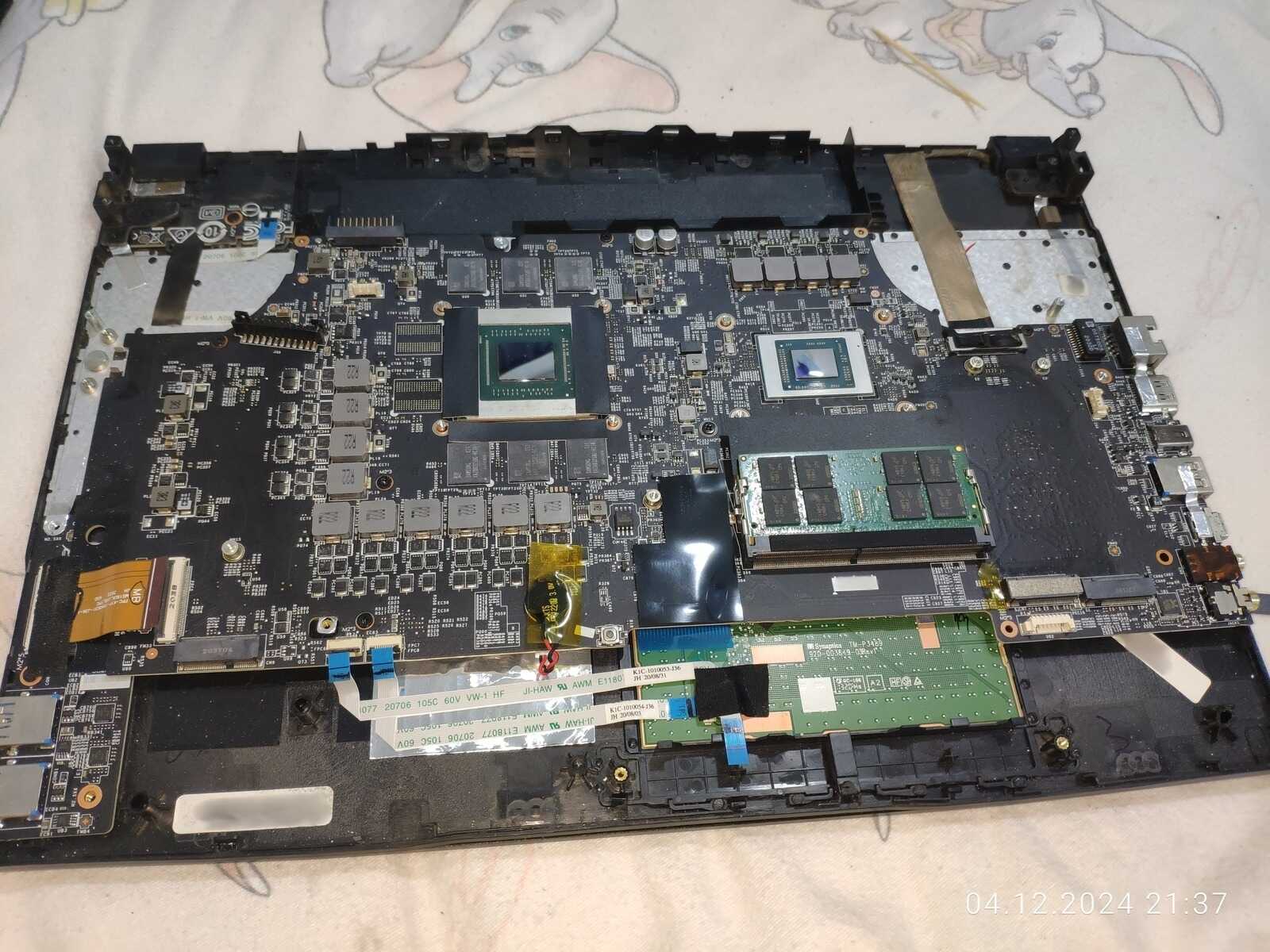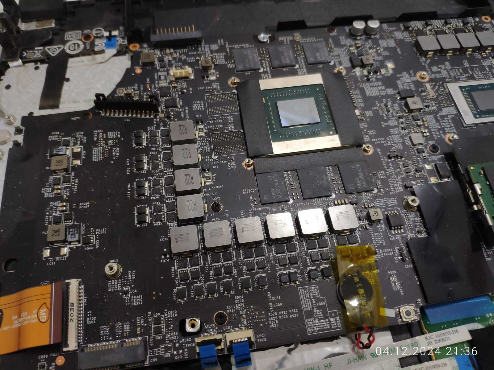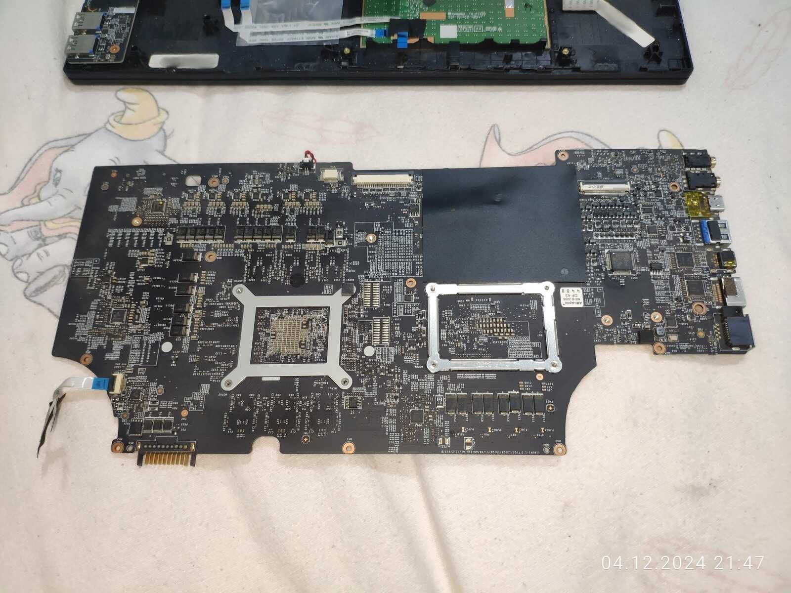 Наконец системная плата снята, да, если вдруг нужно заменить клавиатуру в MSI Alpha 15, то для этого обязательно придётся снимать системную плату, ведь держится она на модуле клавиатуры...