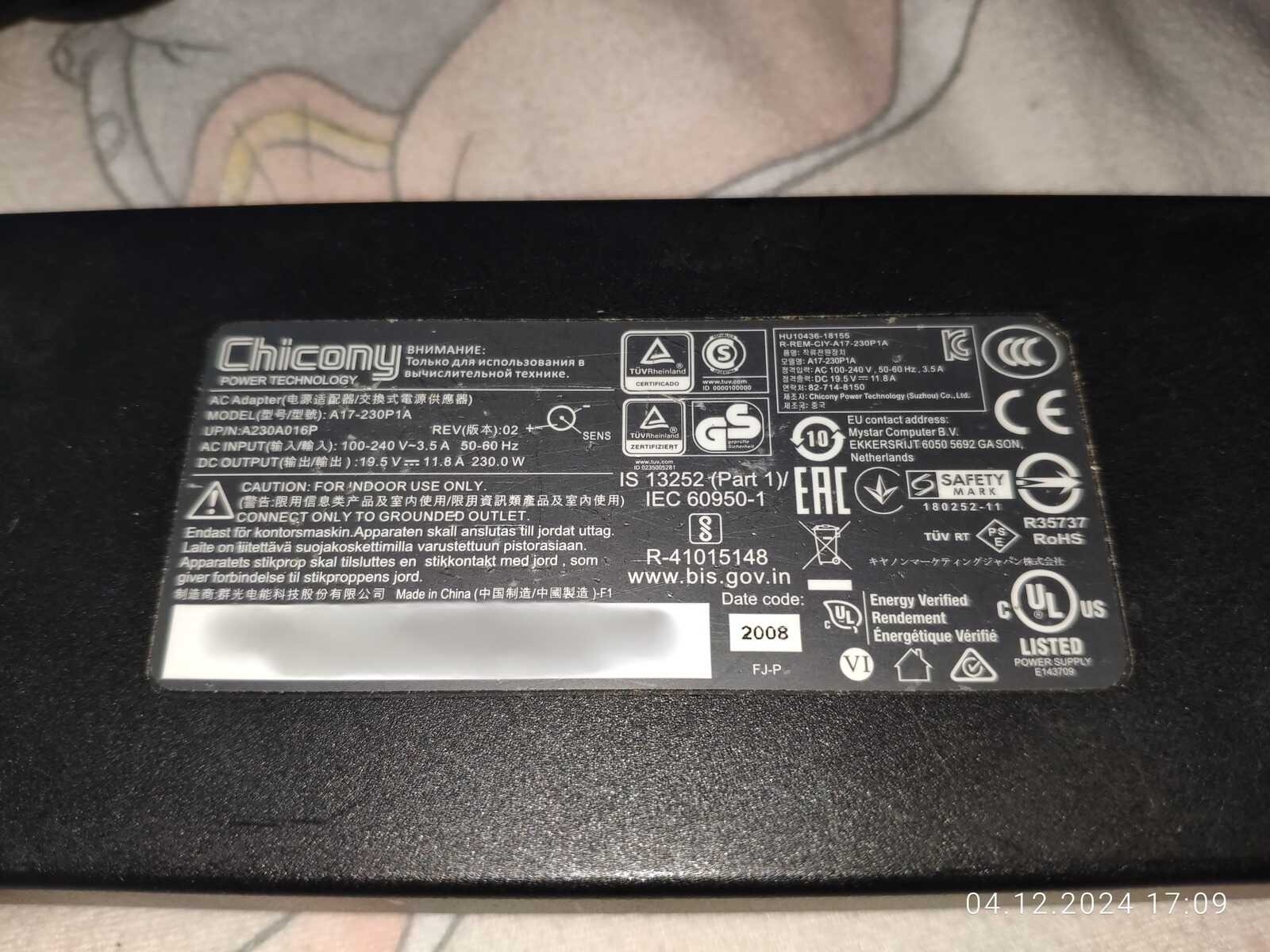 Начнём с зарядного устройства A17-230P1A, оно немного потрепалось, мощность 230 Вт.