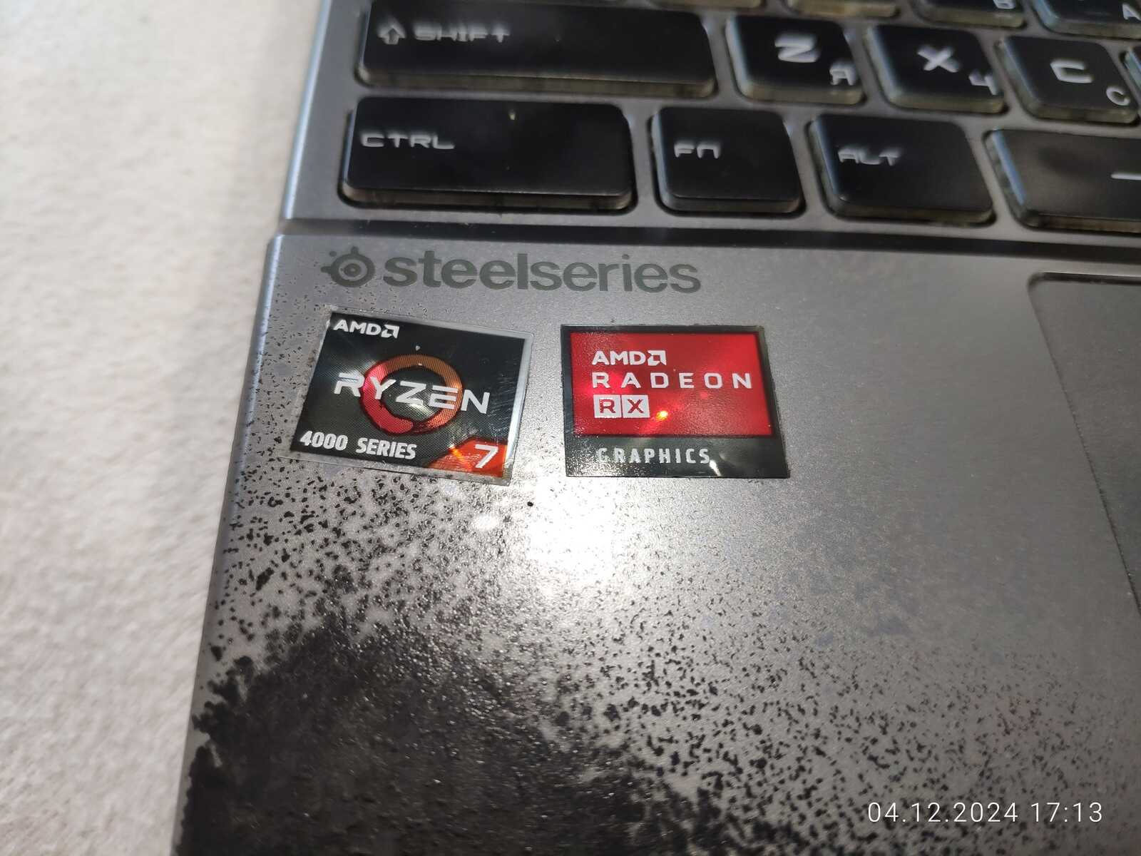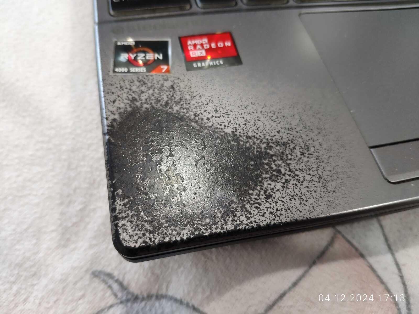 Первой бросилась в глаза зона левого нижнего угла корпуса, где обычно расположена рука, ну, тут всё очевидно без лишних слов, краска стёрлась до пластика, а ещё наклейки AMD Ryzen / Radeon поплыли.