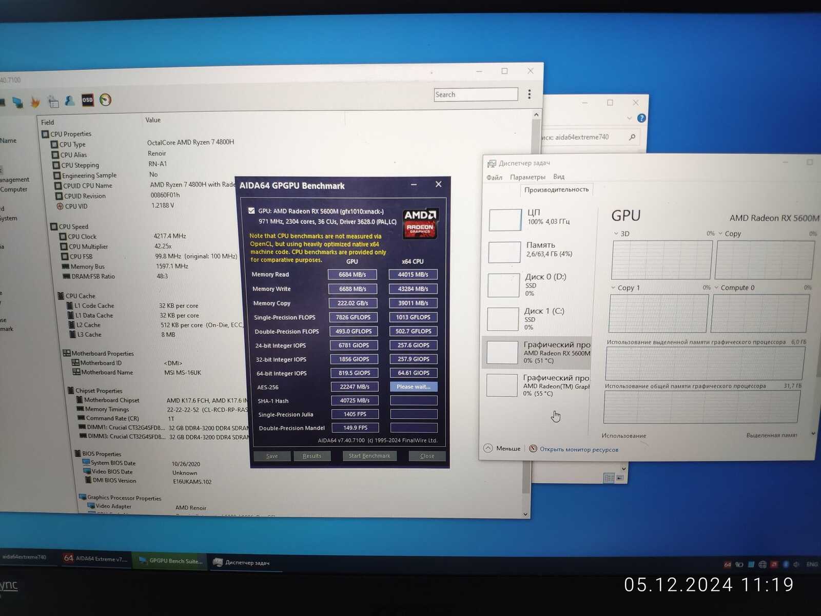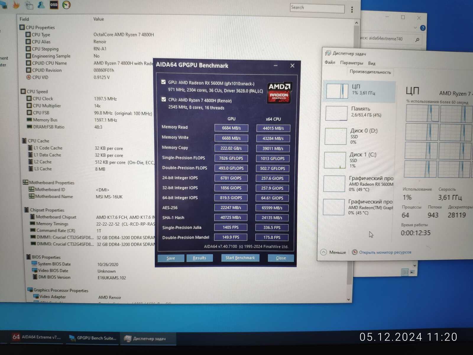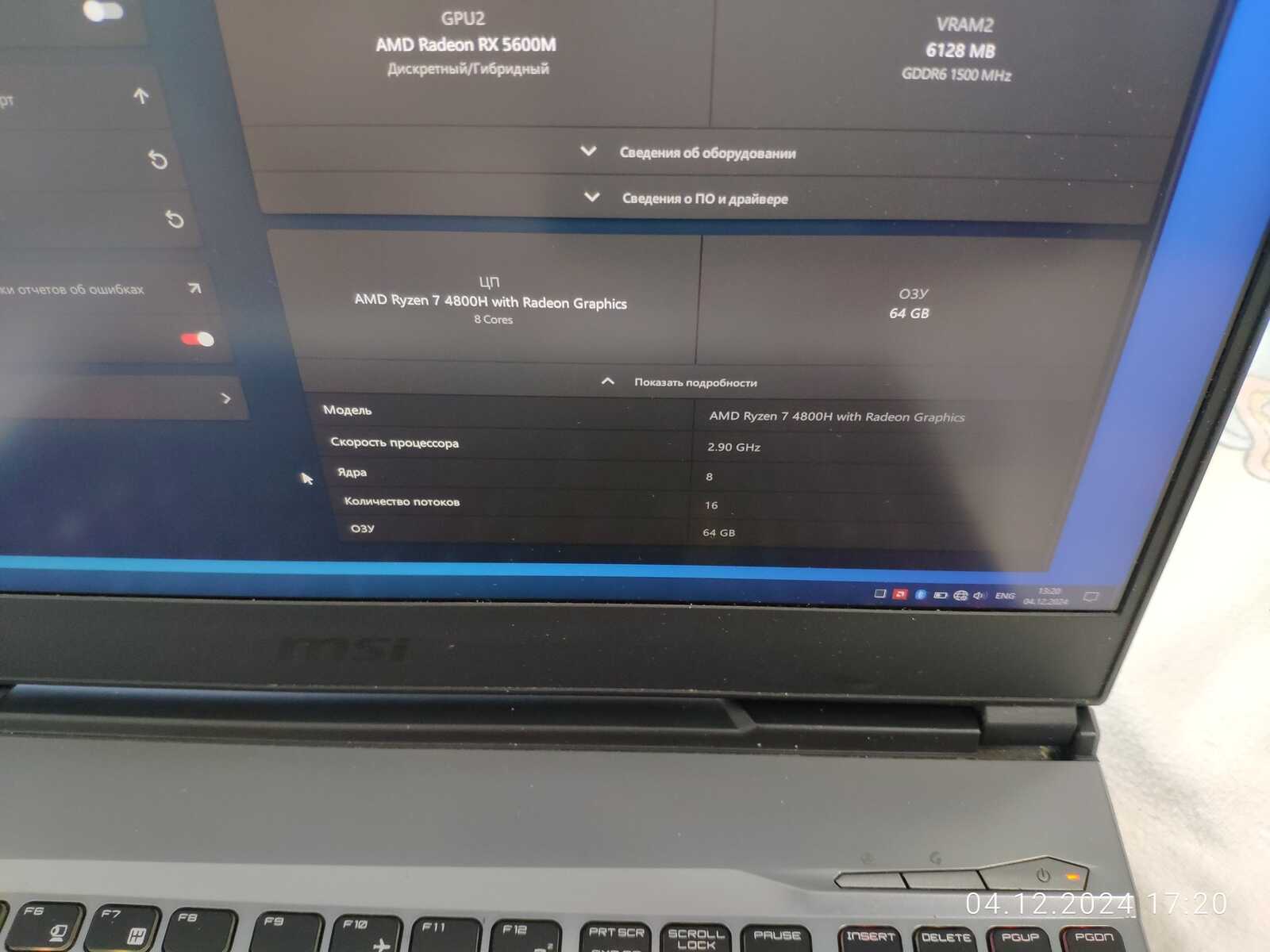 Но вернёмся к MSI Alpha 15 (A4DEK-011RU-BSAR748H16GXXDX10SA, MS-16UK), данный ноутбук основан на процессоре Ryzen 7 4800H, так же имеет дискретную графику Radeon RX 5600M 6 ГБ, стандартные 16 ГБ ОЗУ были непригодны не то что для работы, но и для игр, потому заменены на 64 ГБ двумя модулями по 32 ГБ каждый.