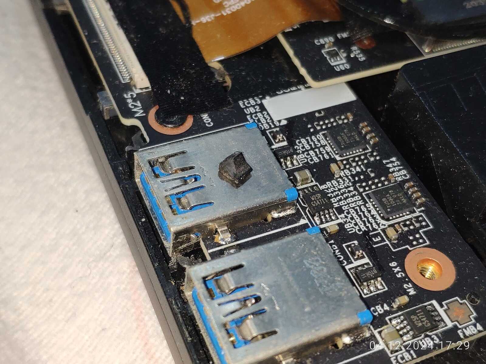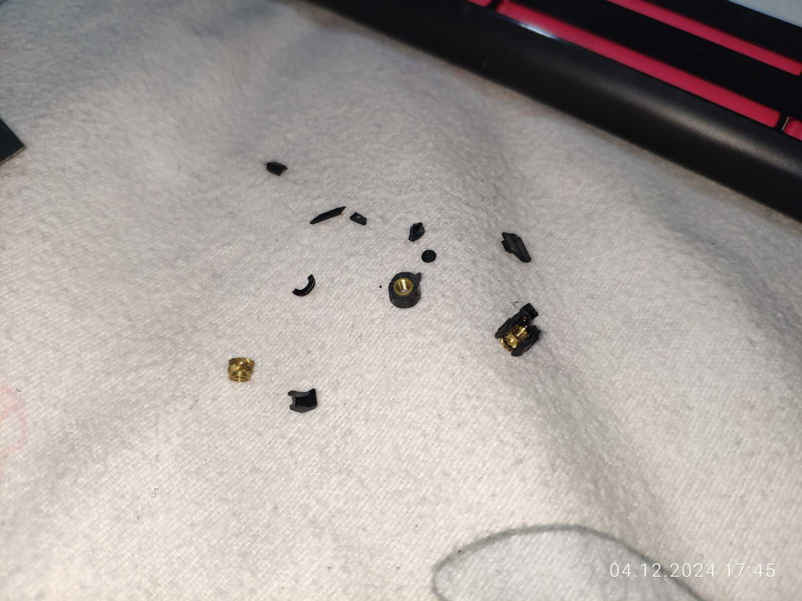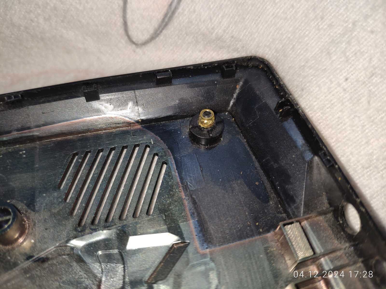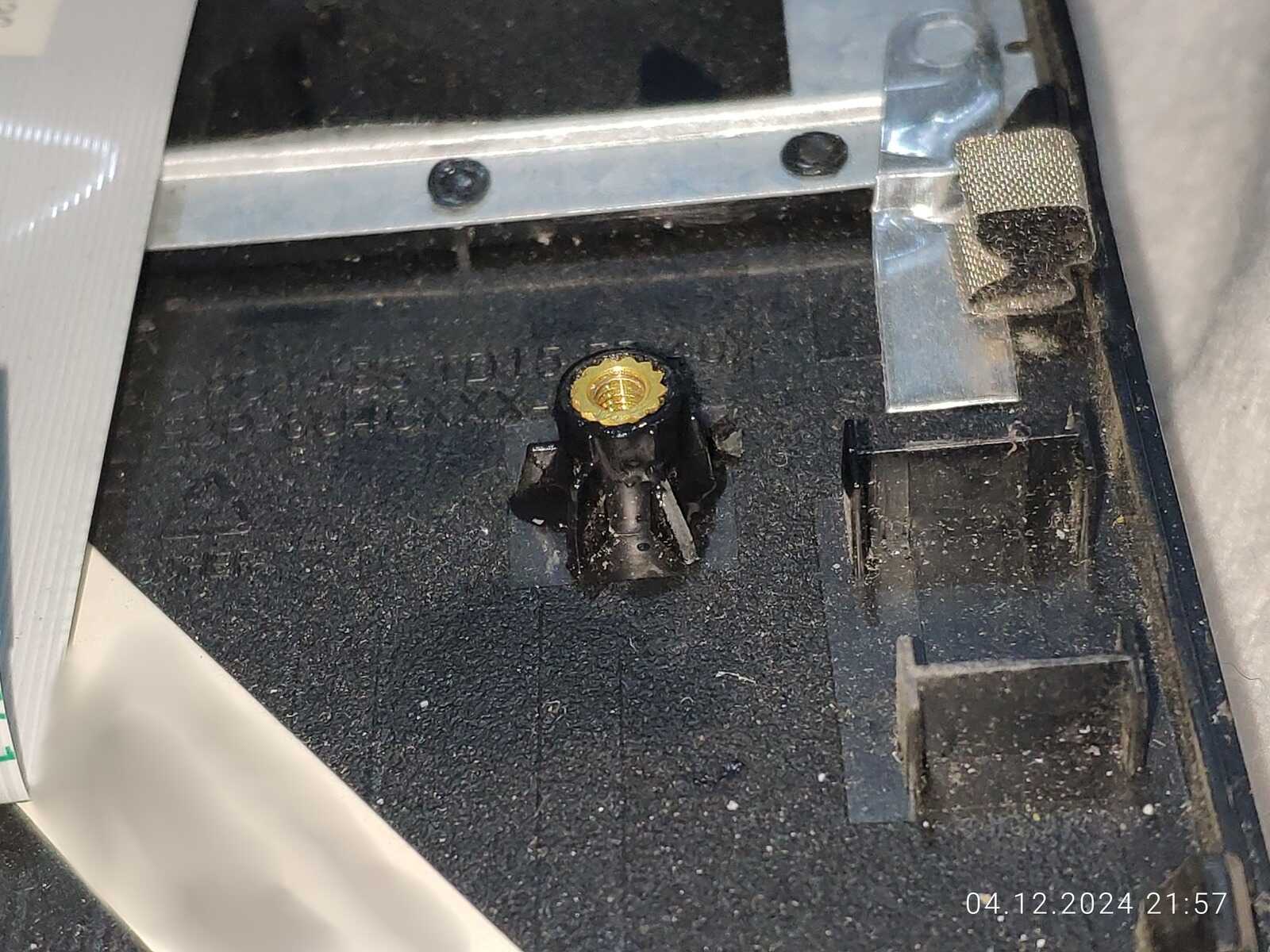Но вернёмся к "барахлу", тут видим отвалившиеся латунные втулки и куски пластика по всему ноутбуку...