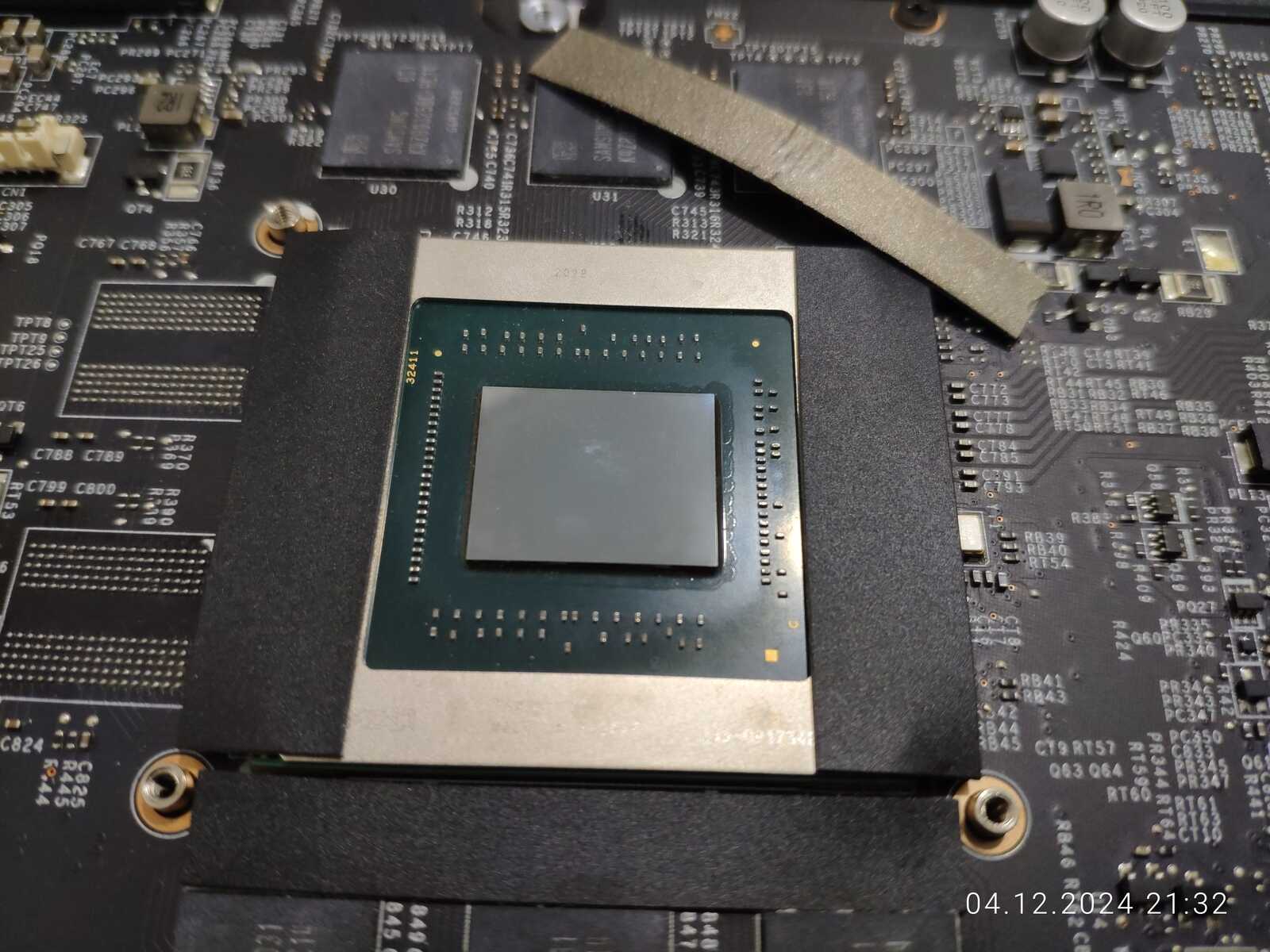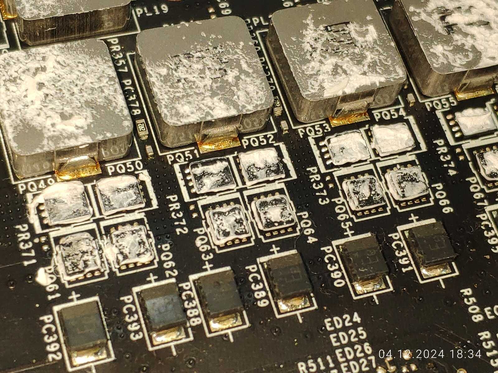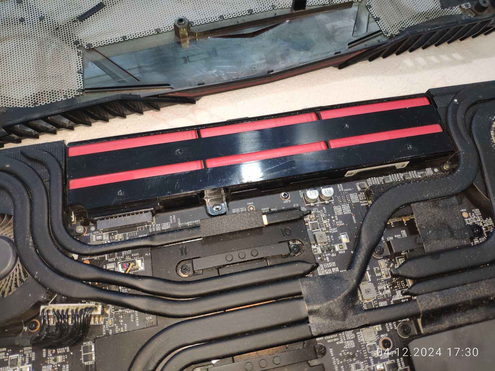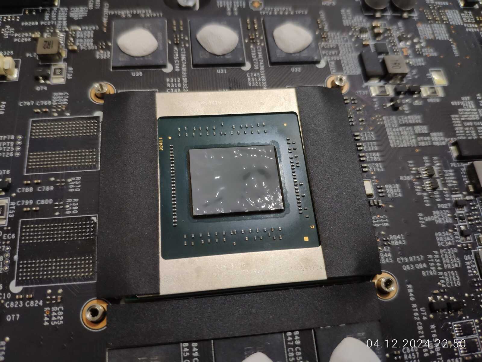 Заводское нанесение жидких прокладок тоже вызывает много вопросов, некоторые чипы памяти не охлаждались, ибо жидкие прокладки явно были раздавлены перекосом при установке системы охлаждения, от чего образовались пещеры между чипами и радиатором...