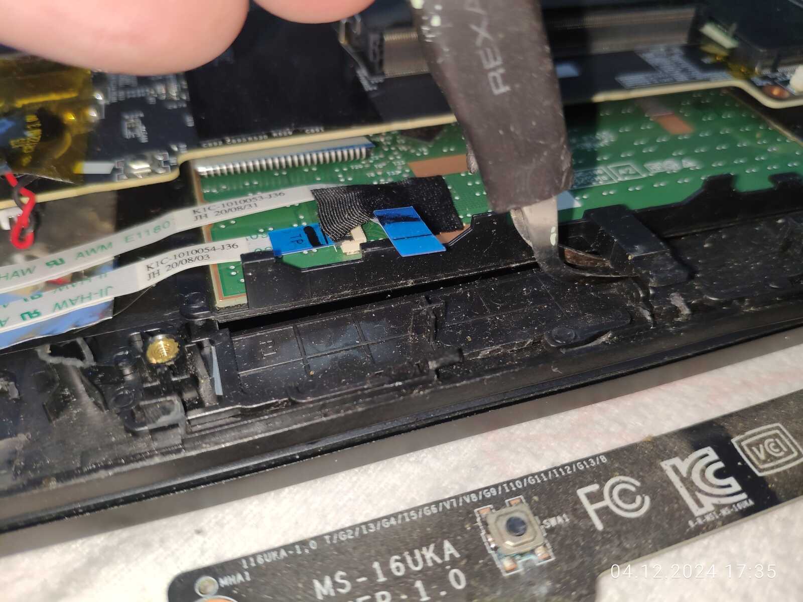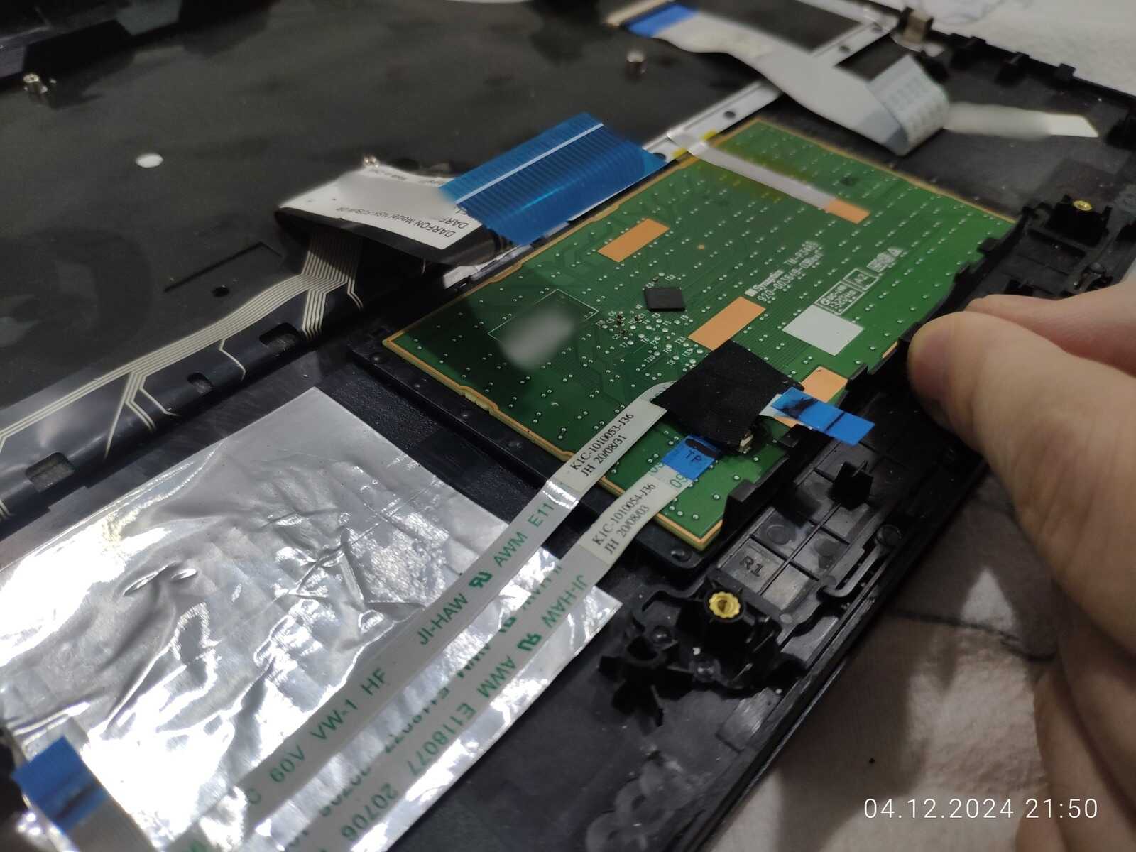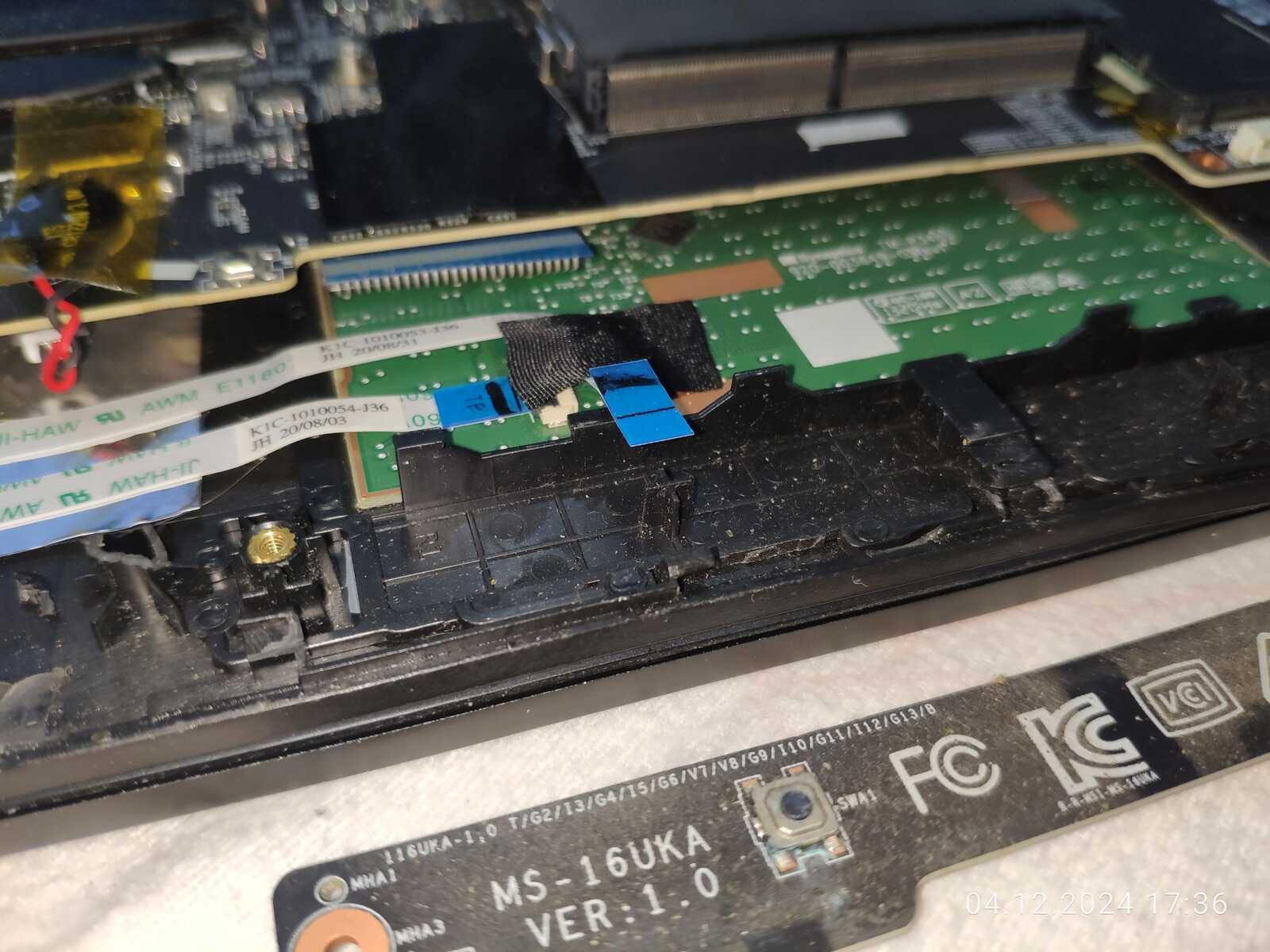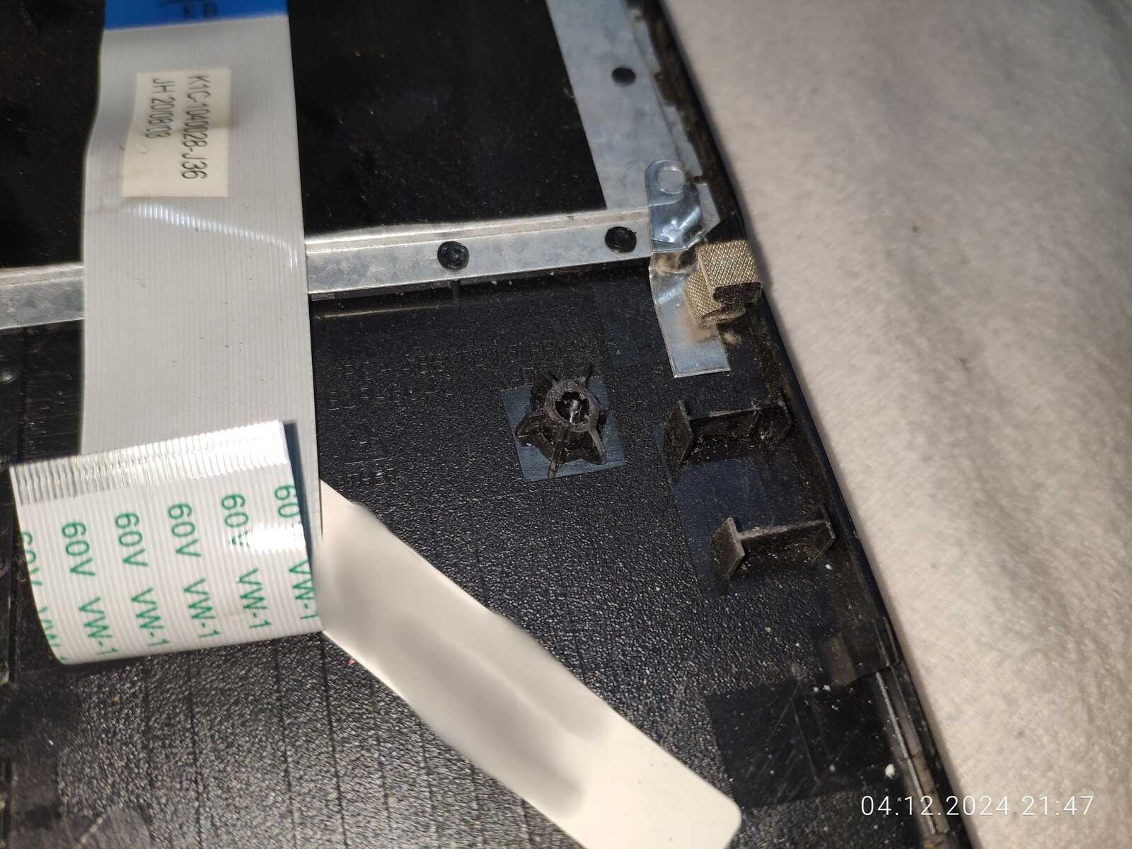 Подбираюсь к тачпаду, да, это отвал тачпада, все пластиковые заклёпки отвалились с одной стороны.