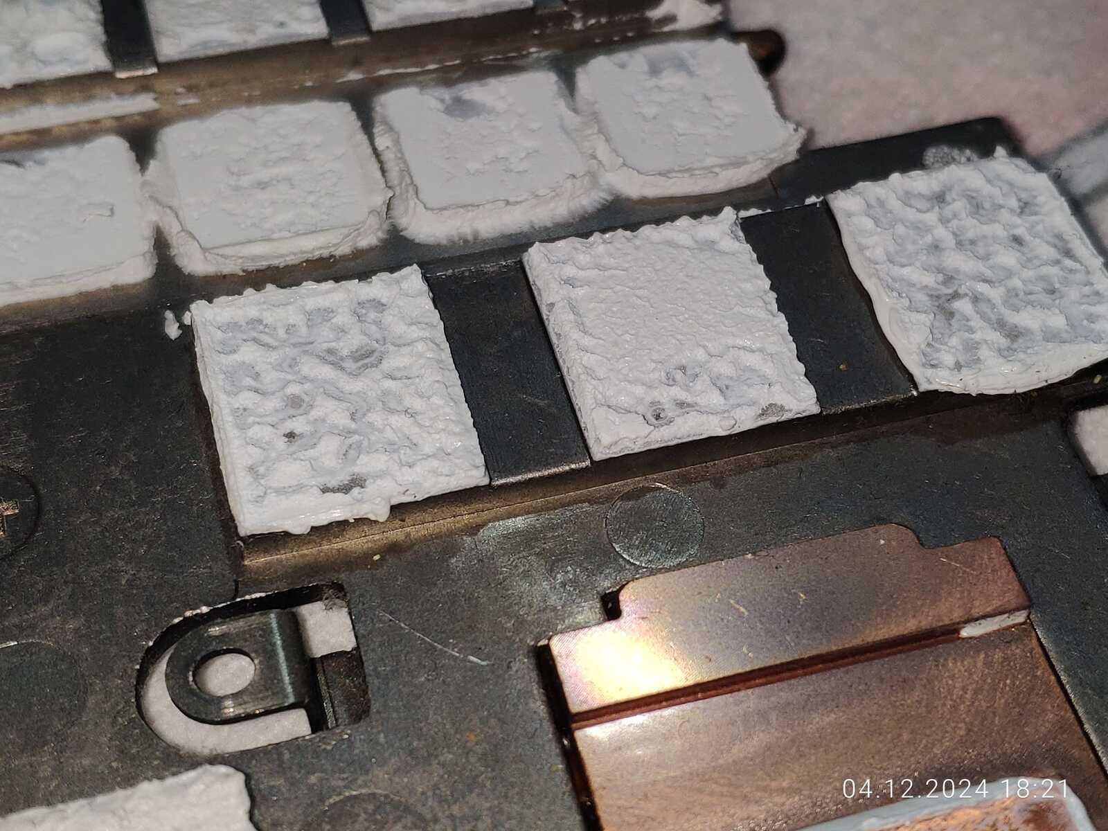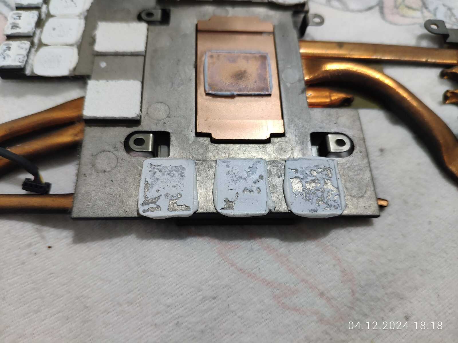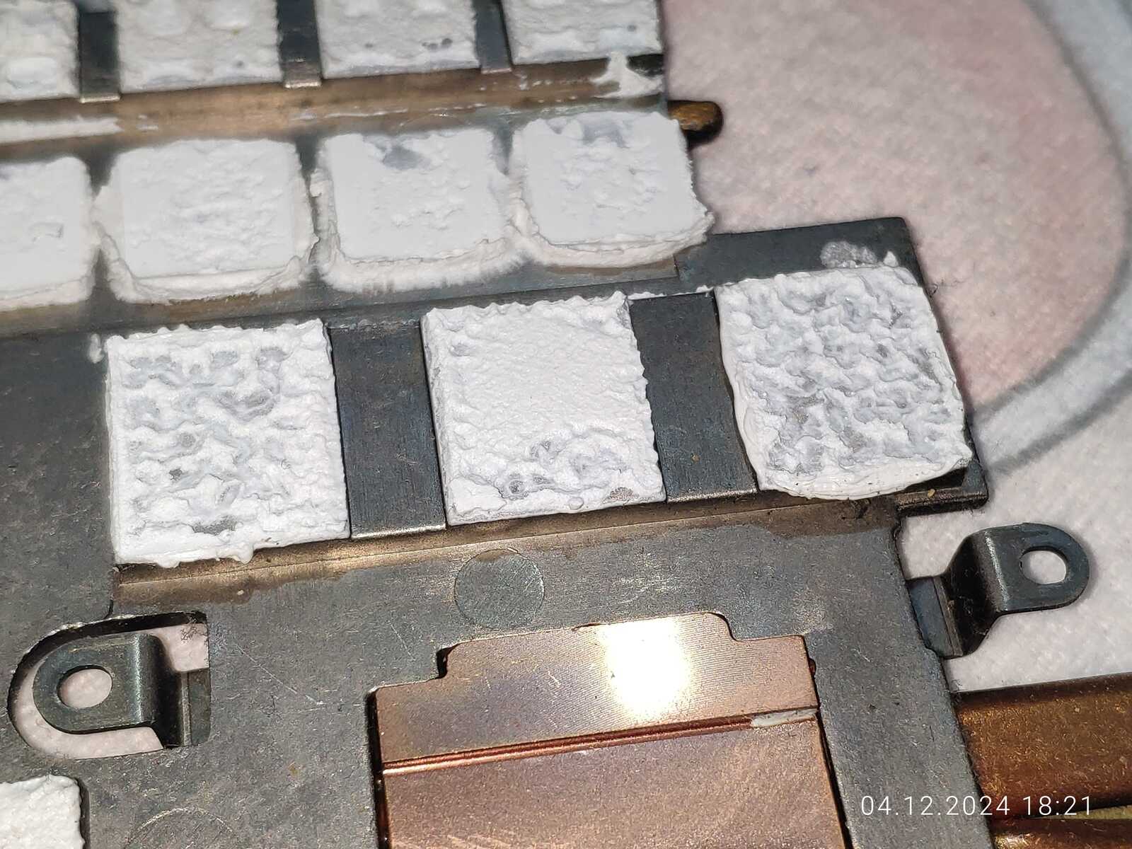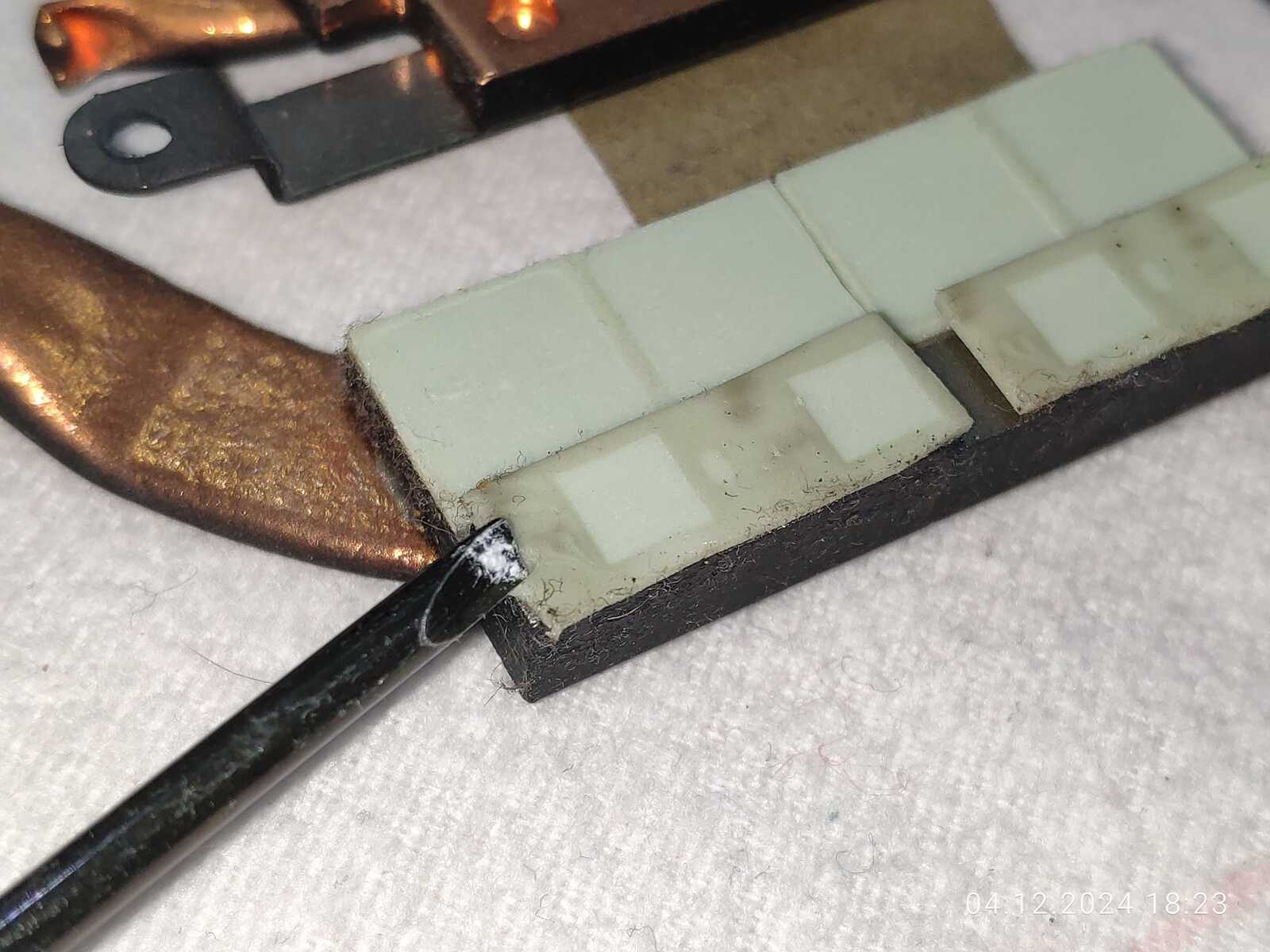 Цепи питания процессора охлаждаются через такие же прокладки и они тоже потекли, правда в сторону радиатора, потому он весь в пыли, даже зубной щёткой не получилось вычистить, наверное плохо старался.