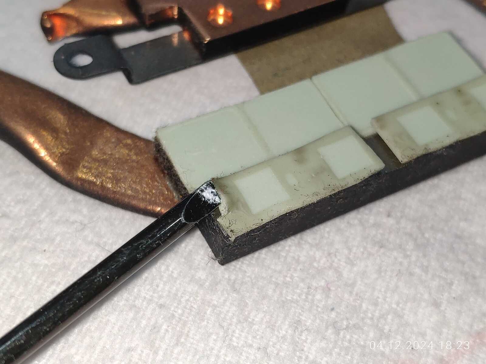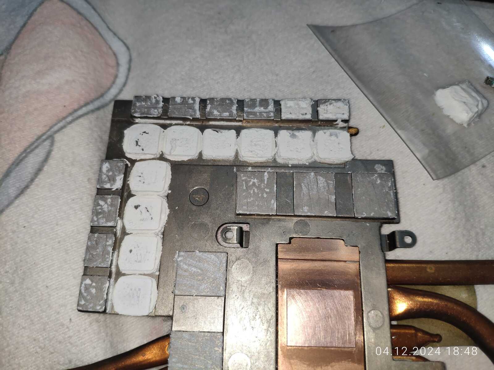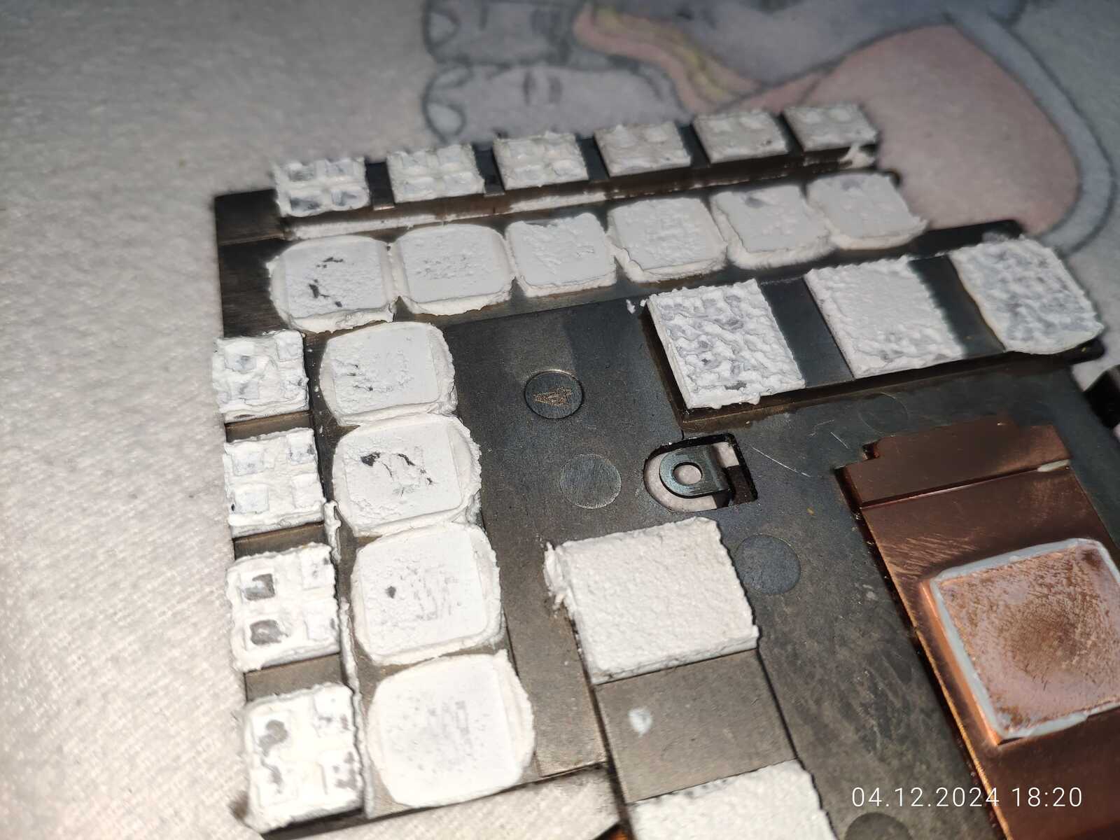 Цепи питания процессора охлаждаются через такие же прокладки и они тоже потекли, правда в сторону радиатора, потому он весь в пыли, даже зубной щёткой не получилось вычистить, наверное плохо старался.