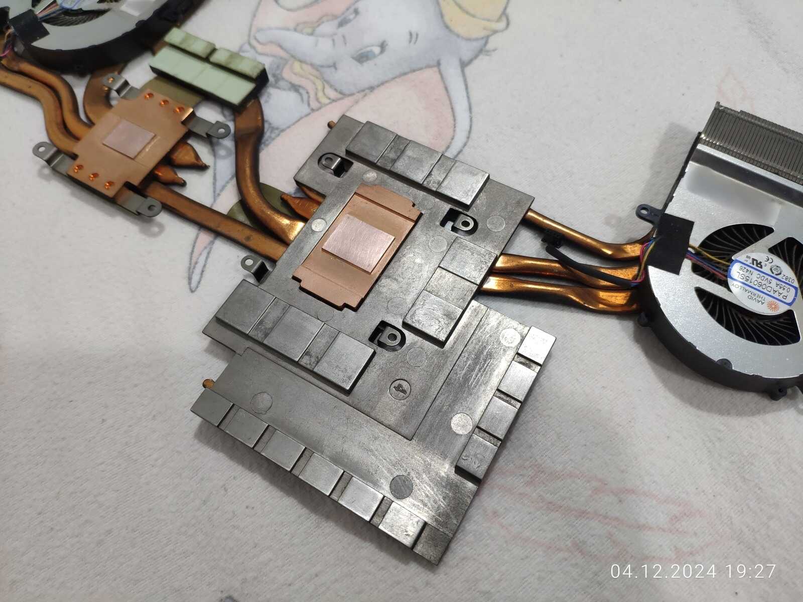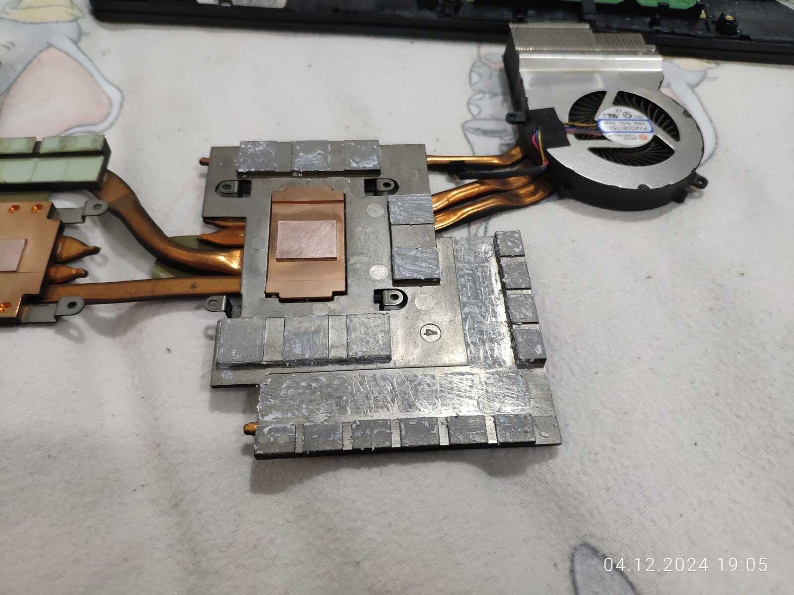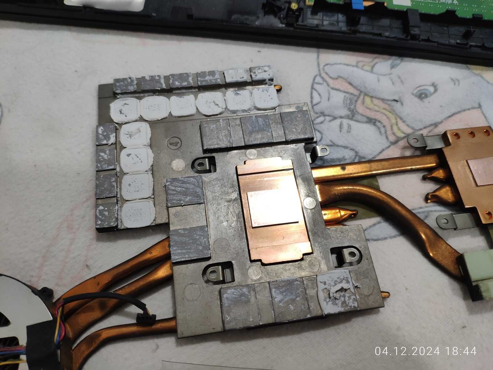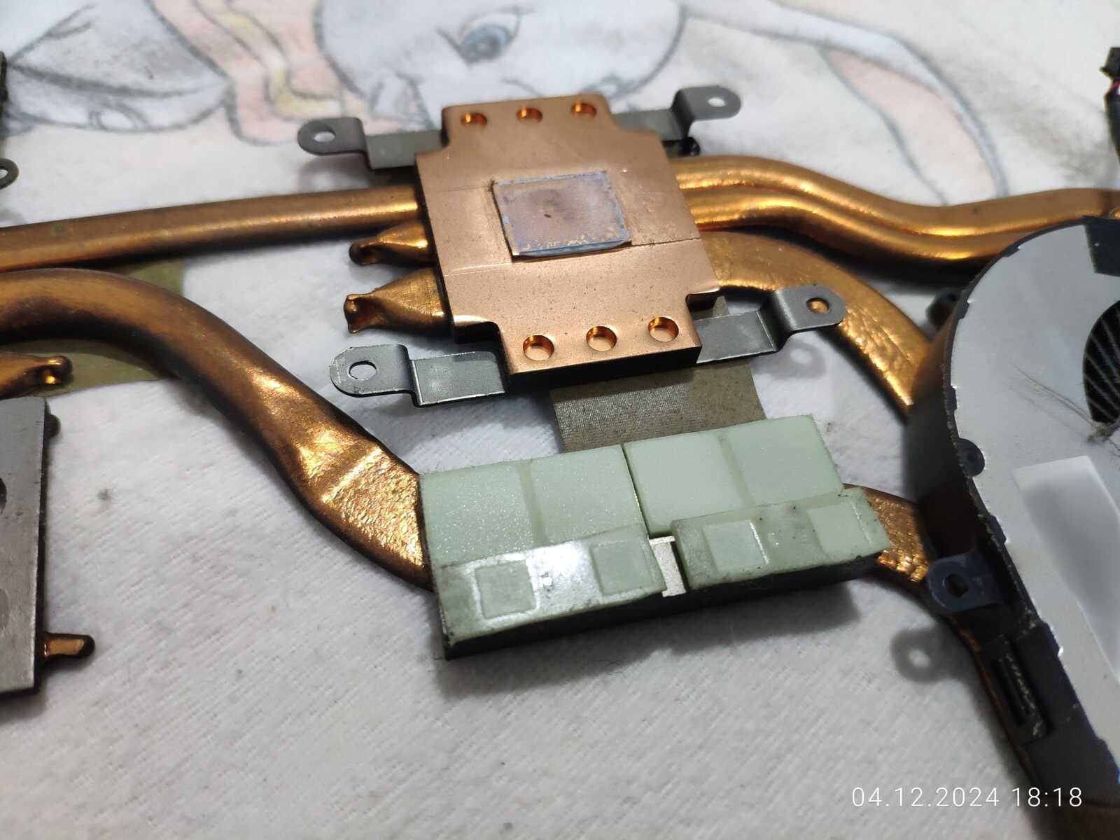Цепи питания процессора охлаждаются через такие же прокладки и они тоже потекли, правда в сторону радиатора, потому он весь в пыли, даже зубной щёткой не получилось вычистить, наверное плохо старался.