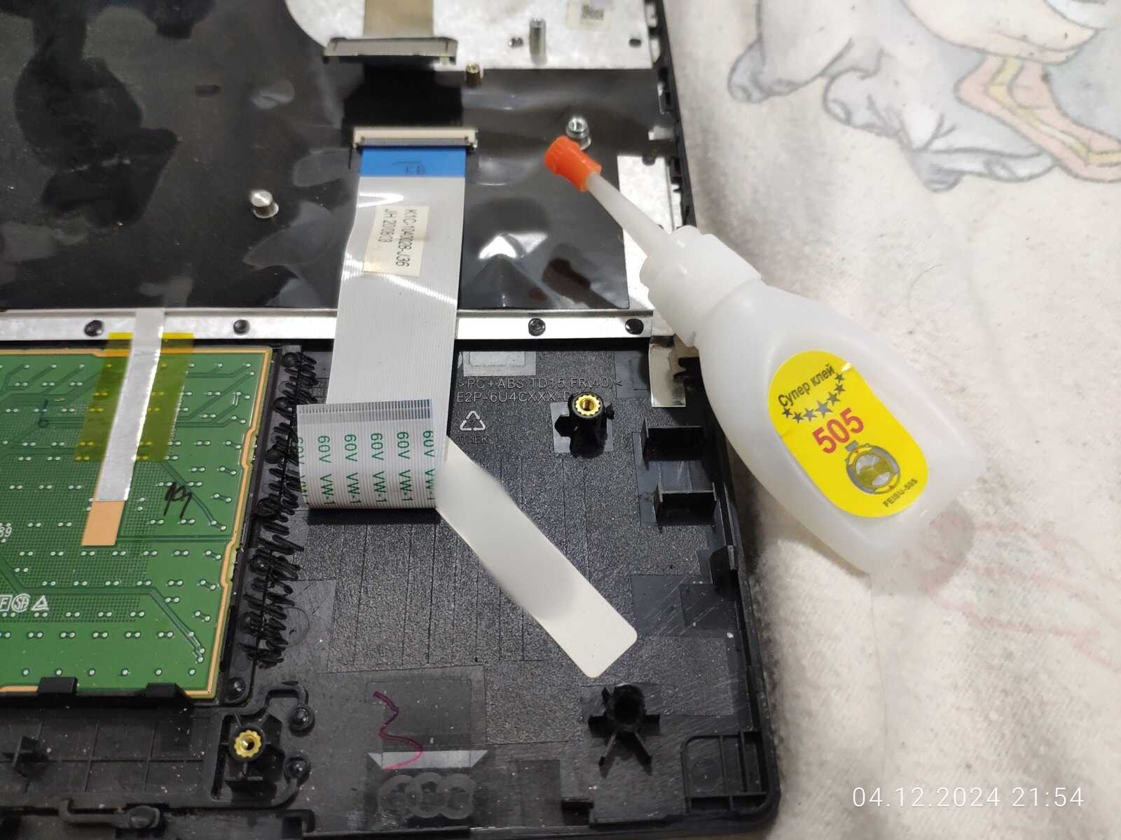 Так же горячим клеем заливаю тачпад, именно для этого мне нужно было поработать паяльником, чтобы создать дополнительное сцепление с корпусом, и мне не приходилось снова разбирать ноутбук для ремонта.