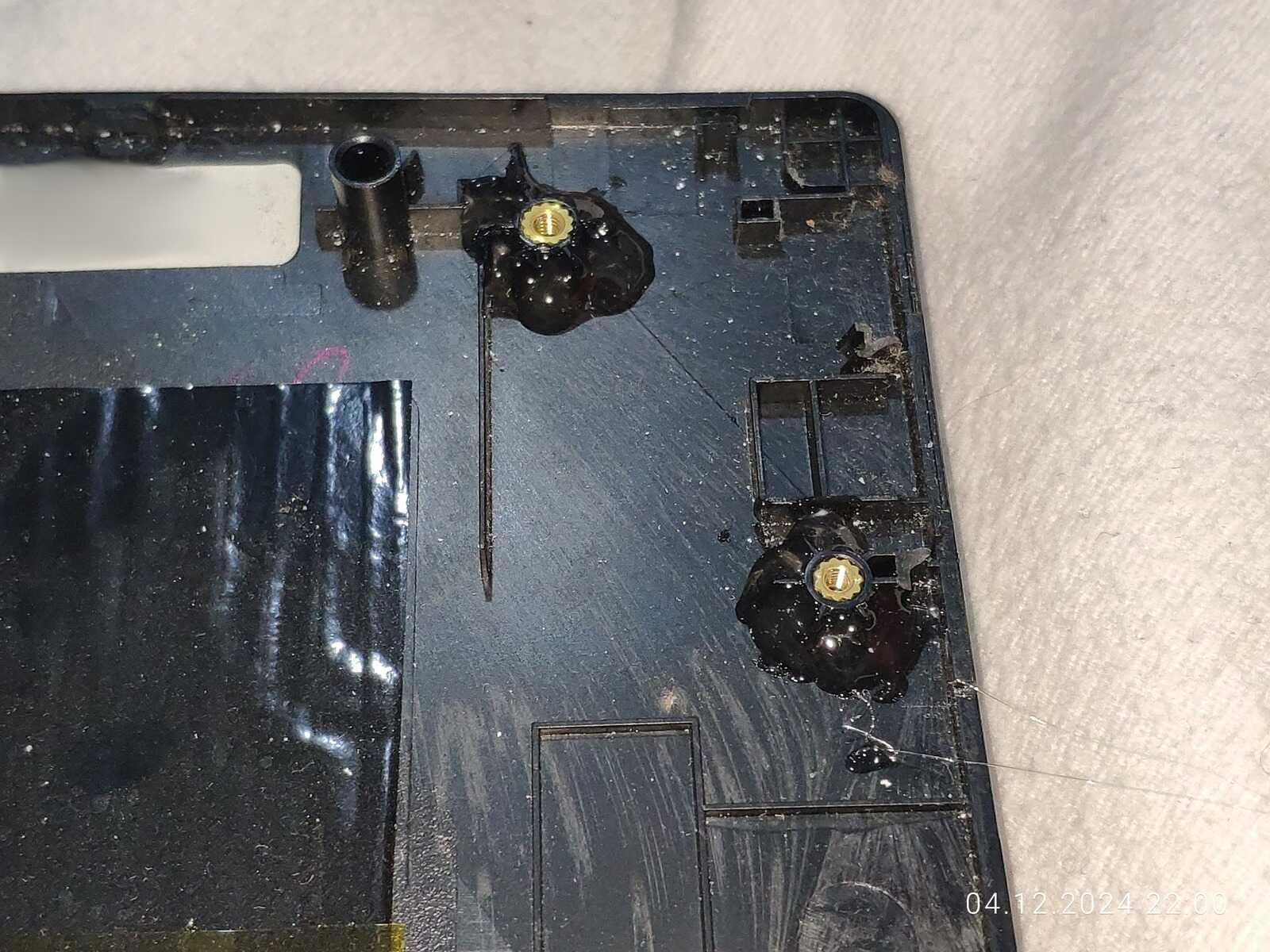 Корпус изготовлен из пластика низкого качества, примерно на второй год начались первые разрушения, и до сих пор разрушается, кто знает, может металлические втулки как раз и были виновниками некоторых из сбоев в работе ноутбука, хотя сбои были задолго до того, как корпус начал рассыпаться, так что сомнительно.