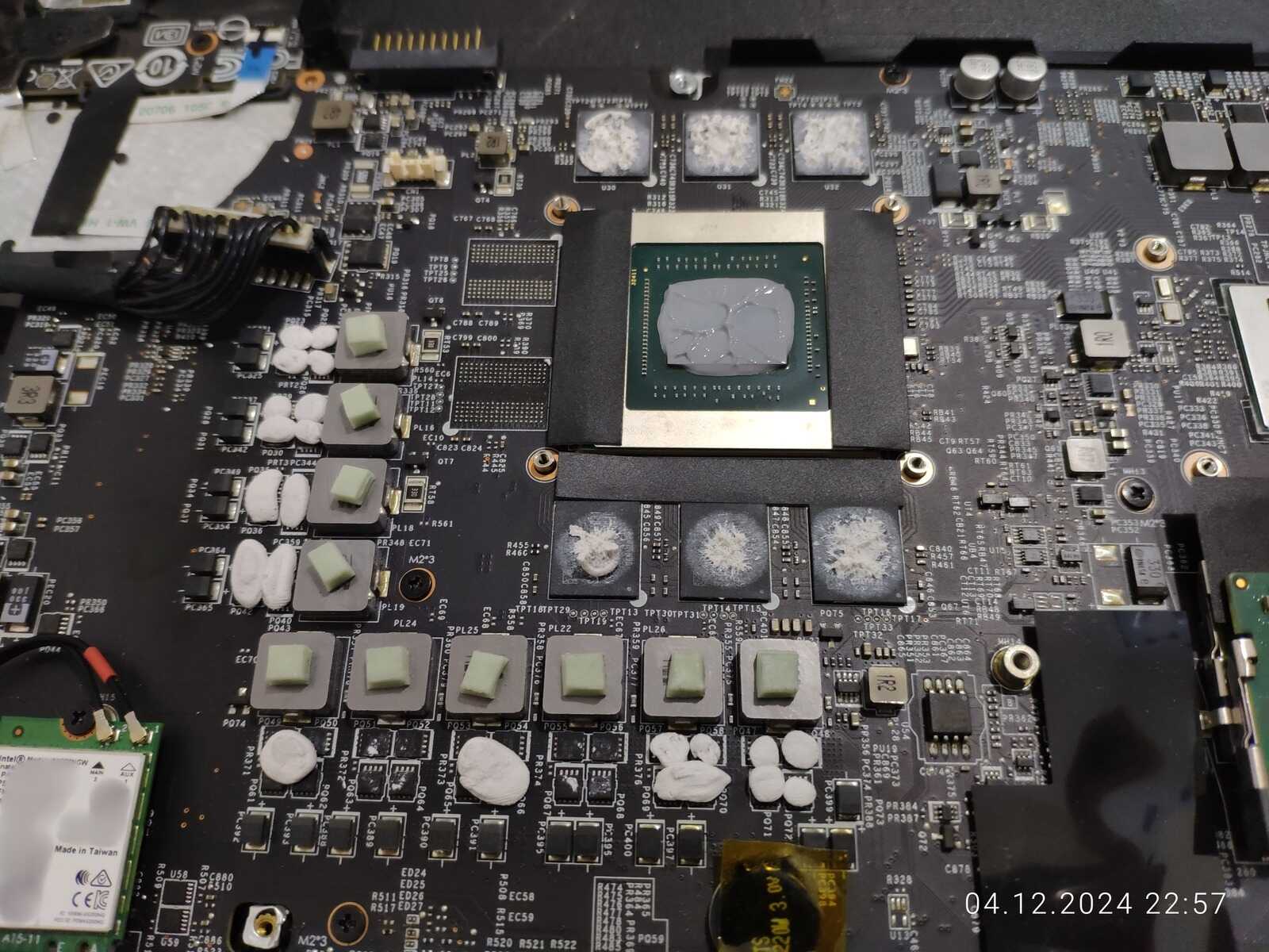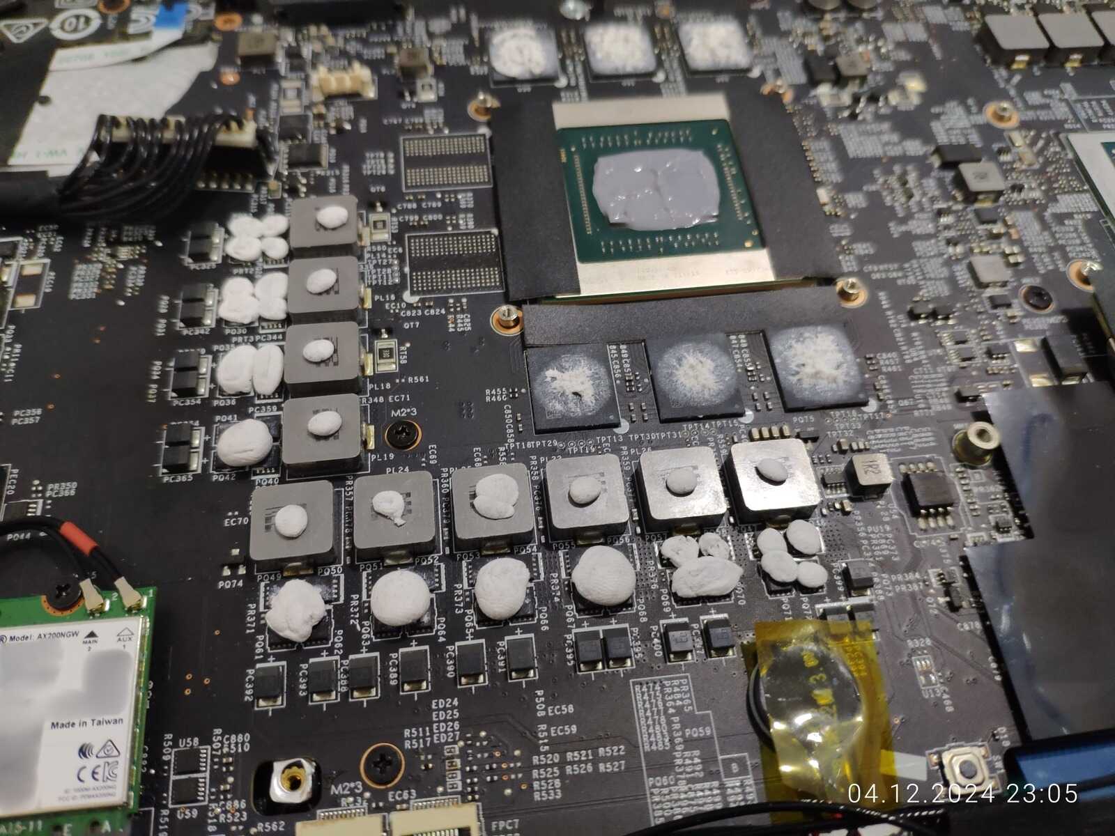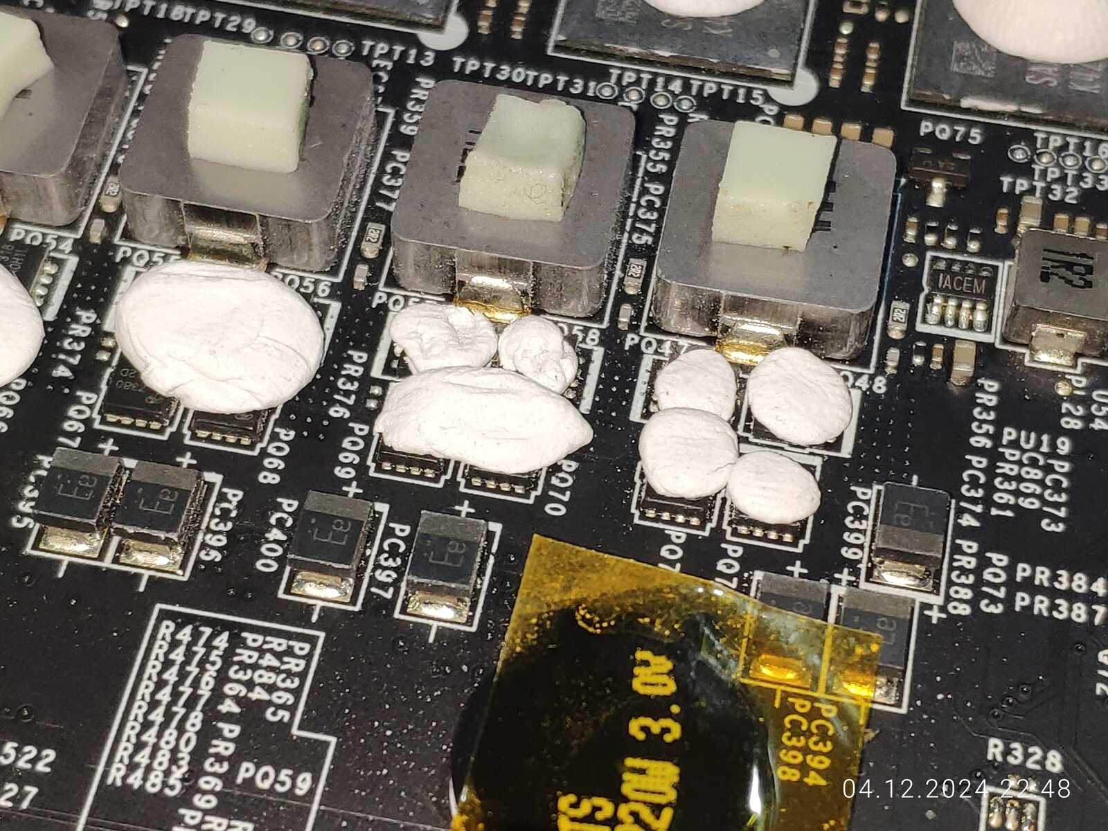 Некоторые "жидкие" прокладки явно не выполняли свою задачу по отведению тепла, это особенно заметно в зонах охлаждения чипов памяти видеокарты.