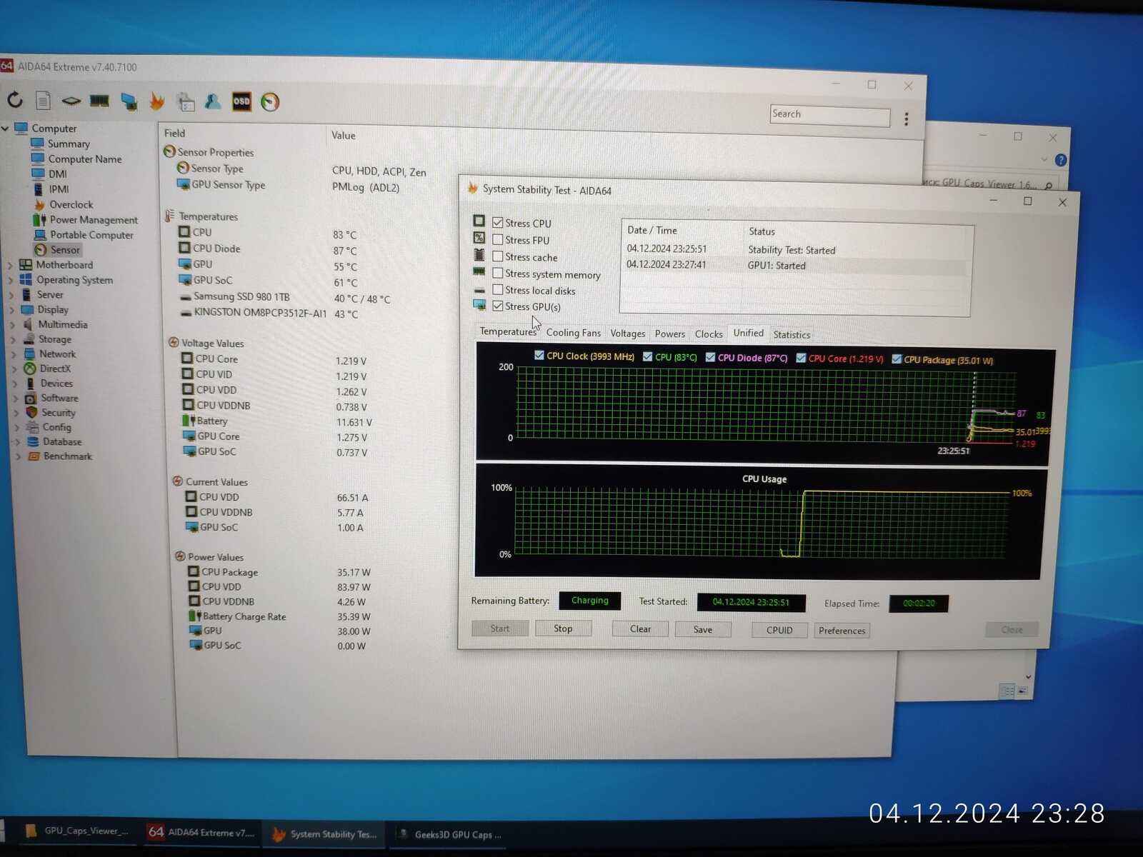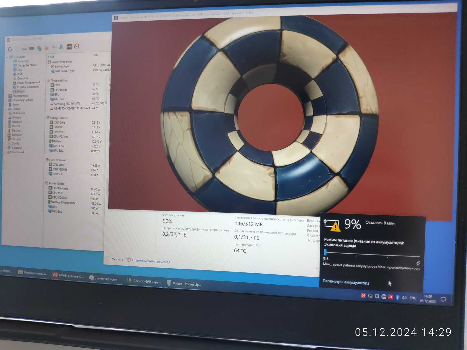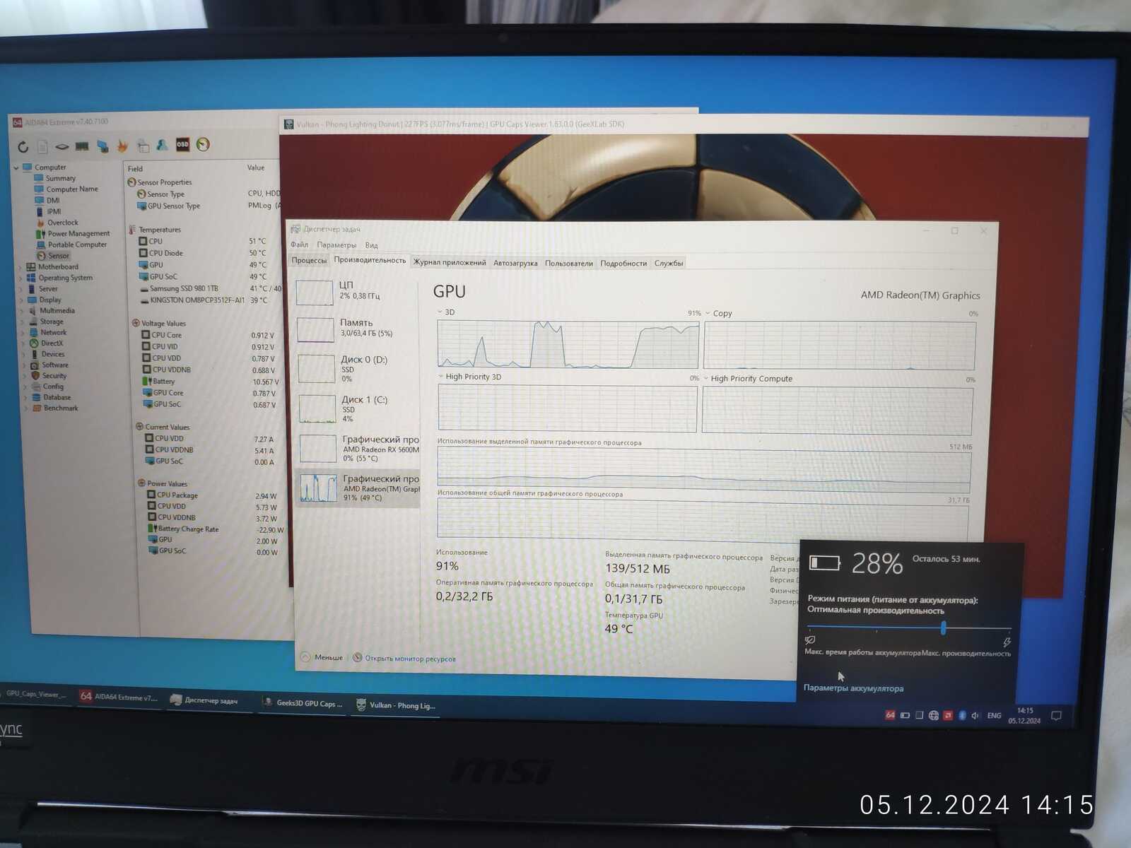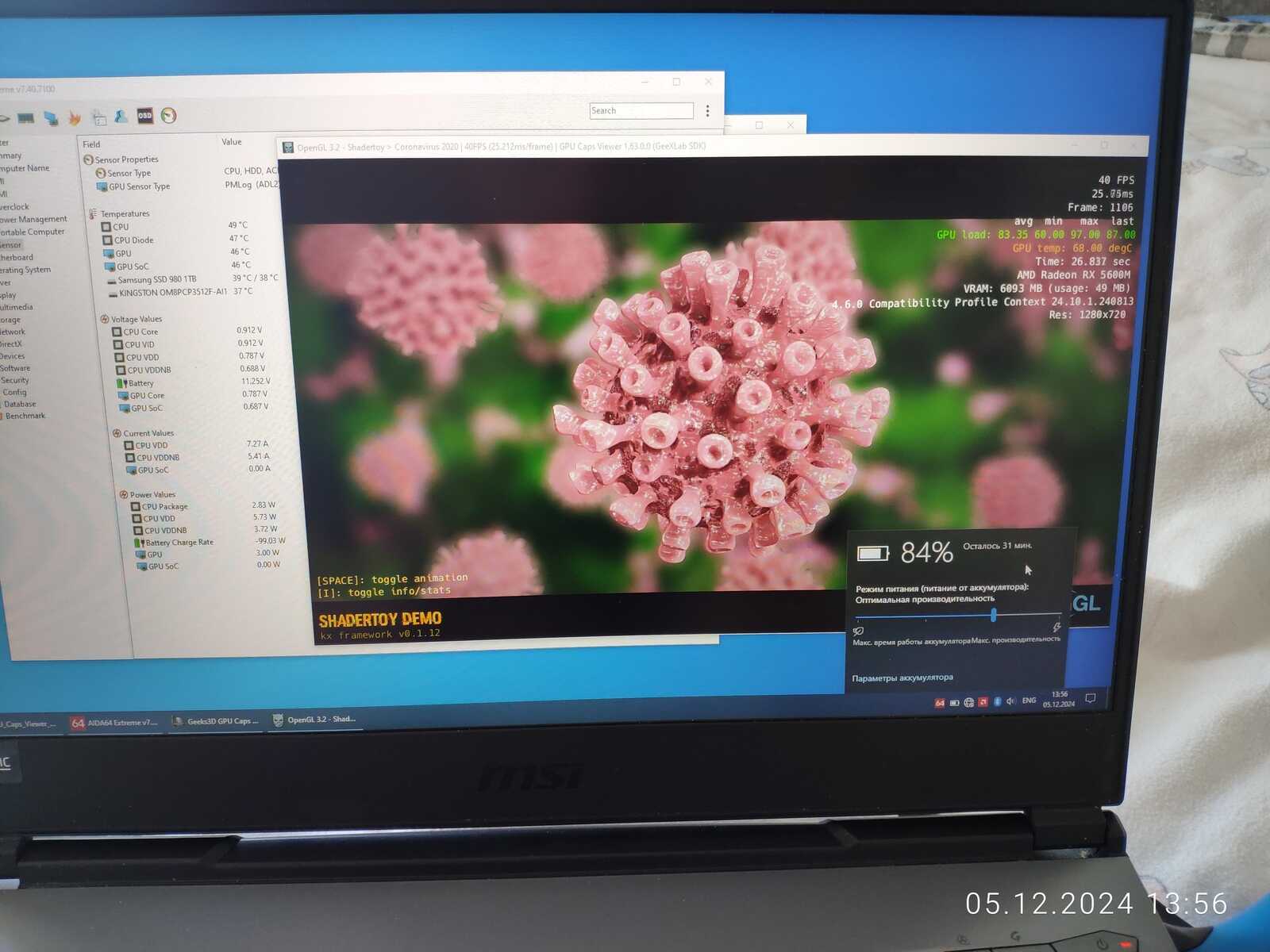 Пришлось потанцевать с бубном немного, чтобы задействовать нужную видеокарту, спасибо вечно кривым драйверам AMD за лишние проблемы на ровном месте, но запустил более тяжёлый тест "коронавирус", ну и заодно проверил температуру, выглядит неплохо.