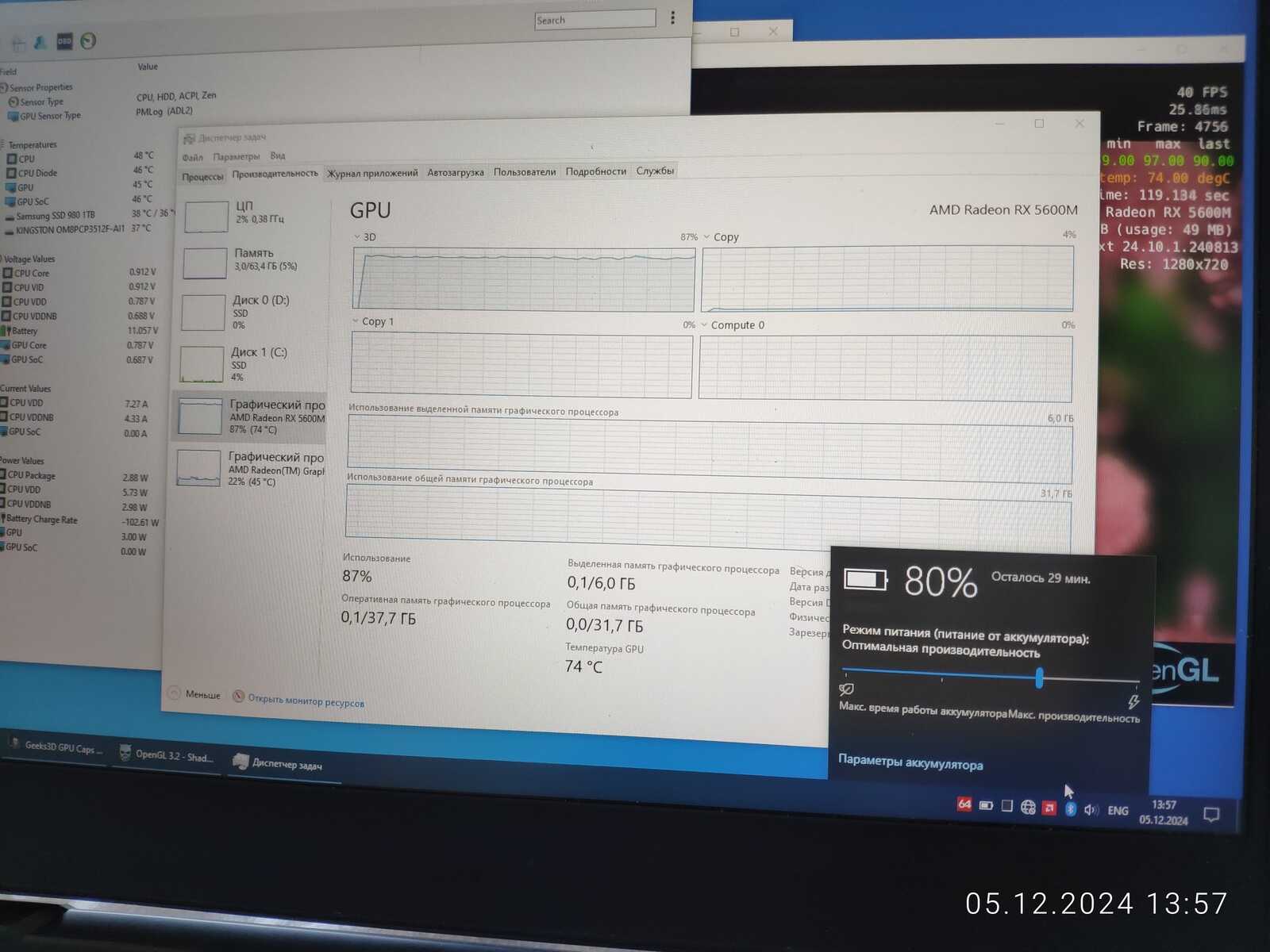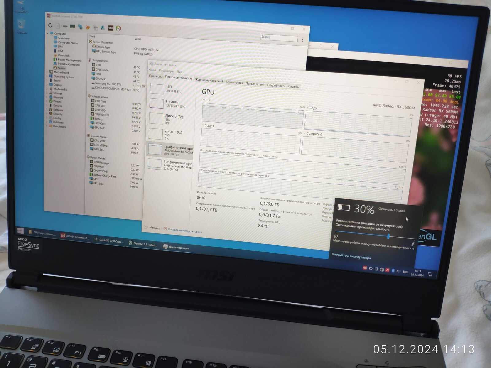 Даже несмотря на импровизированные подставки под днище - максимальный нагрев видеокарты RX 5600M вышел на уровне 84 градусов, тест работал около 17 минут, аккумулятор разрядился с 84% до 30%, видеокарта это всё время жрала около 100 Вт*ч энергии.