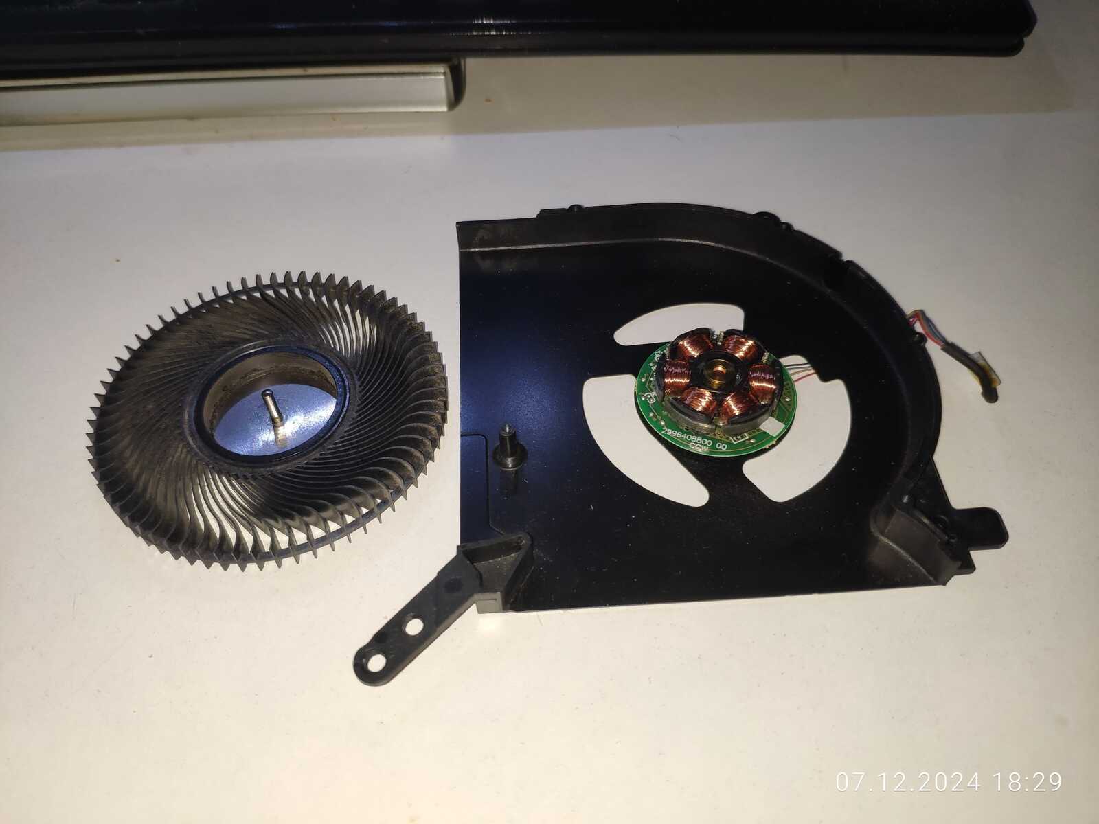Да и потом ещё собрать двигатель обратно, а учитывая гнутый и повреждённый корпус - ну его, слишком много возни, так что обойдётся ноутбук без дополнительного вентилятора, пока приедет новый.