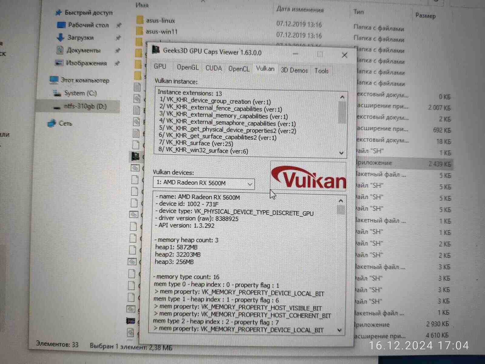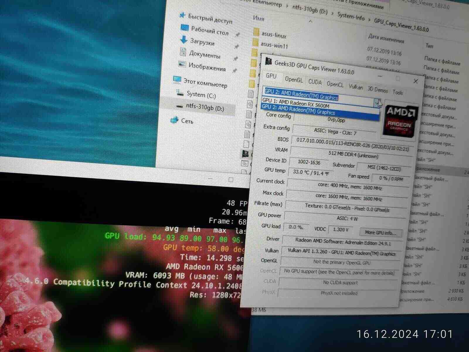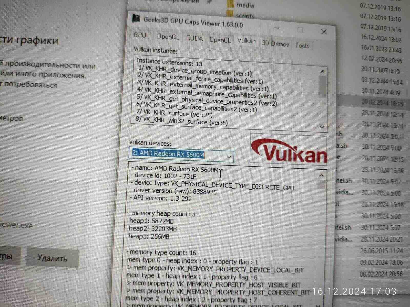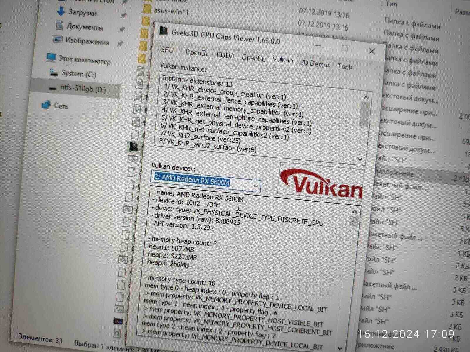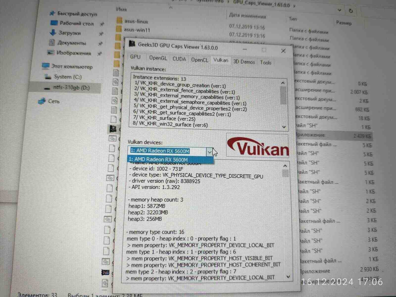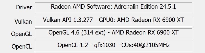 Обратите внимание на Vulkan API 1.3.260, при выборе Vega показывает драйвер 24.9.1, и 24.10.1 при выборе RX 5600M, то есть драйвер конца 2024 года, а Vulkan середины 2023 года...