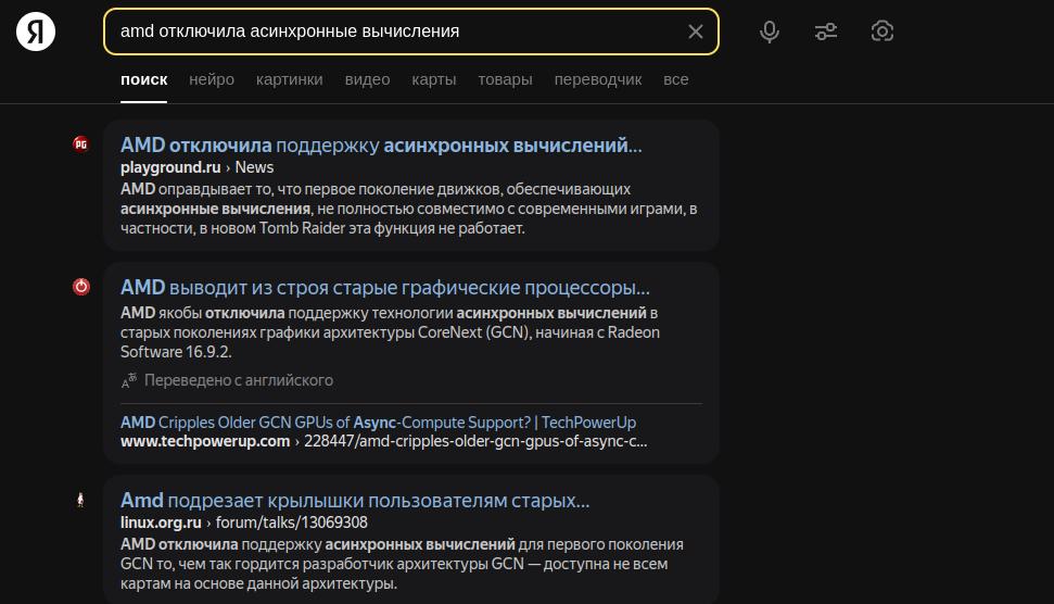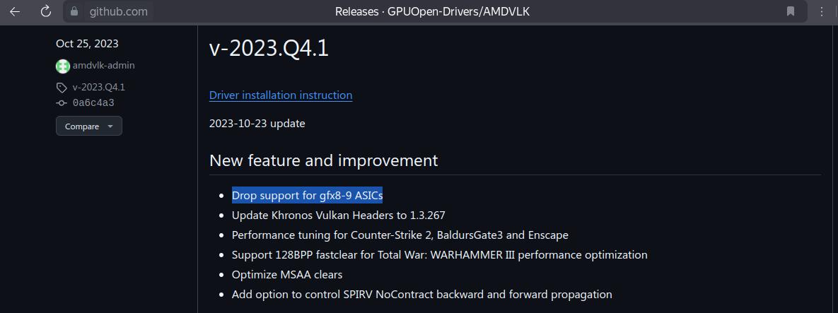 А ведь это не всё, на самом деле AMD кинула пользователей RX 400 - Vega ещё в 2023 году, они просто вырезали поддержку gfx8-9 (RX 400 - Vega) в официальном драйвере Vulkan API.
