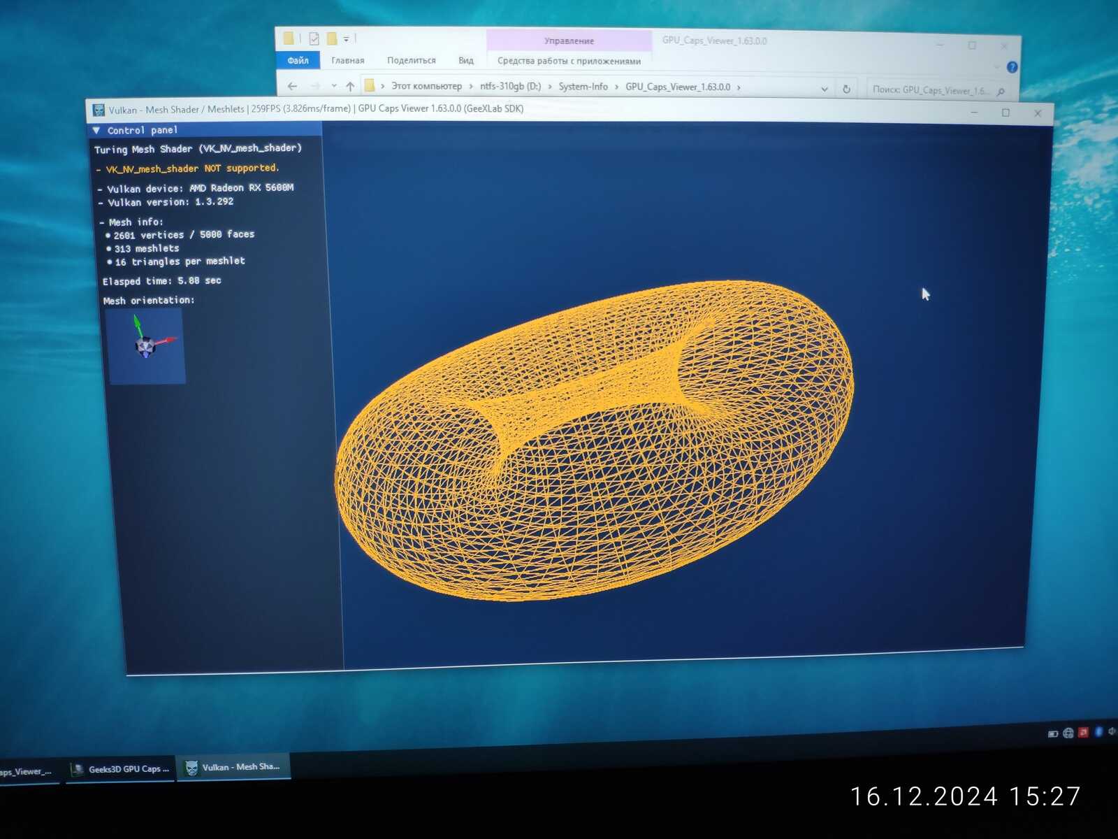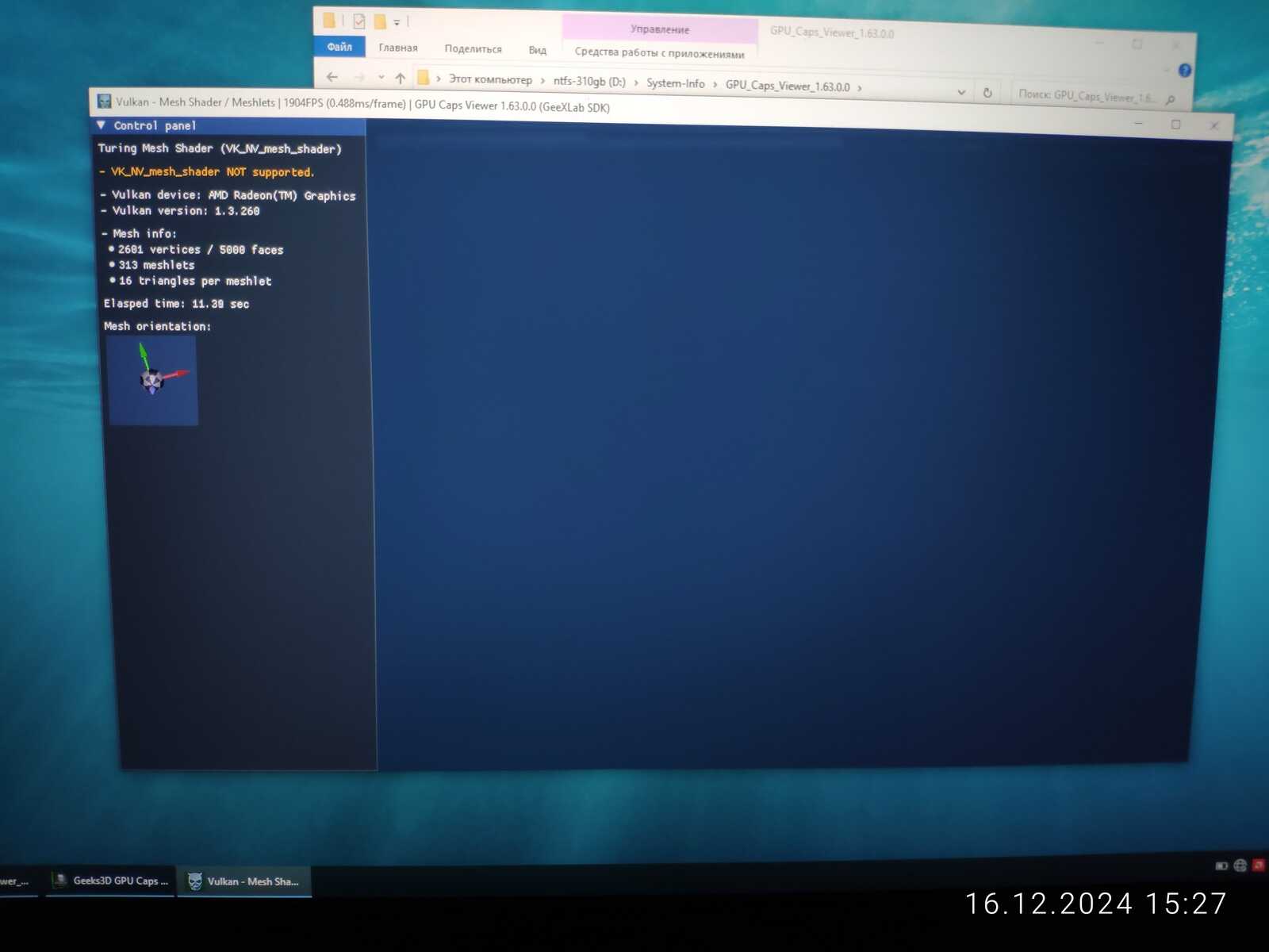 К чему это приводит? Правильно, к функциональной недостаточности, в составе GPU Caps Viewer есть тест Meshlets, он проверяет Mesh Shaders, но так как AMD кинула владельцев RX 400 - Vega, то и тест не способен ничего показать от слова "совсем", ведь это довольно новый функционал, которого нет в старых версиях Vulkan.
