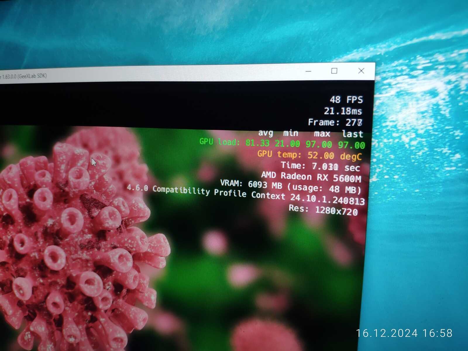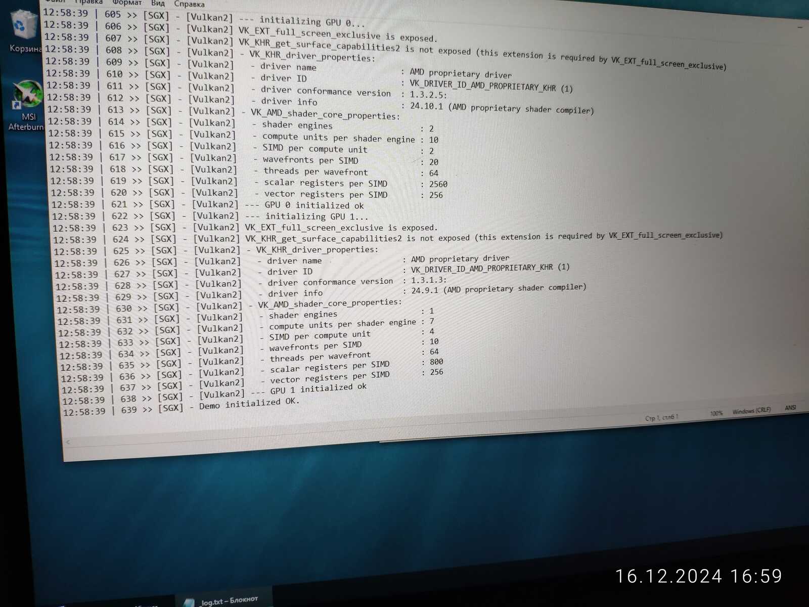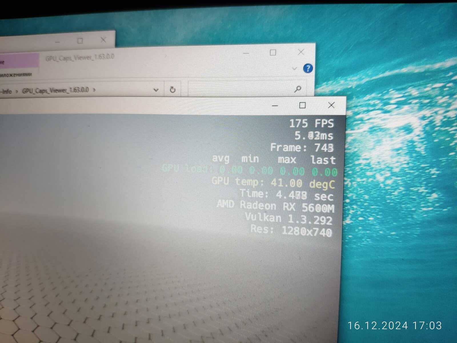 Вот и оно, я могу запустить OpenGL тест на RX 5600M, но не могу запустить Vulkan, ибо приложение закрывается, в логах при этом нет ничего интересного, последняя запись говорит об успешной инициализации теста.