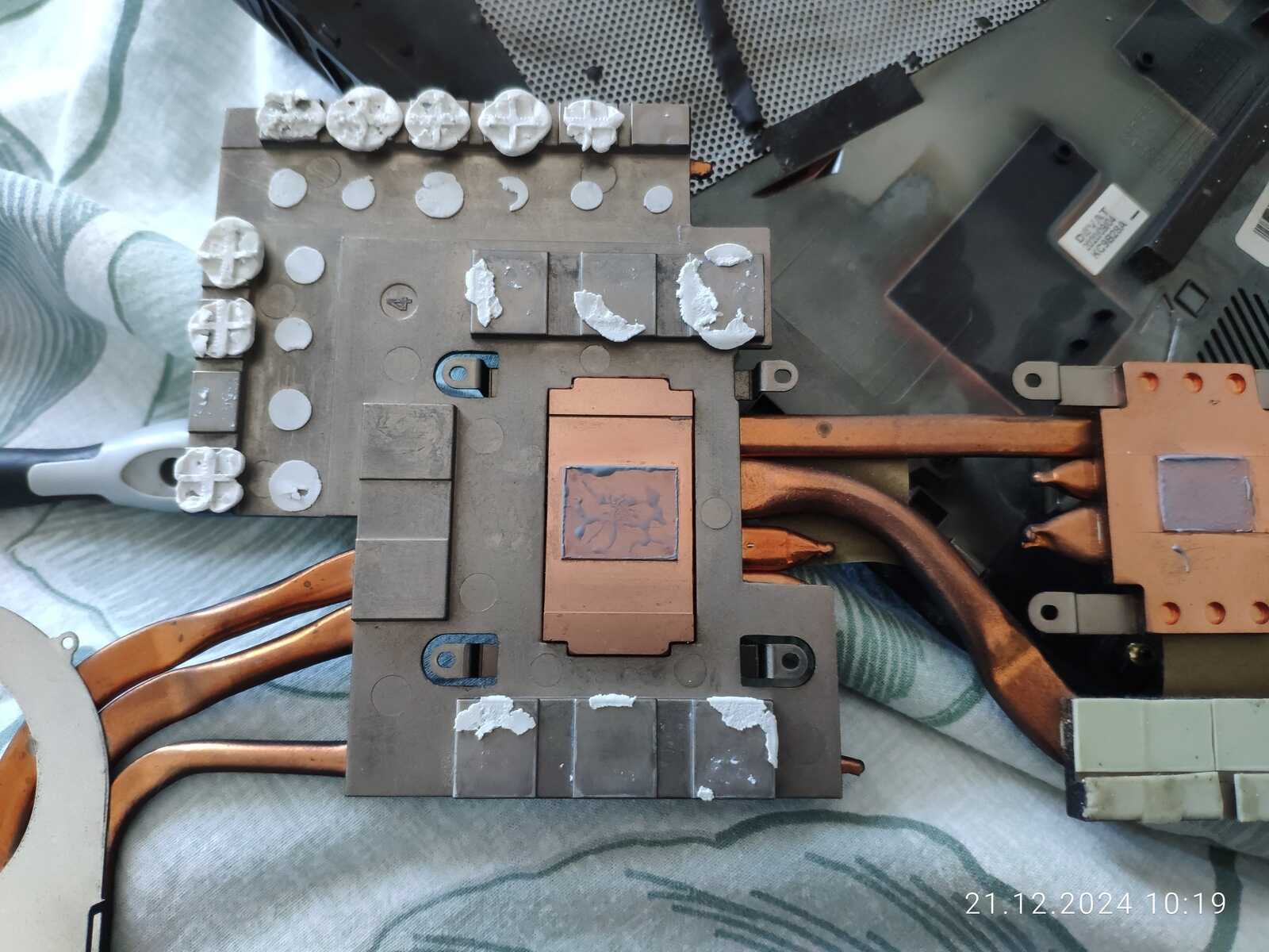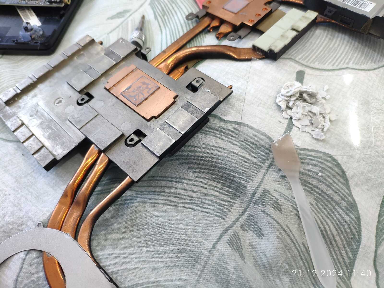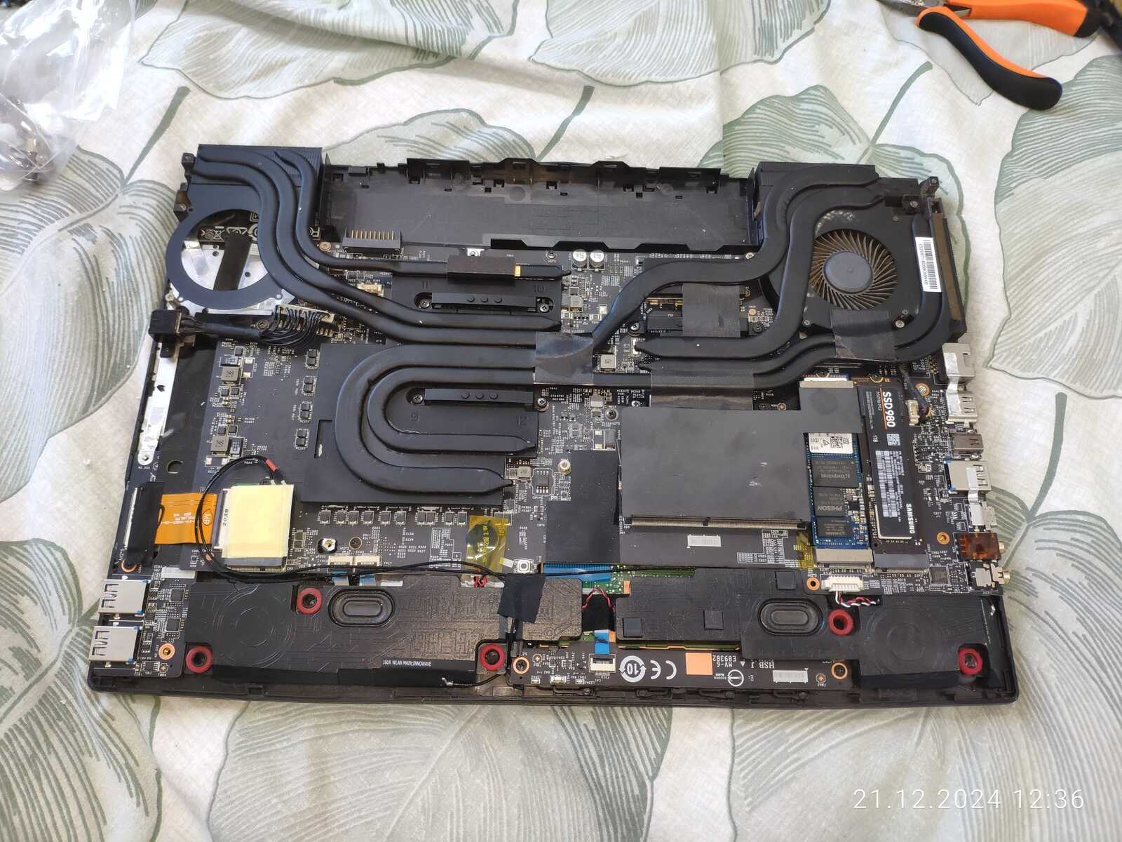 Везде валяются кусочки пластика, даже под радиатором один нашёлся, и даже внутри турбины системы охлаждения, куски пластика буквально по всему ноутбуку рассыпались, но больше всего меня напрягали "жидкие" прокладки, было ошибкой их повторно использовать в том виде, в котором они были после предыдущей разборки.