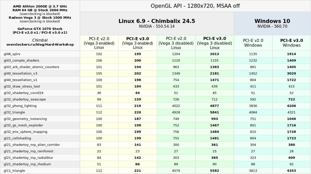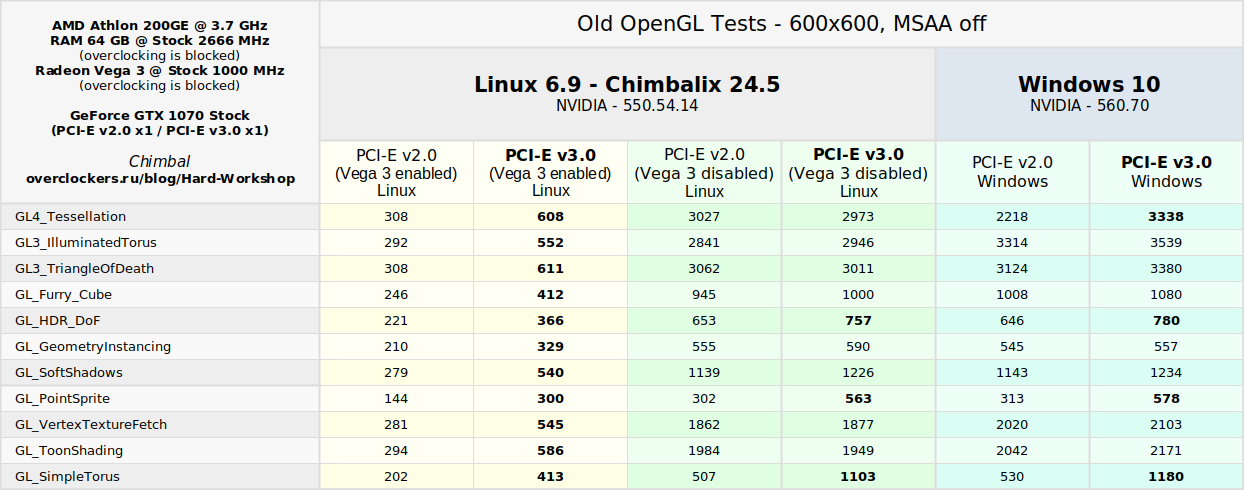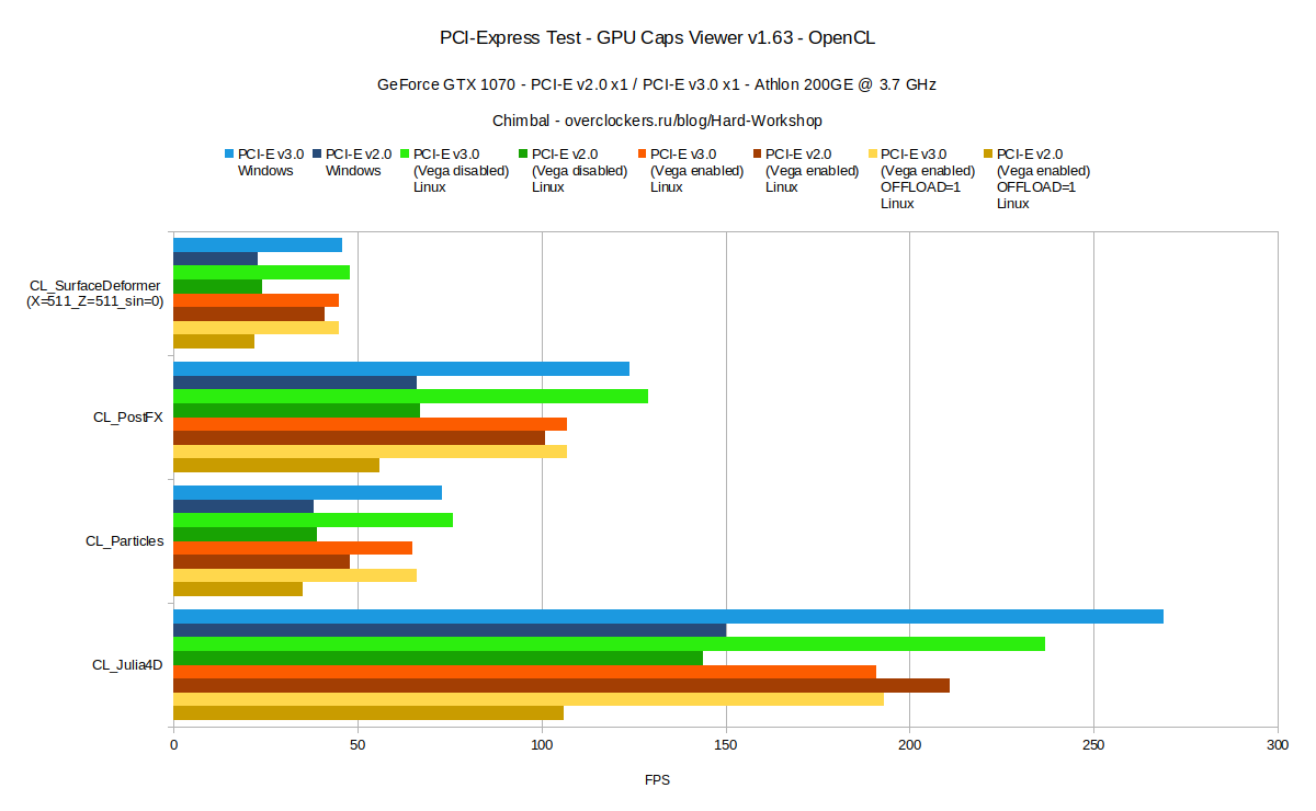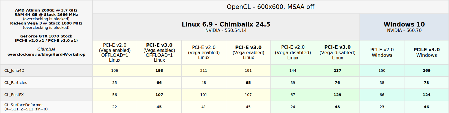 Практически во всех вычислительных тестах производительность возросла почти в 2 раза с переходом PCI-E 2.0 x1 на PCI-E 3.0 x1 при прочих равных, но есть и примечательный момент в среде Linux без использования OFFLOAD, переменной окружения с активной Radeon Vega - в таком режиме не было выявлено чёткой зависимости от шины, хотя это относиться только к тестам использующим OpenCL.