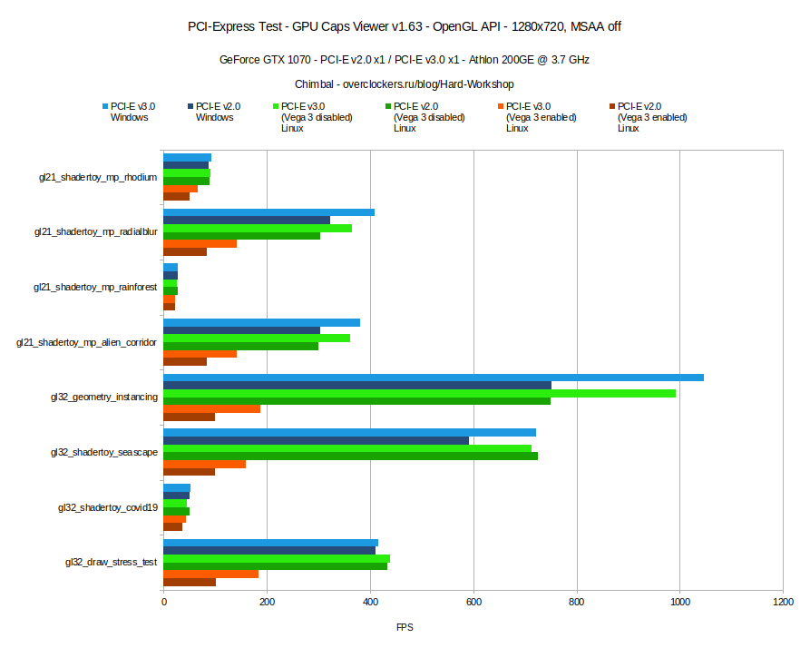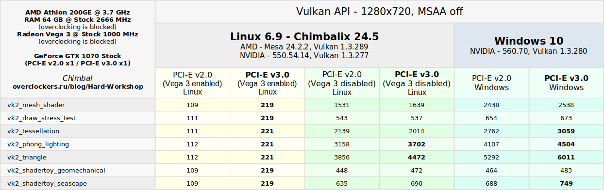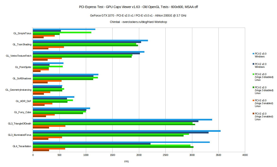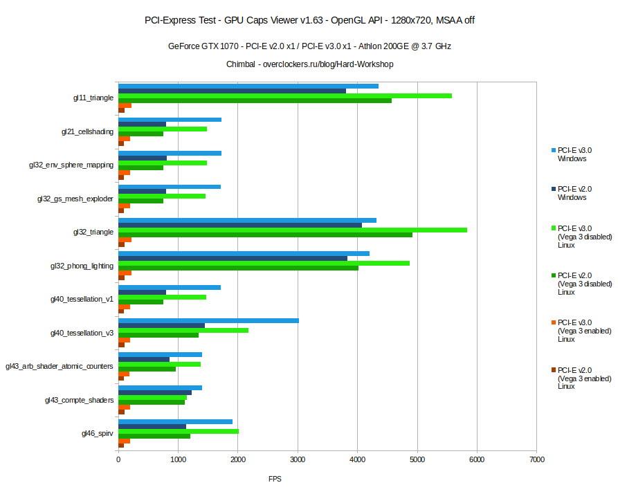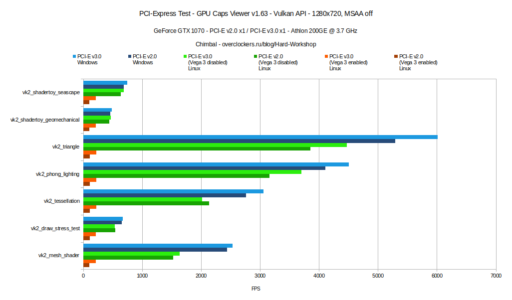 Далее Vulkan API, тут уже нет двукратного роста производительности при увеличении пропускной способности шины, кроме одного-единственного случая в среде Linux, когда выводом изображения занимается AMD Radeon, в таком случае да, FPS подрос в два раза, но это лишь потому, что видеокарте GTX 1070 нужно выводить изображение на монитор через шину PCI-E через процессор, а после уже через графику Vega, то есть через двух посредников.