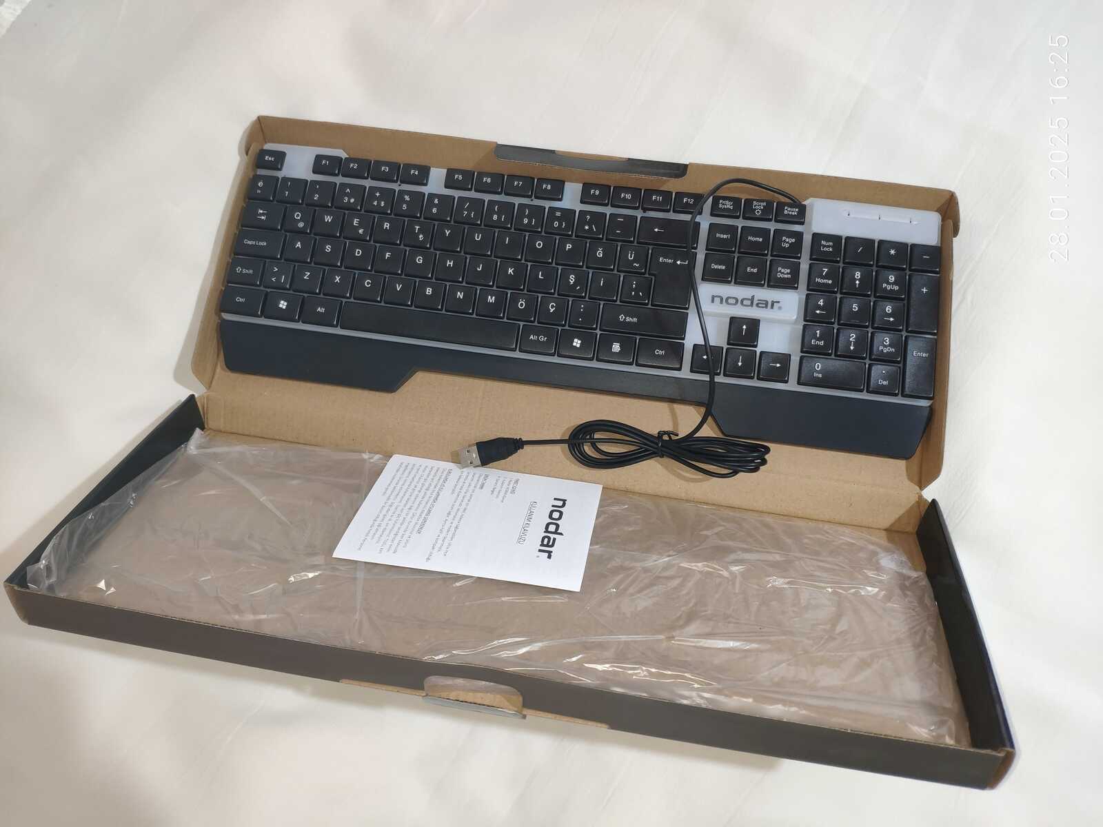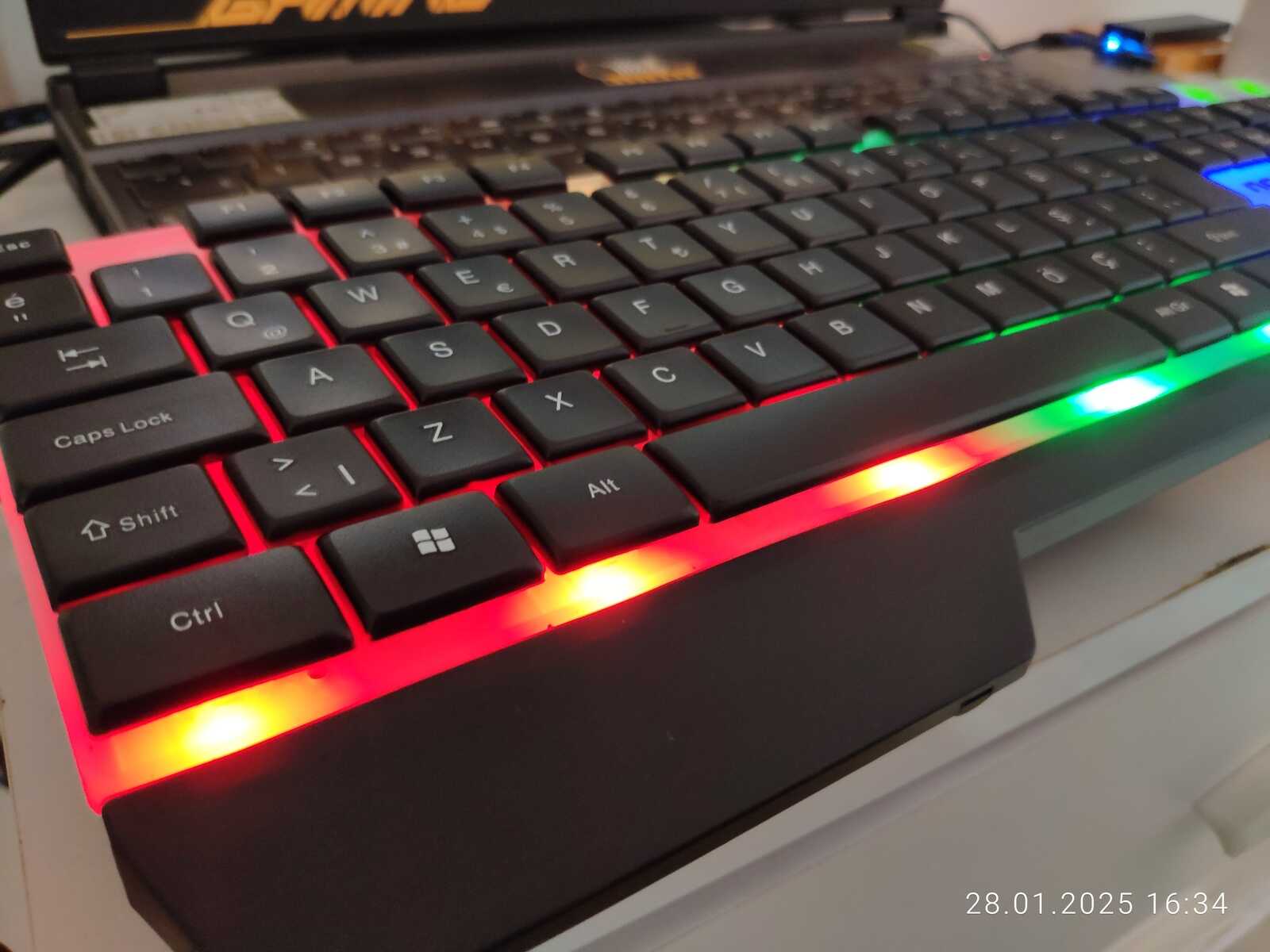 Упаковка стандартная картонная, на задней стороне указаны характеристики, 105 клавиш, радужная подсветка, мембранная клавиатура, USB подключение, размер 43.5 x 13.3 * 2.2 см., вес указан 400 грамм, длина провода 1.5 метра, ресурс 50 000 000 нажатий, 200 мА максимальный ток потребления при напряжении 5в, материал поверхности пластик.