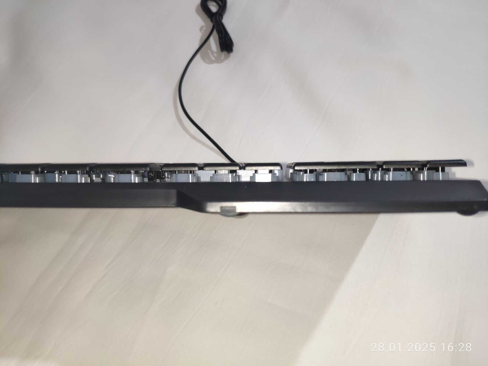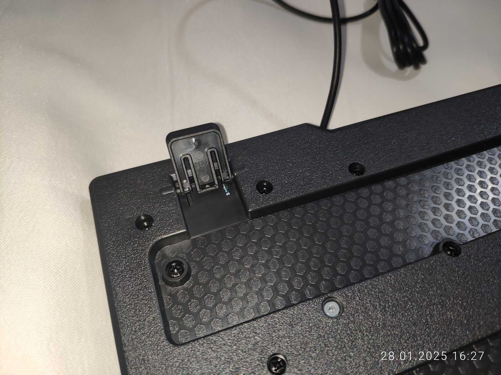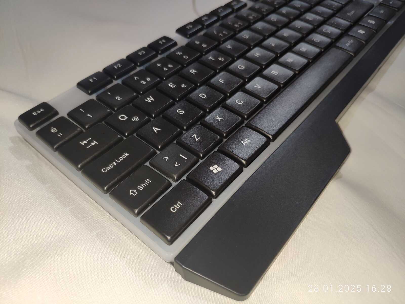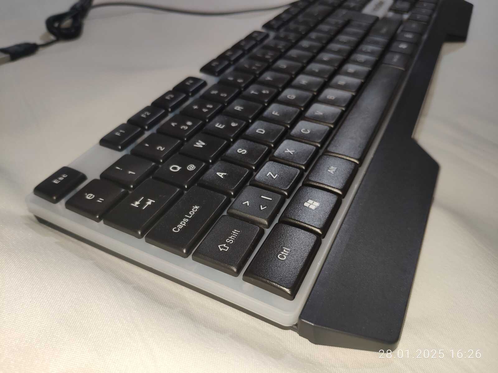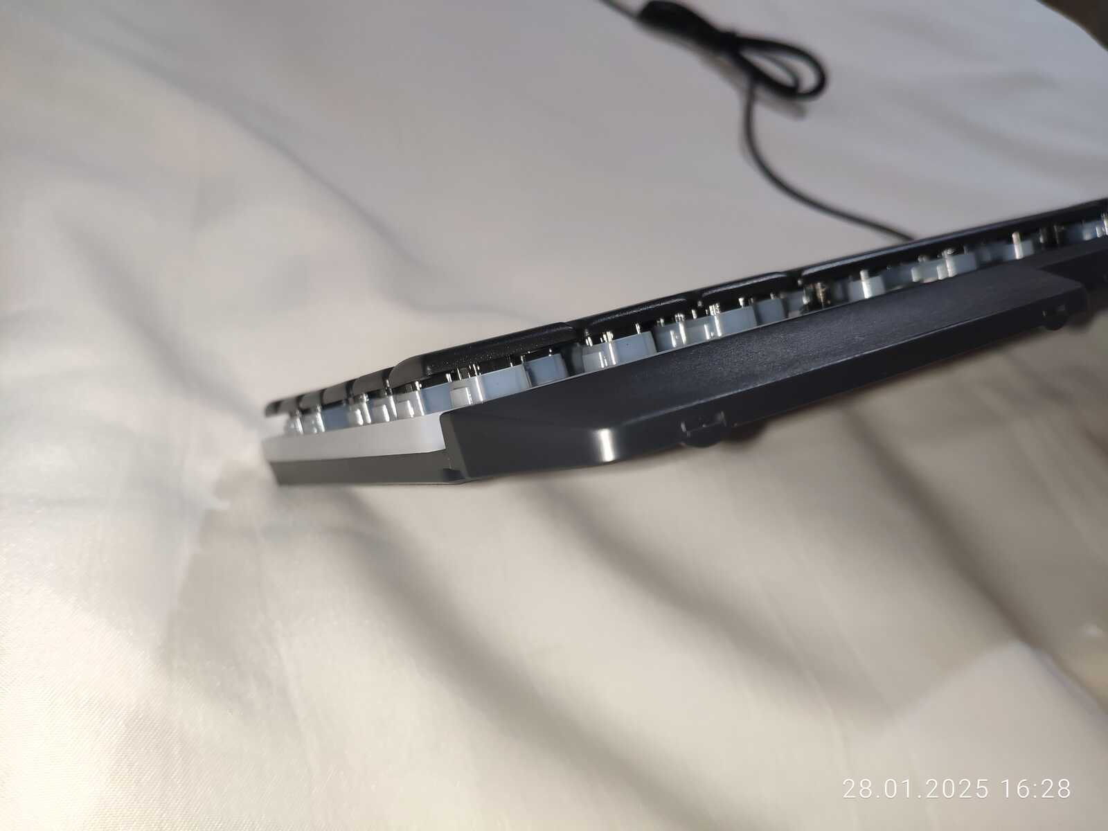 Как следует из названия - это игровая клавиатура, то есть предназначена для игр, потому имеет передний скос под руку, а сам корпус имеет довольно много рёбер жёсткости, хотя с первого взгляда это не очень очевидно, но корпус действительно жёсткий, и не прогибается сильно под давлением.