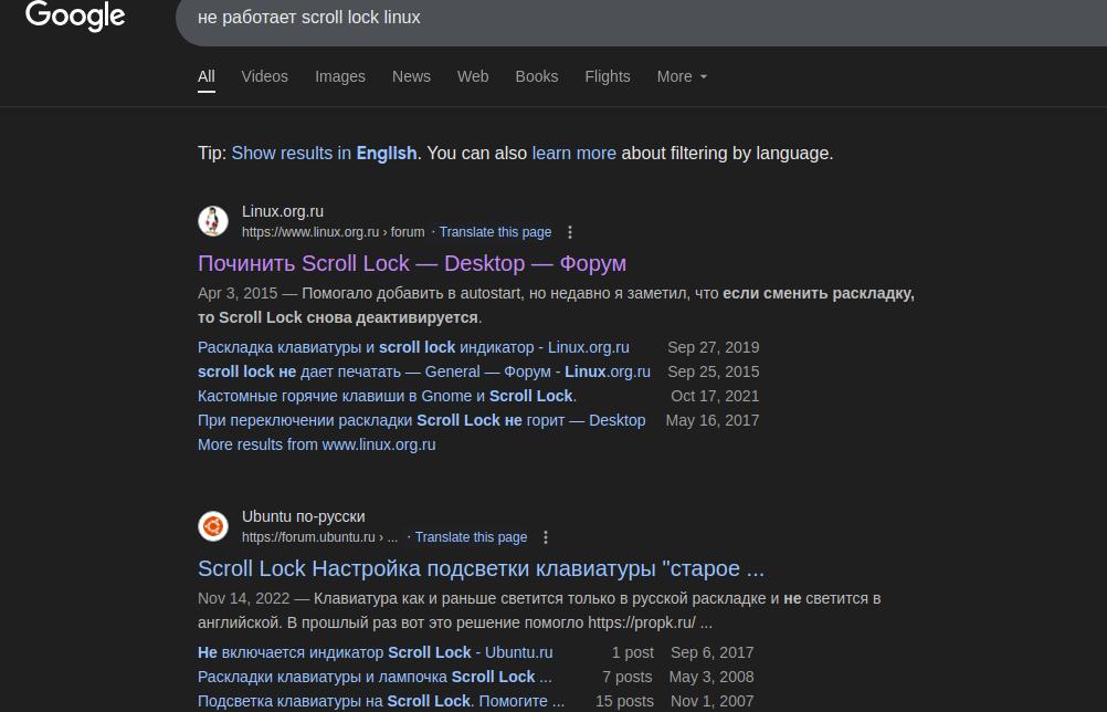 Впрочем, проблема неправильно работающего Scroll Lock в Linux весьма типичная.