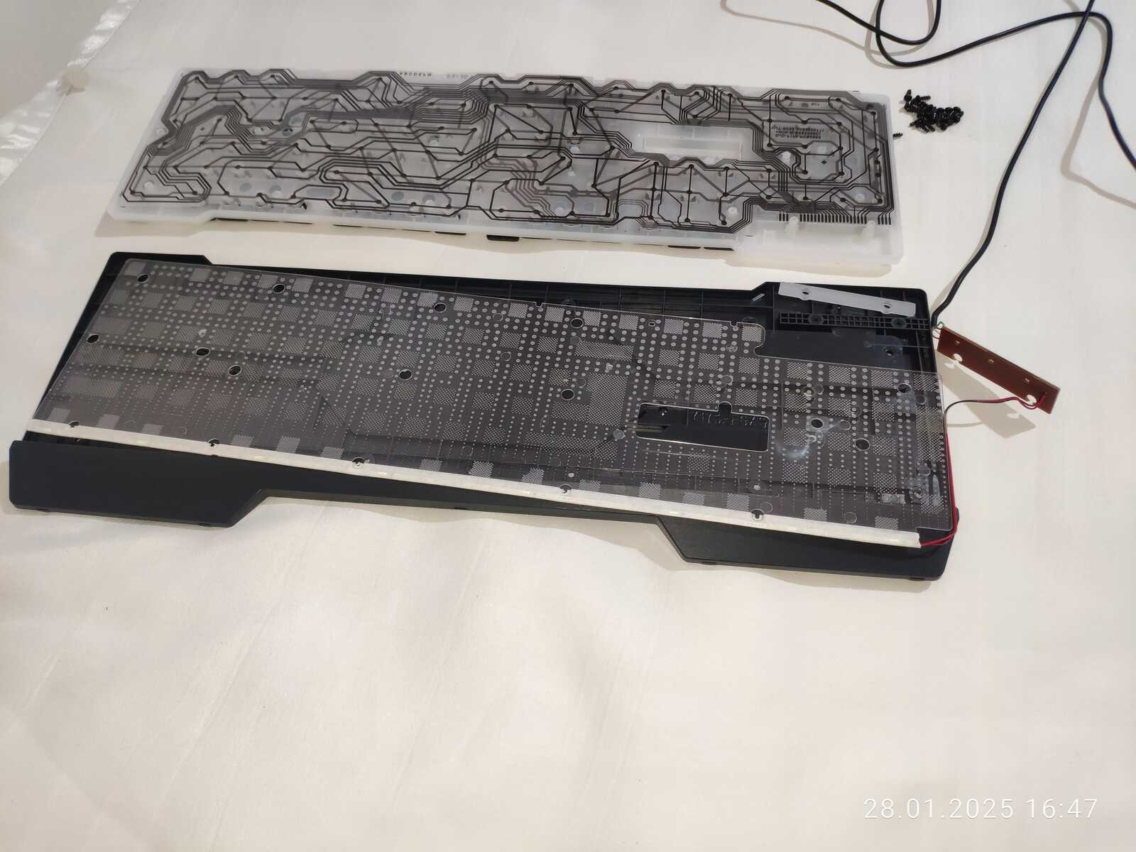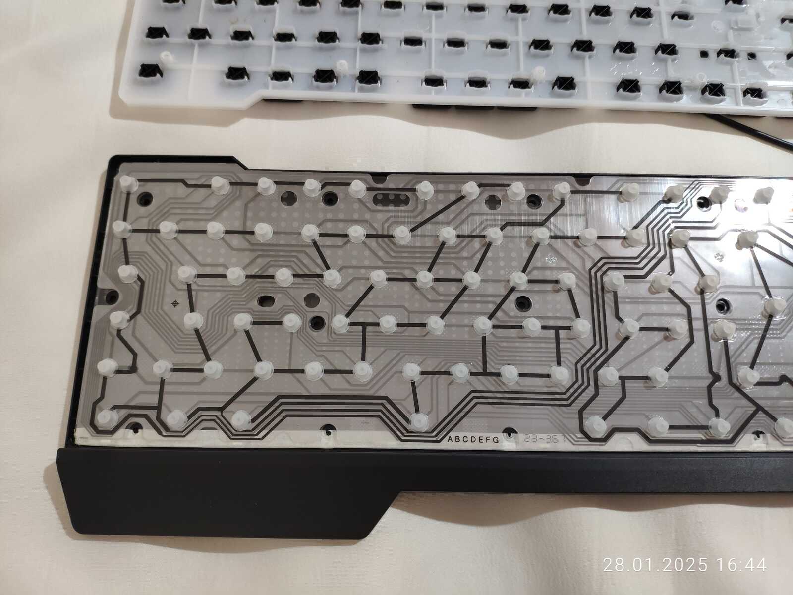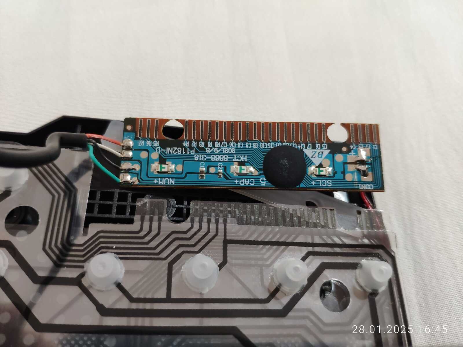 Итого 3 красных светодиода, 2 зелёных и 3 синих, это вся подсветка, причём клавиши не просвечиваются, ведь маркировка просто нанесена краской на чёрный пластик и покрыта базовым слоем лака, который довольно быстро сотрётся при активном использовании.