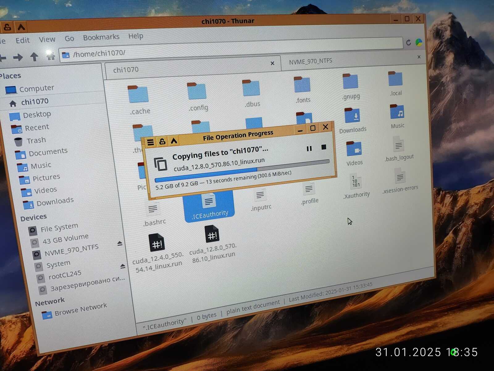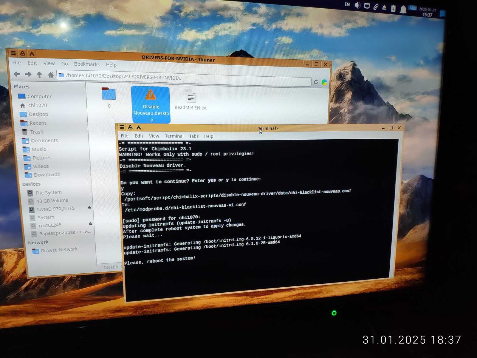 Копирую полноценные официальные драйверы NVIDIA в домашний каталог и отключаю линуксоидный Nouveau с помощью своего же скрипта, без этого шага не выйдет установить адекватный драйвер видеокарты, конфликты модулей, все дела, это вам не Windows.