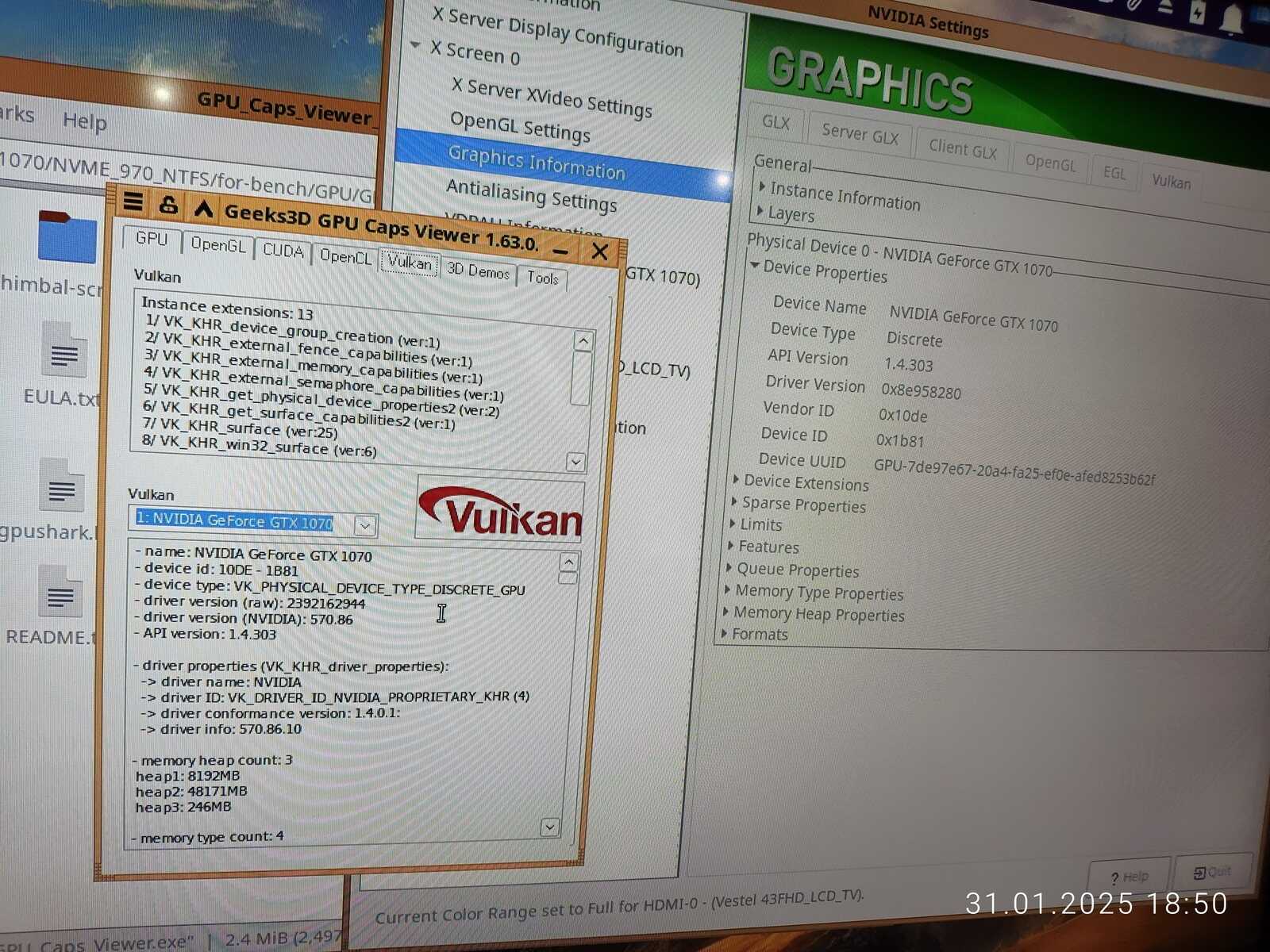 Может установка драйвера NVIDIA в Linux и не так проста, как в среде Windows, но в отличие от вечно кривого и несостоятельного AMD - у зелёных хотя бы есть нормальные драйверы, и всё работает как положено даже со старой GeForce GTX 1070, установил кстати драйвер версии 570.86.10, там и Vulkan API уже подтянули до версии 1.4.303, даже для моей старой видеокарты, это вам не вечно недоразвитое AMD, что уже в 2023 году кинули обладателей видеокарт RX Vega / RX 500 с Vulkan старой версии 1.3.260.