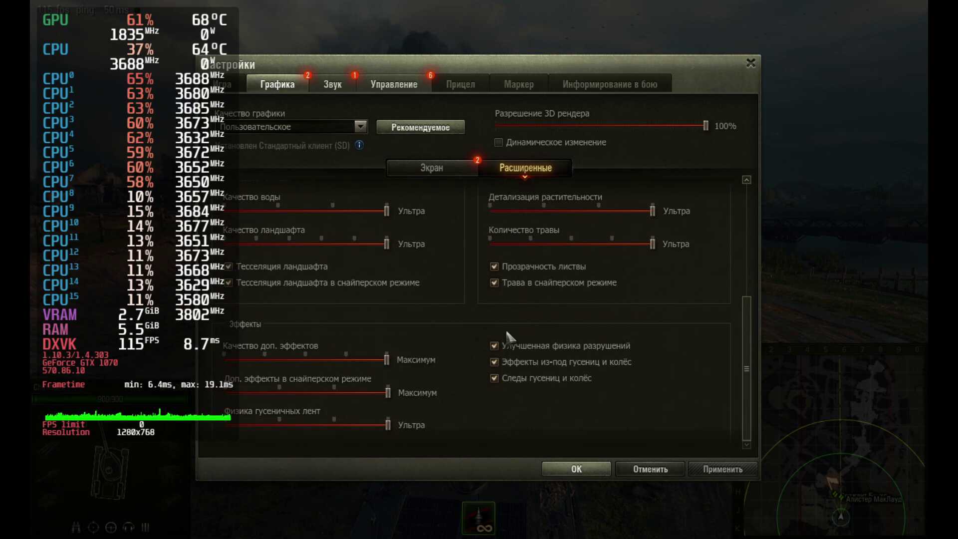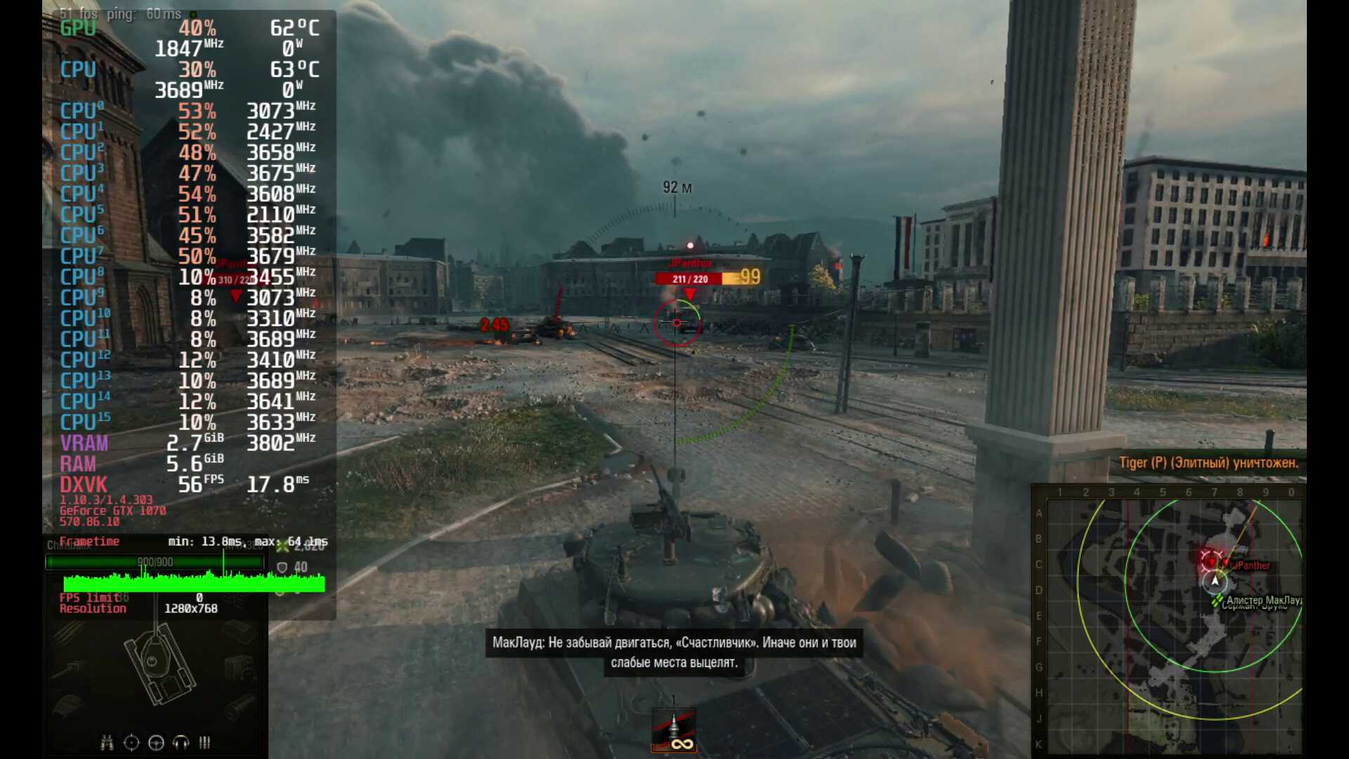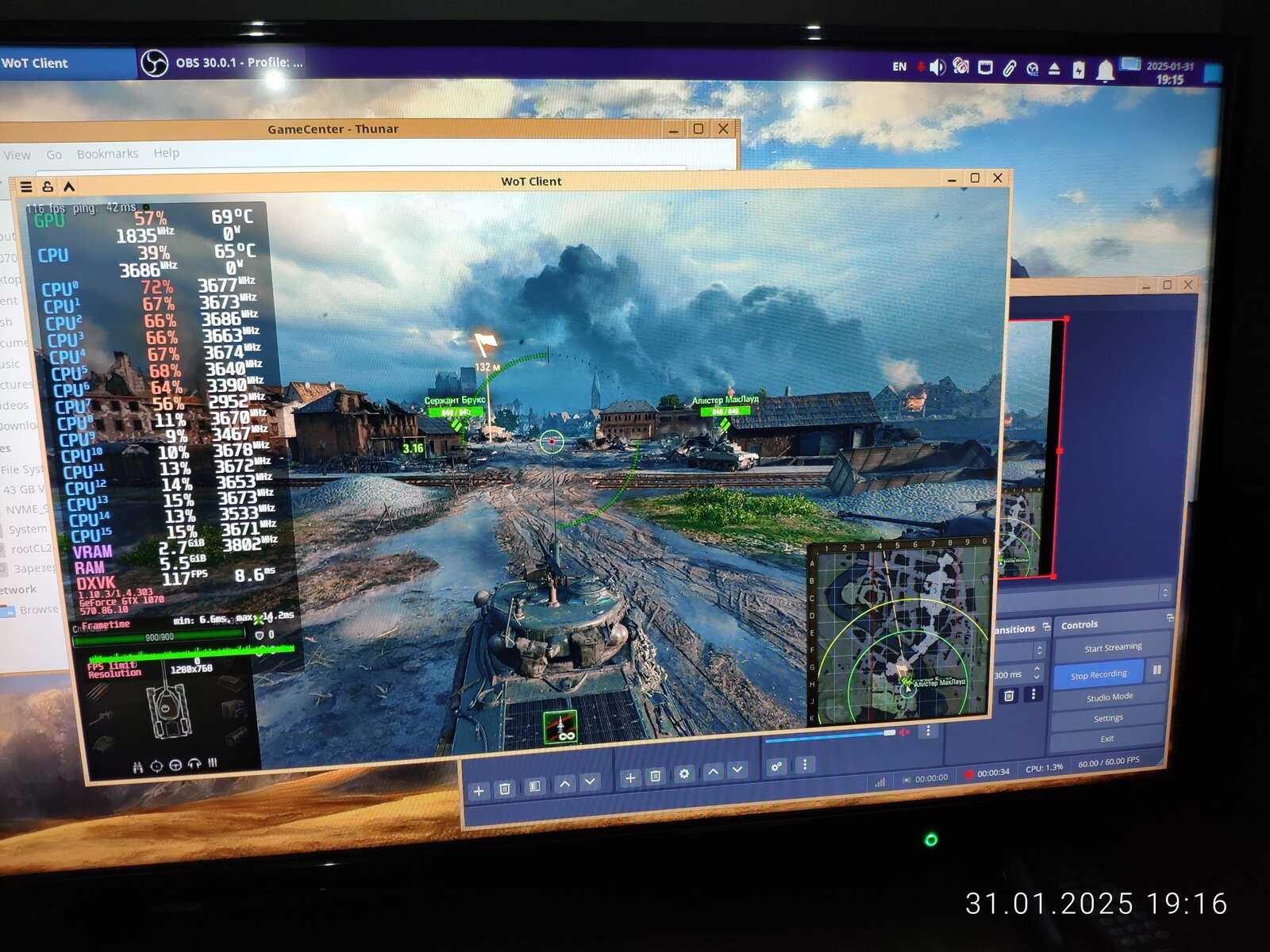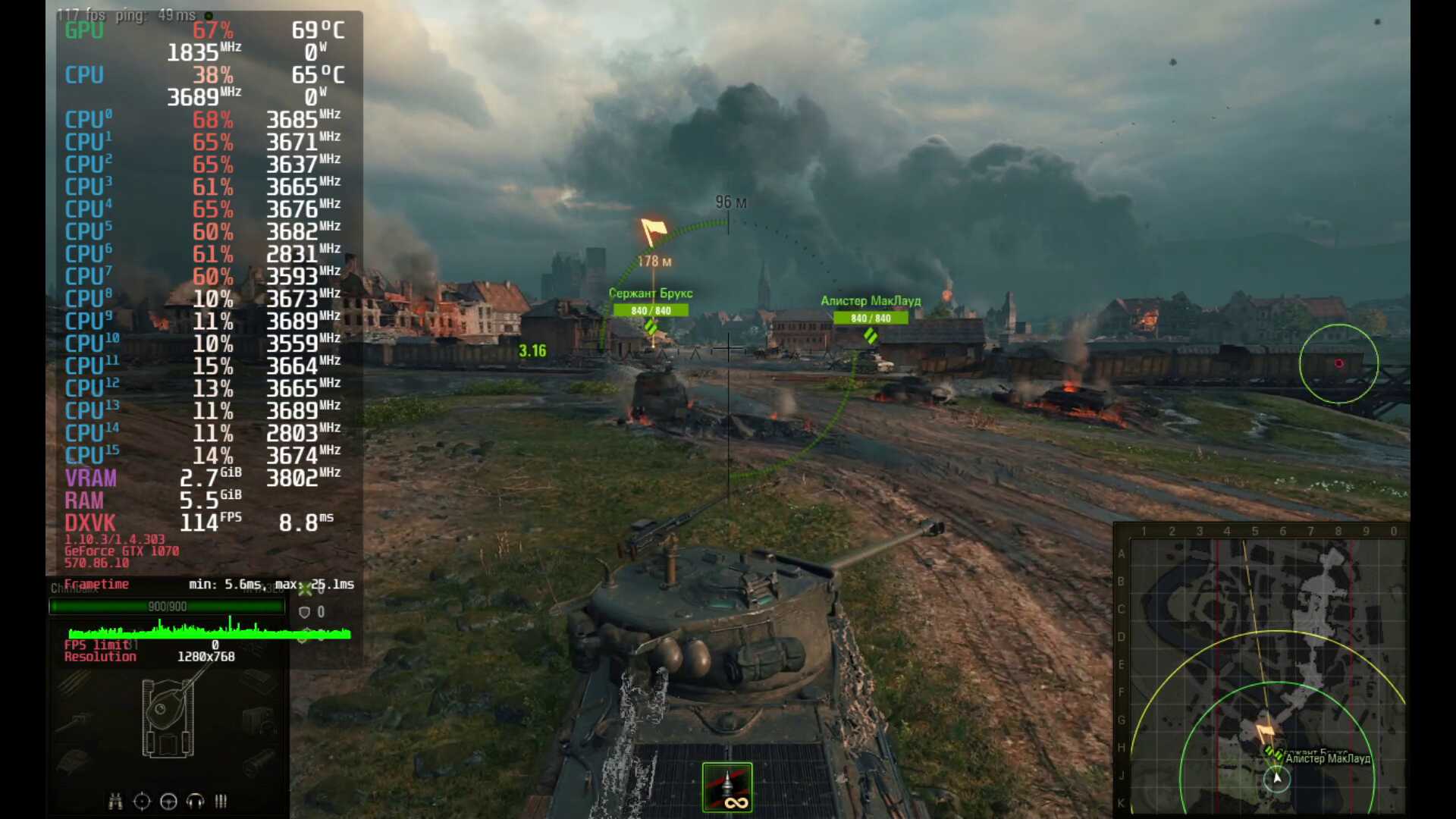 Копирую World of Tanks с помощью внешнего NVMe SSD, настраиваю Mangohud оверлей, и запускаю игру, что вы думаете, с NVIDIA GeForce GTX 1070 я получил такие же зависания, как и с AMD Radeon RX 5600M? Конечно нет, игра работает гораздо лучше, и это притом, что в ПК установлен гораздо более слабый процессор, да ещё и с отключенным XFR Boost!