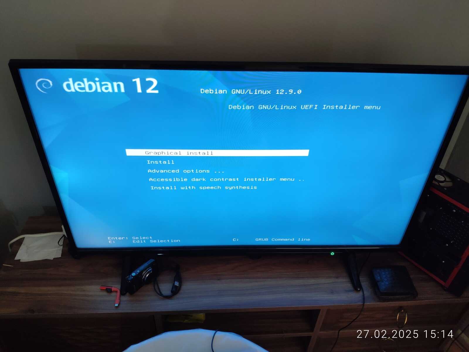 Теперь же пришло время протестировать Debian 12, выяснить, пригоден ли он для нормального использования, или всё будет как обычно... Впрочем, загрузочное меню тут уже более красочное, чем у всяких Ubuntu, но среди вариантов есть только установка, просто проверить не выйдет, ну да ладно, всё равно ведь собирался устанавливать.