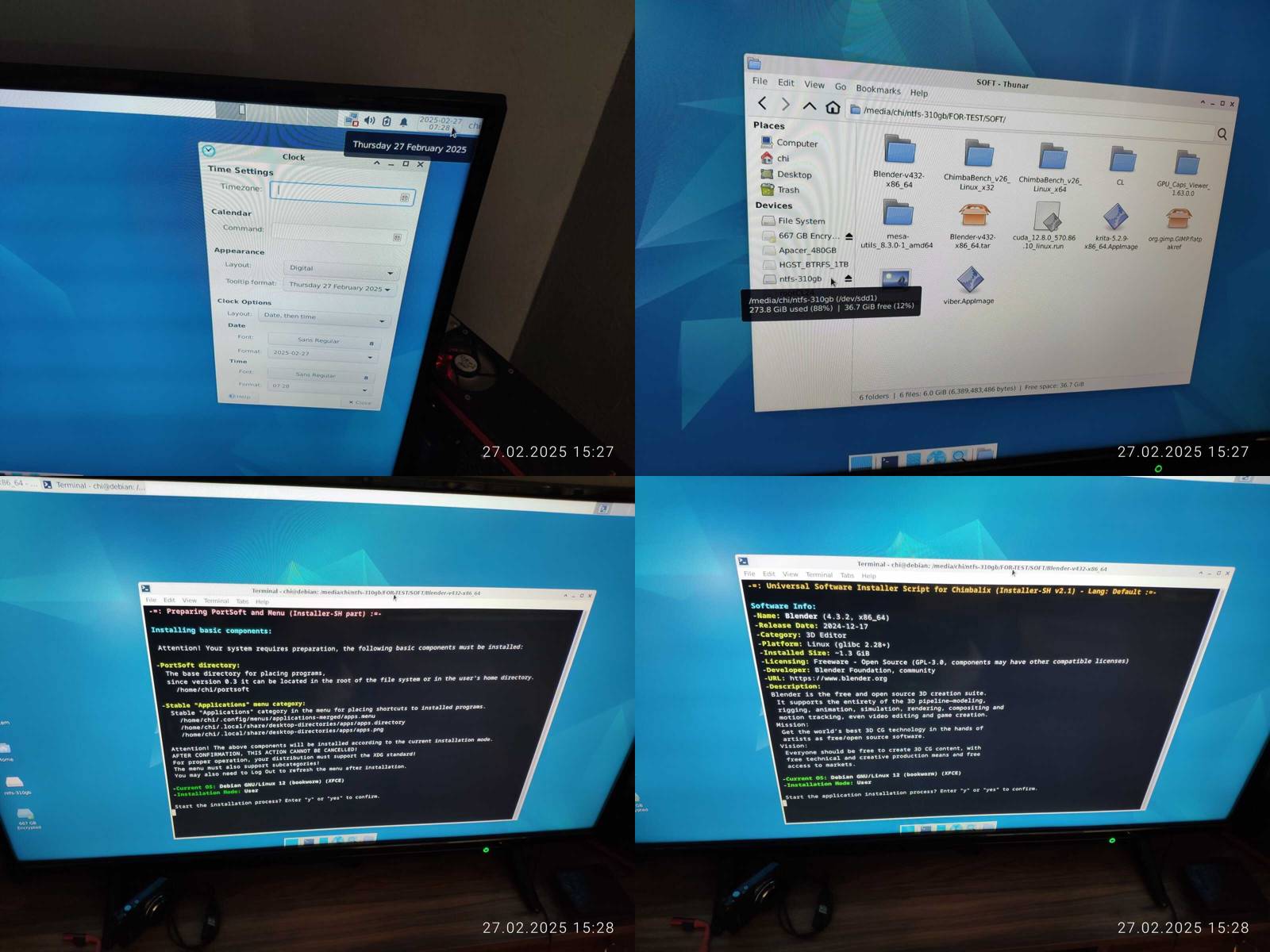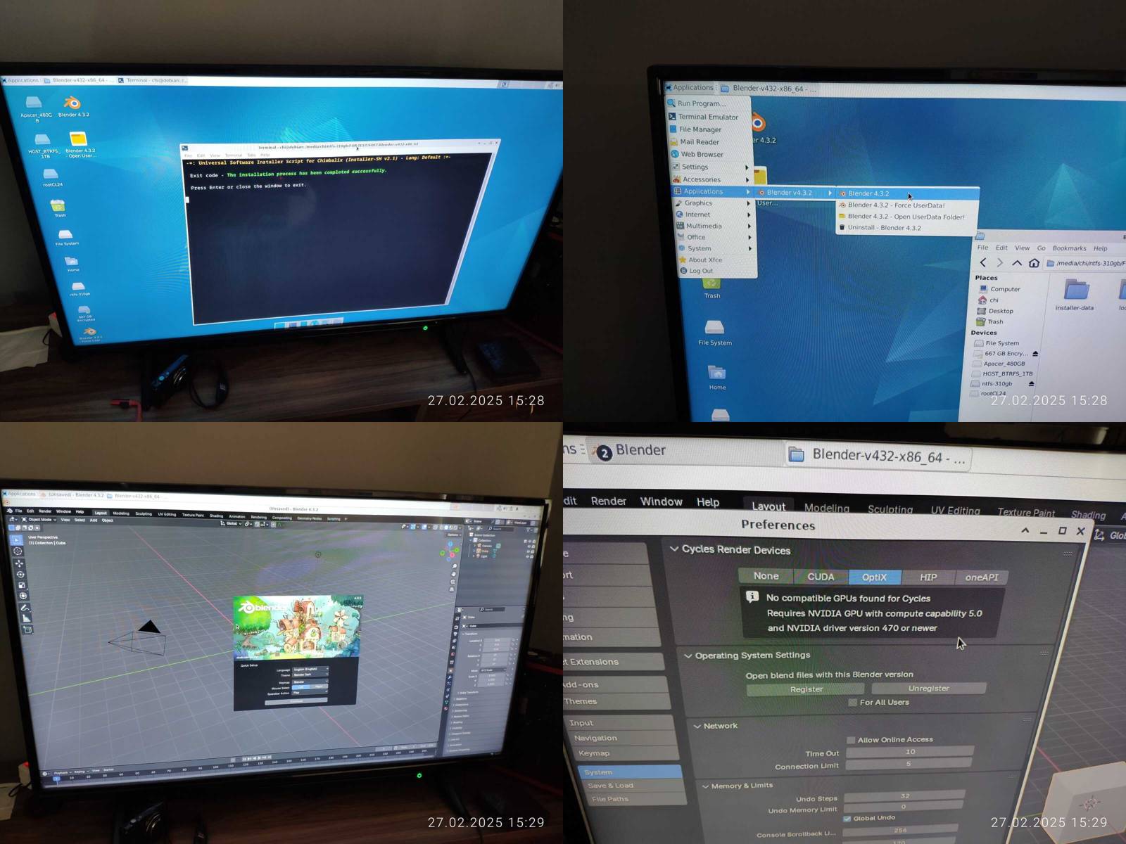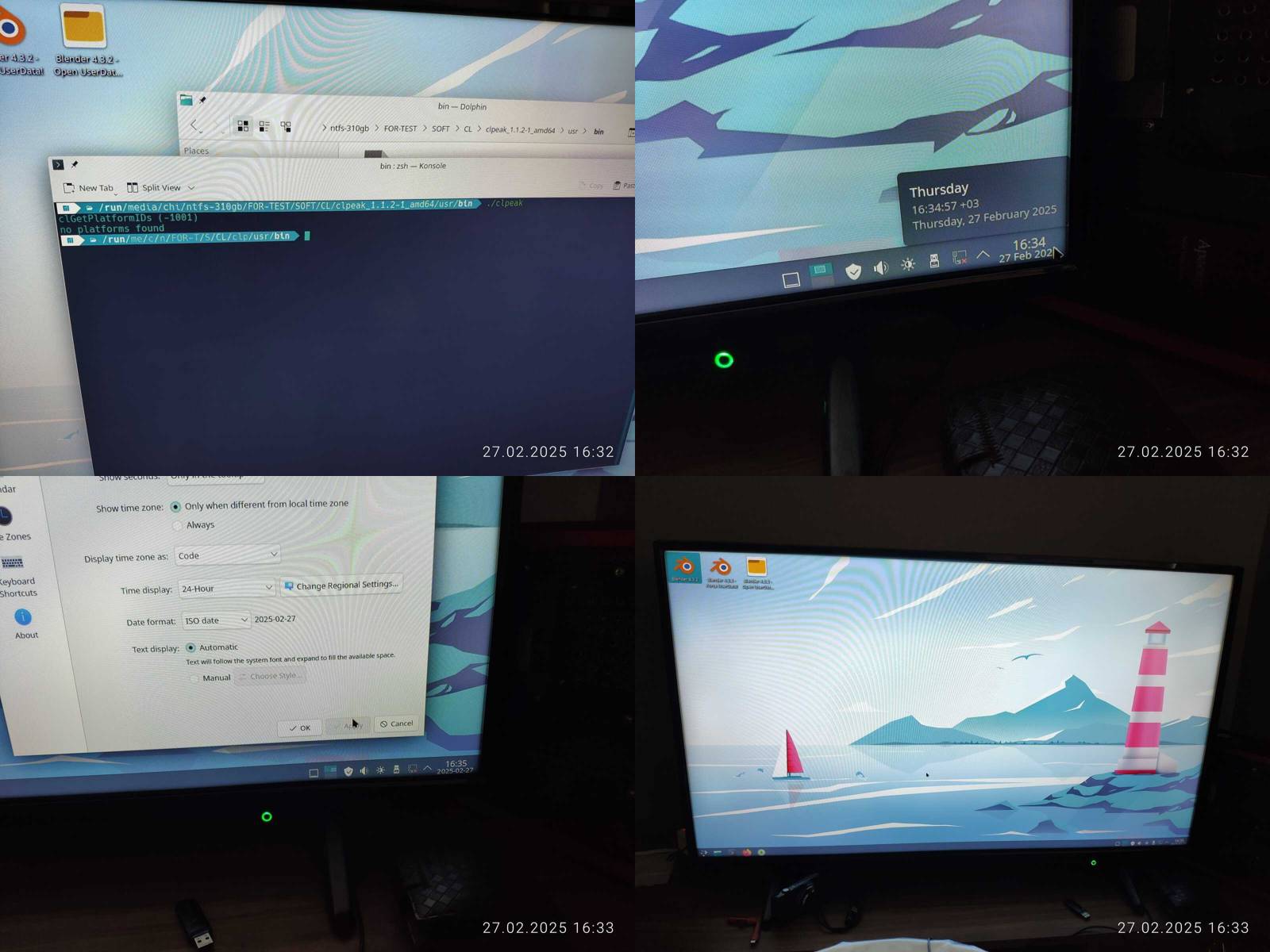 Отлично, Blender работает, но опять же, OpenCL не работает, и это печально, с форматом даты и времени проблем не нашёл, хотя меню приложений не поддерживает вложенные категории, что конечно же минус.