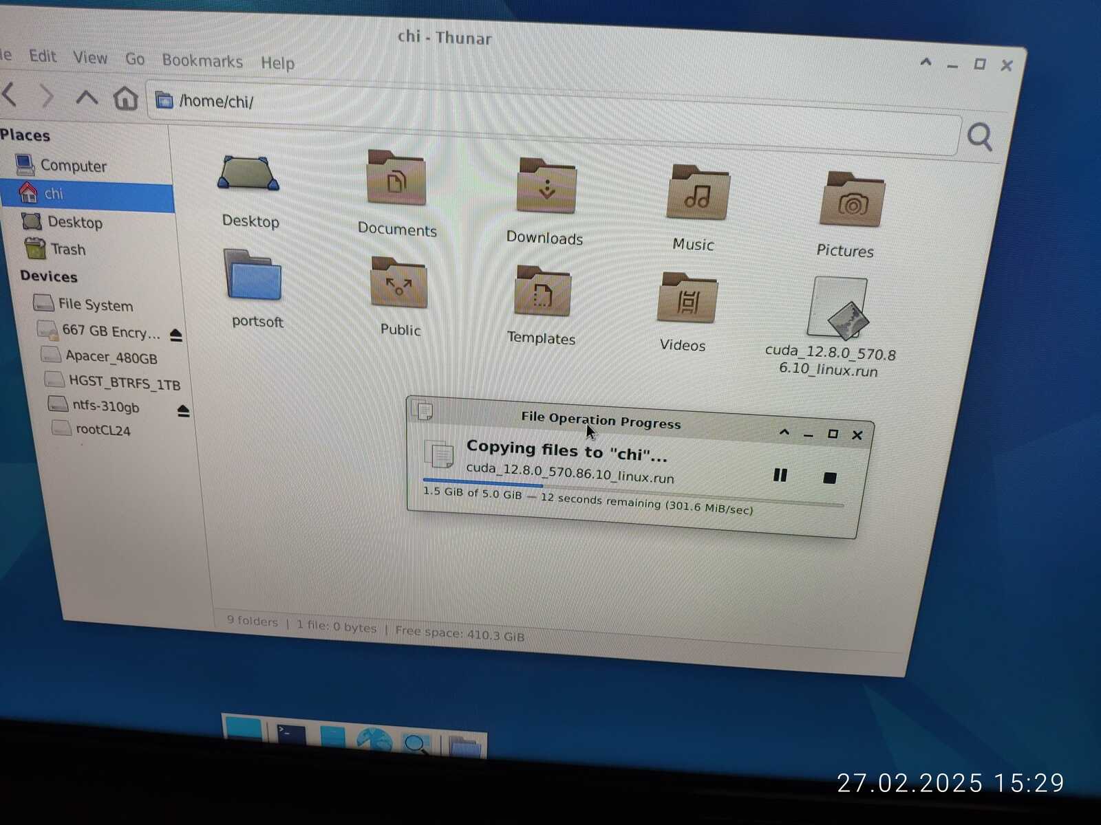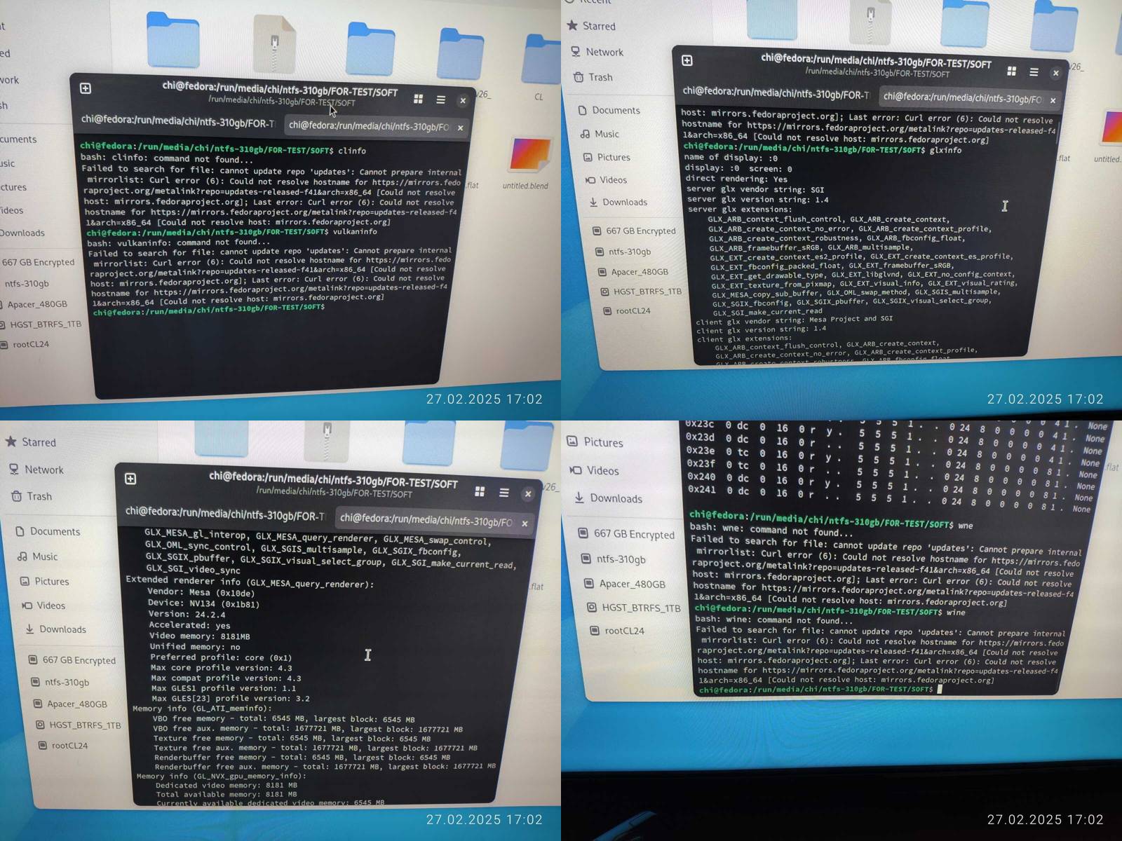 Пока копируется автономный установочный пакет драйвера NVIDIA CUDA, я проверяю наличие базовых информационных команд vulkaninfo, glxinfo и clinfo, ничего нет, как и wine, печально..