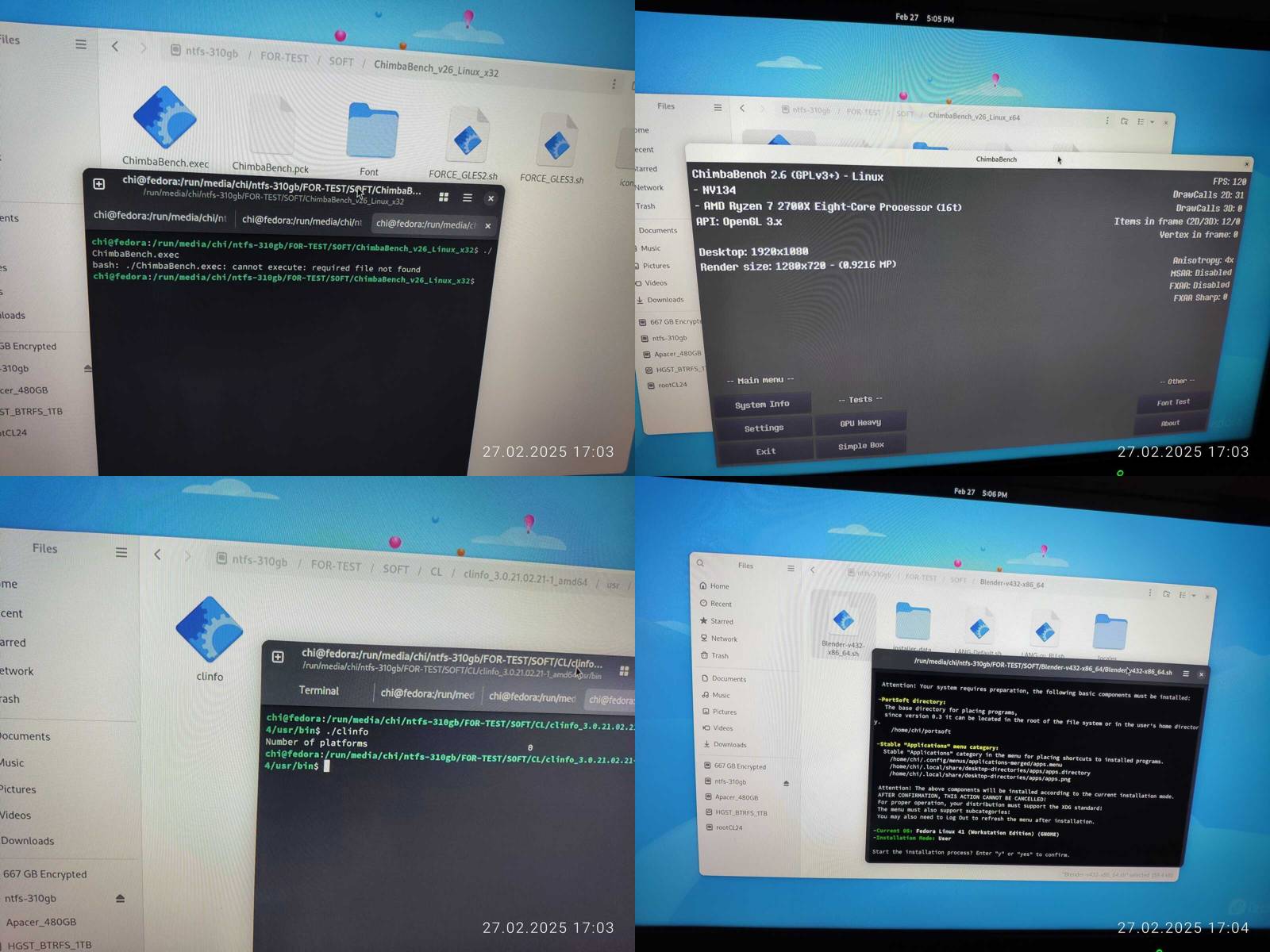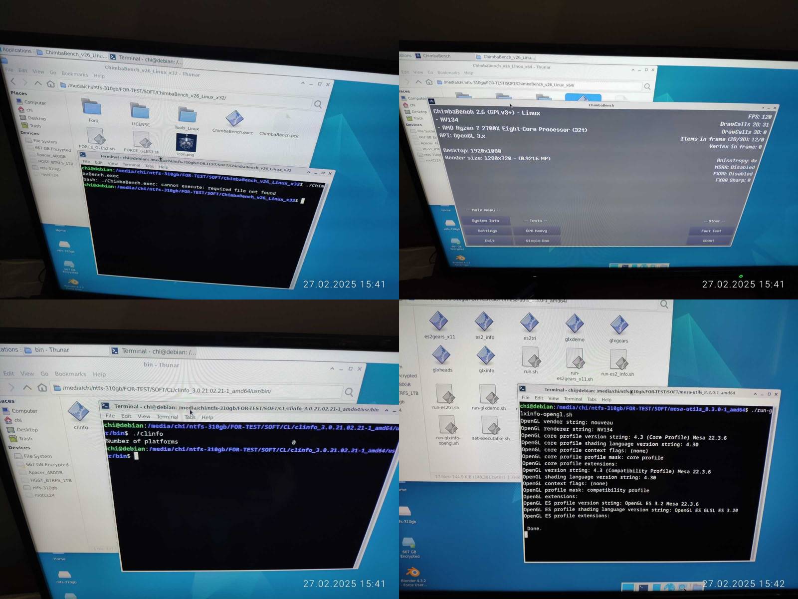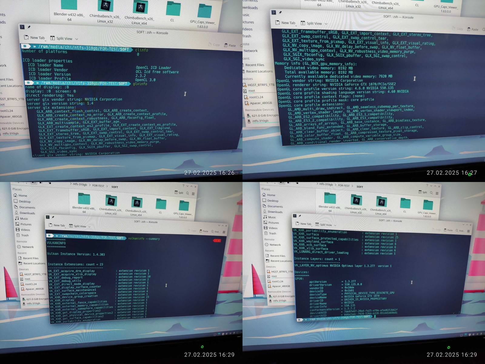 Ладно, подключаю внешний SSD и начинаю проверку, 32 битный ChimbaBench не запустился, сразу минус, но зато нашлась утилита clinfo, правда нет рабочих платформ OpenCL, так же работает glxinfo и vulkaninfo, прямо не отстаёт в этом плане от Chimbalix, и даже драйвер NVIDIA версии 550 установлен, но OpenCL при этом не работает, хм, опять кастрированный драйвер прибит гвоздями к линуксу, который наверняка нормально не обновить будет потом...