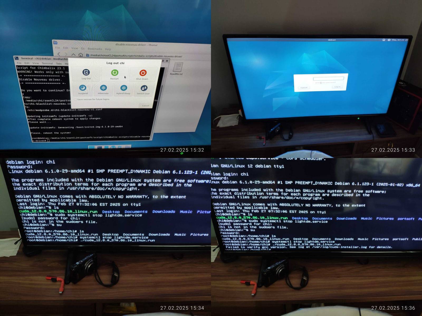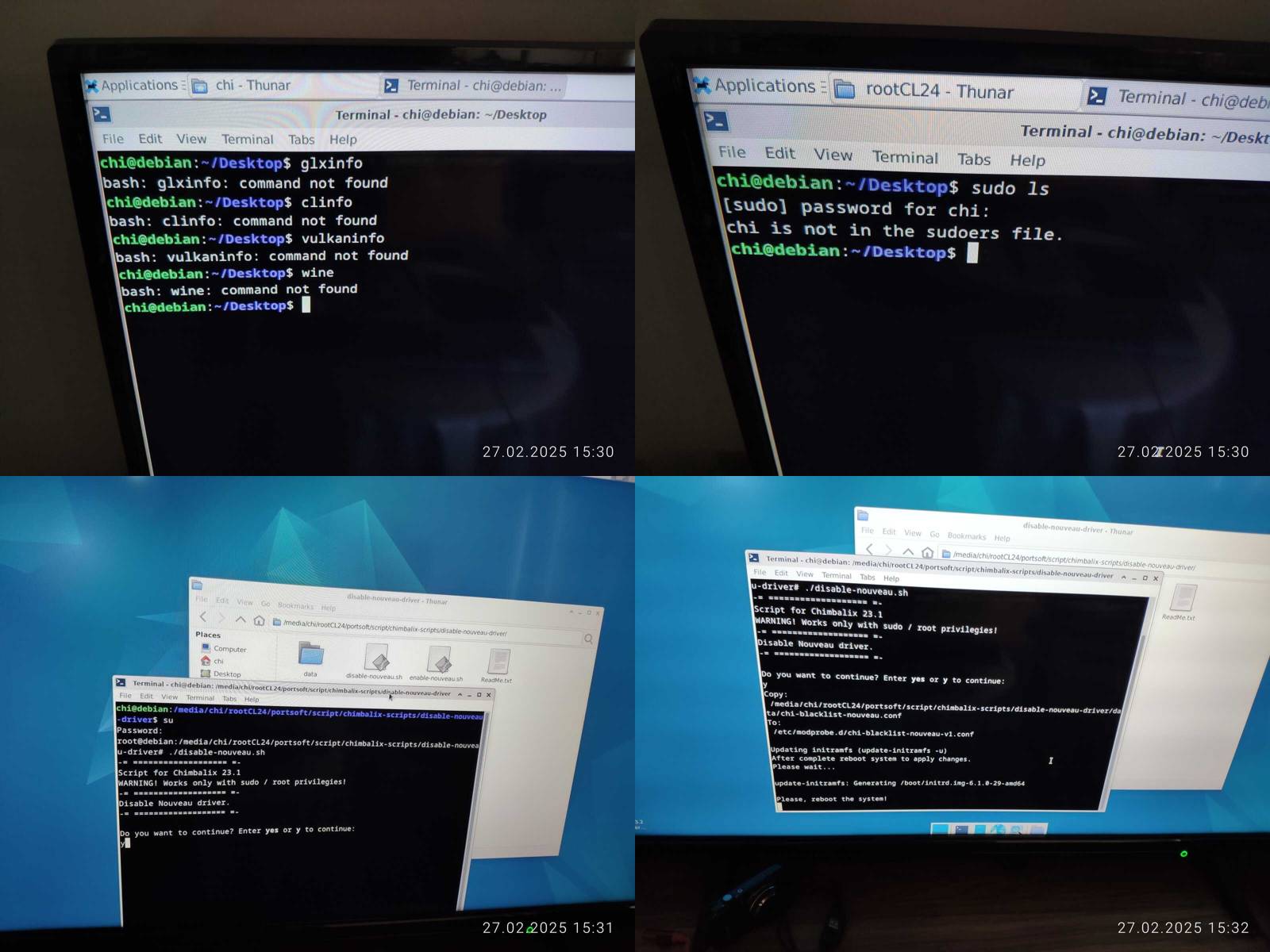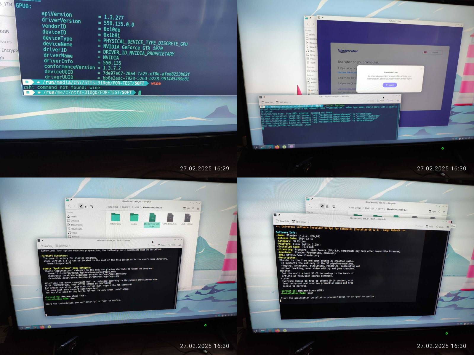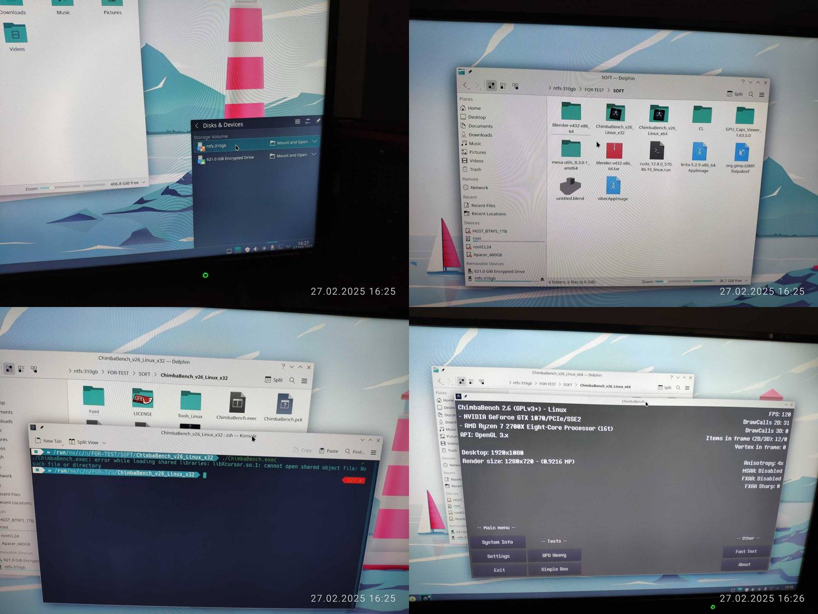 Ладно, подключаю внешний SSD и начинаю проверку, 32 битный ChimbaBench не запустился, сразу минус, но зато нашлась утилита clinfo, правда нет рабочих платформ OpenCL, так же работает glxinfo и vulkaninfo, прямо не отстаёт в этом плане от Chimbalix, и даже драйвер NVIDIA версии 550 установлен, но OpenCL при этом не работает, хм, опять кастрированный драйвер прибит гвоздями к линуксу, который наверняка нормально не обновить будет потом...