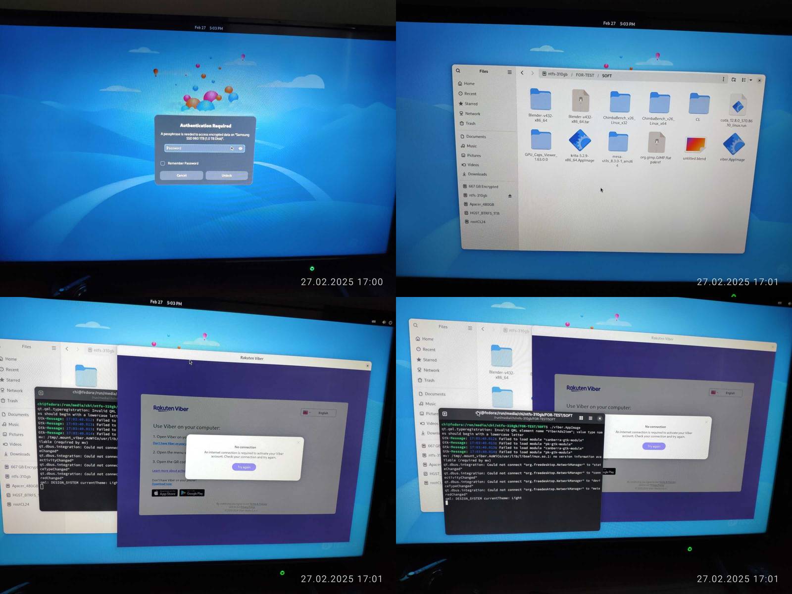 При подключении внешнего SSD Fedora попросила пароль для зашифрованного раздела, при этом автоматически не монтировала обычный раздел, неприятная и подозрительная назойливость, ну а в проводнике каталоги и файлы разбросаны абы как, наперекосяк, точно издеваются надо мной, пользователем, минус в копилку без лишних слов за такое, я хочу пользоваться системой, а не ковырять каждую дырку в попытках исправить очевидные проблемы на ровном месте.