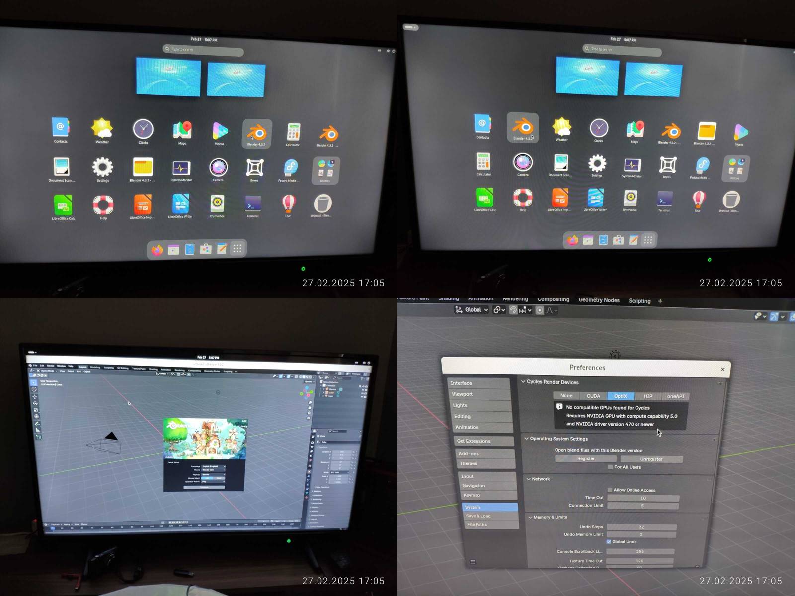 Устанавливаю Blender, меню приложений нормально не отработало, только после повторного входа в систему появились новые ярлыки, без вложенных категорий, еще и сортируются прямо на глазах, ох уж этот GNOME, ну а приложение работает, но без CUDA/OptiX, ибо Nouveau + Mesa3D вместо драйвера видеокарты.