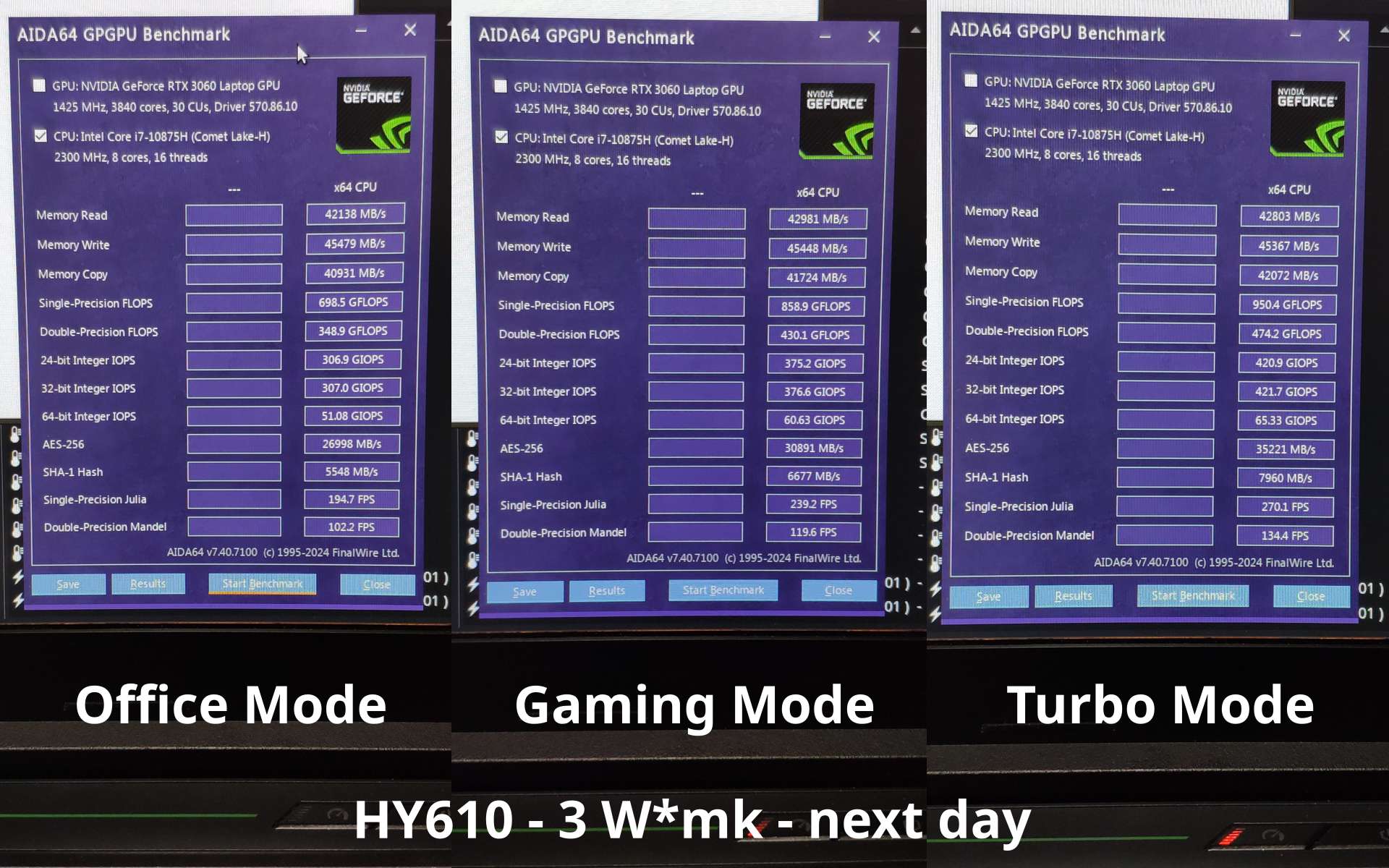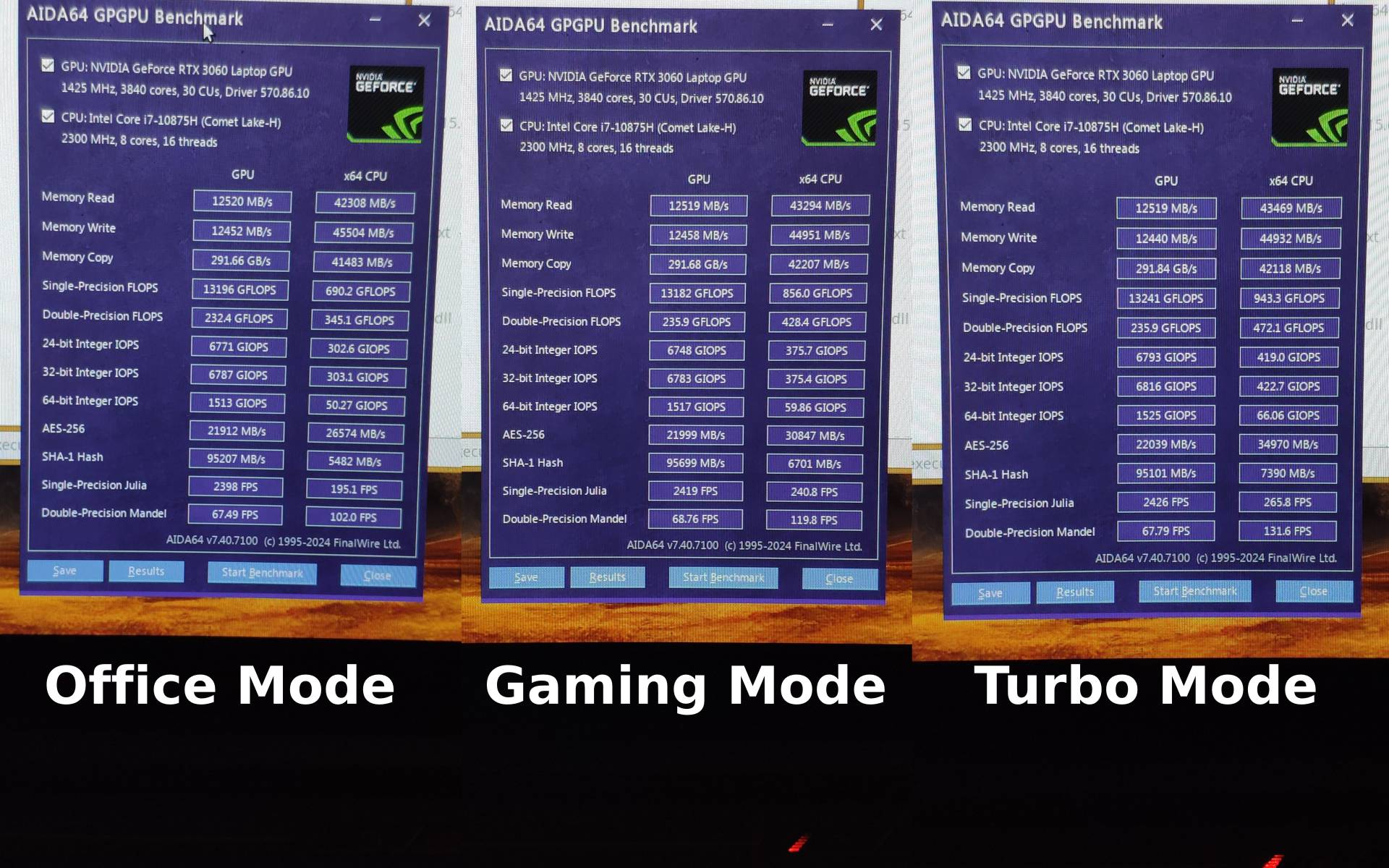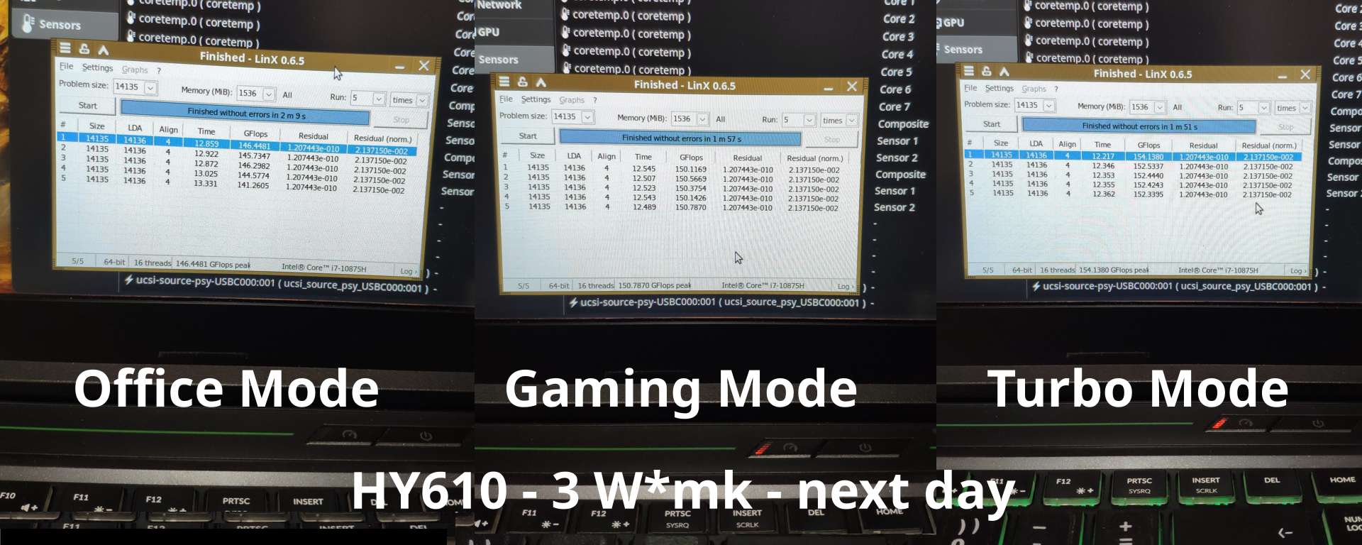 У ноутбука три режима работы, Office, Gaming и Turbo, во всех трёх режимах видеокарта работает при 80 Вт, ибо Linux вместо операционной системы, а вот процессор изменяет свои лимиты примерно до ~15 Вт, ~60 Вт и ~75 Вт в Turbo режиме соответственно, будут протестированы все три режима.