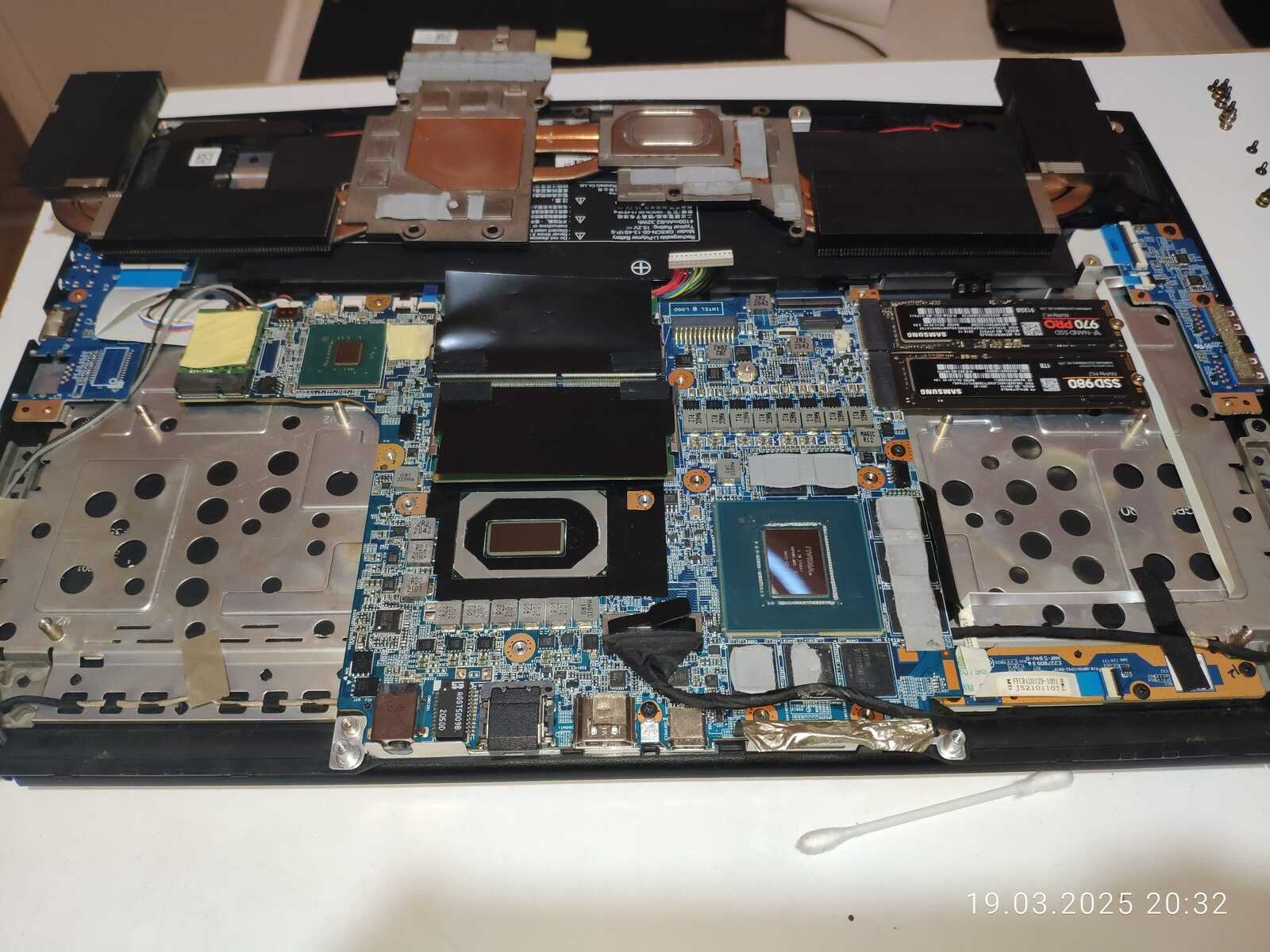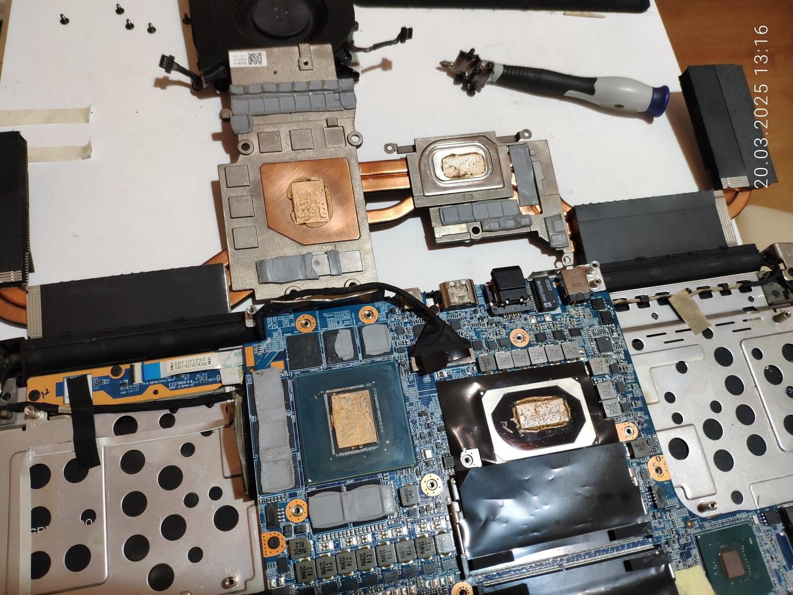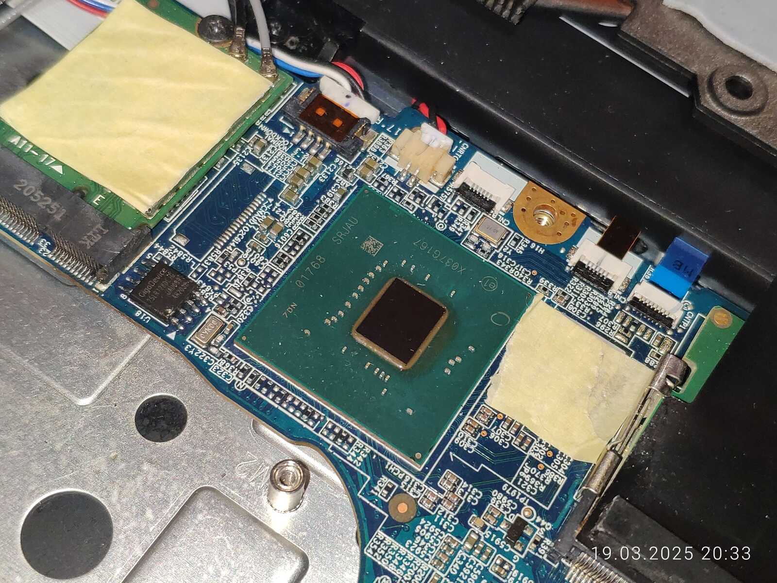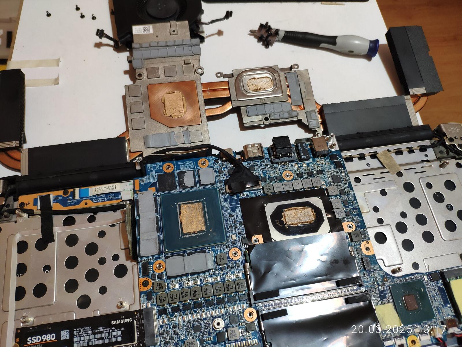 Ладно, расчехляем ноутбук, отключаем аккумулятор, снимаем систему охлаждения и приступаем к осмотру.